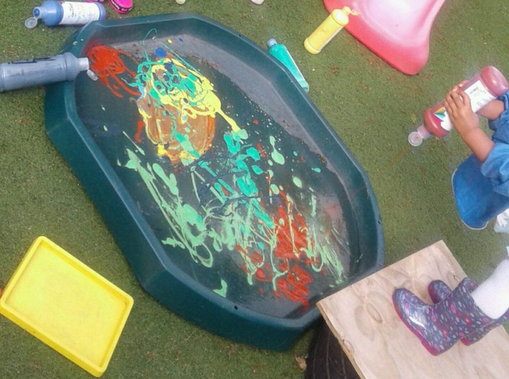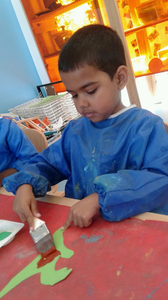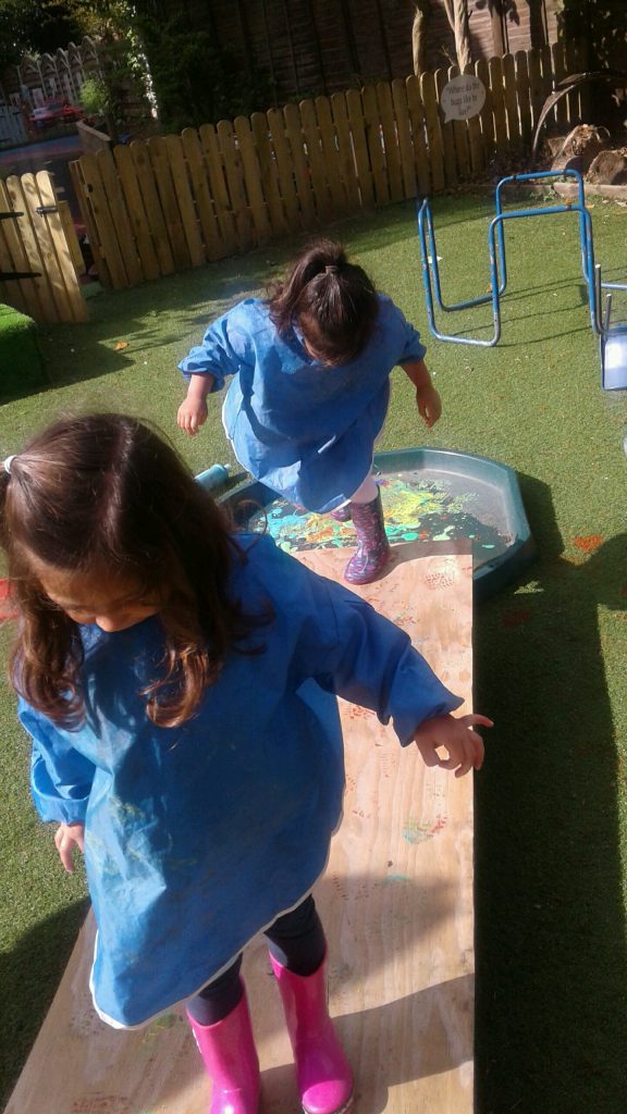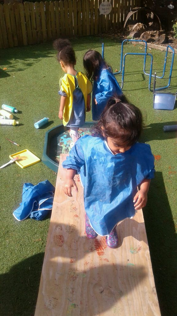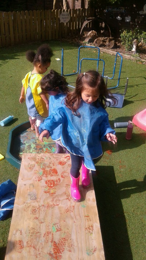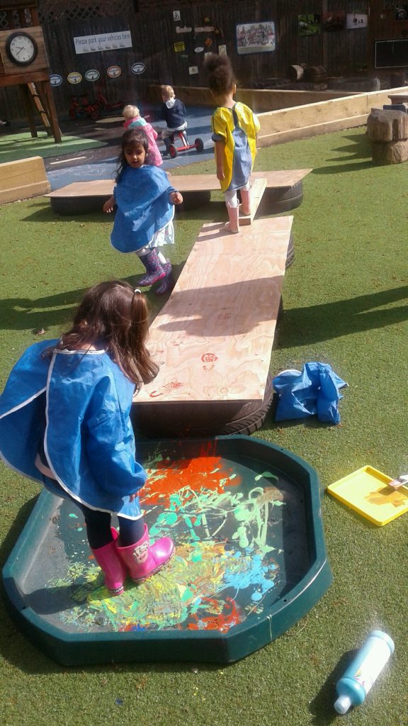 The children made their own dinosaur trail in the garden. They made it bright with the use of paints and observed how new colours were made when the paints were mixed together. The trail helped the children to develop a story line into their play as they set off on a dinosaur hunt. They stayed in character throughout their adventure.