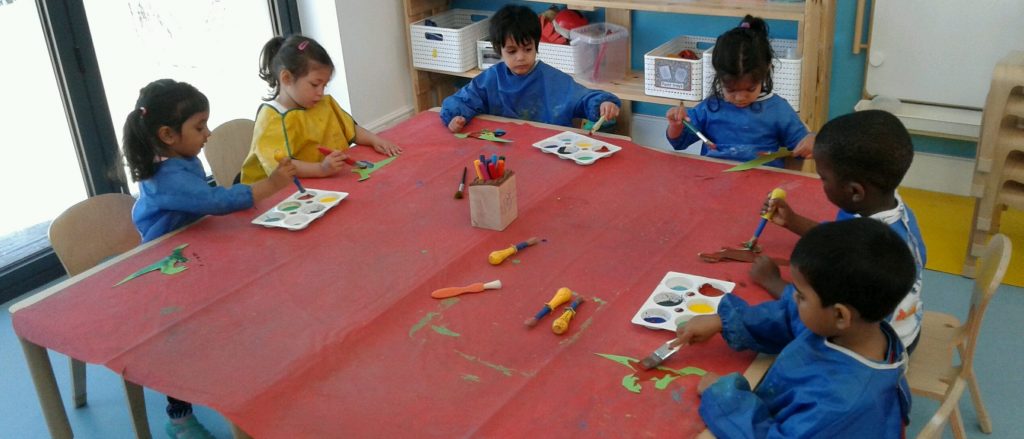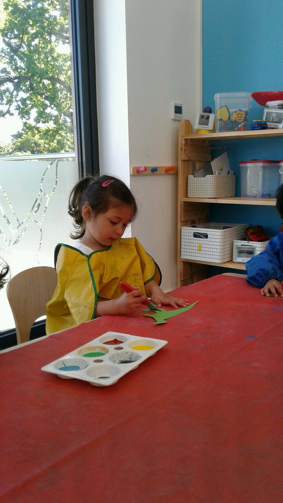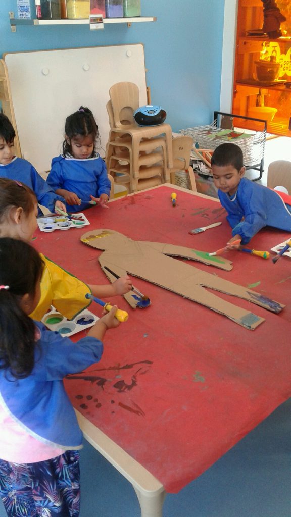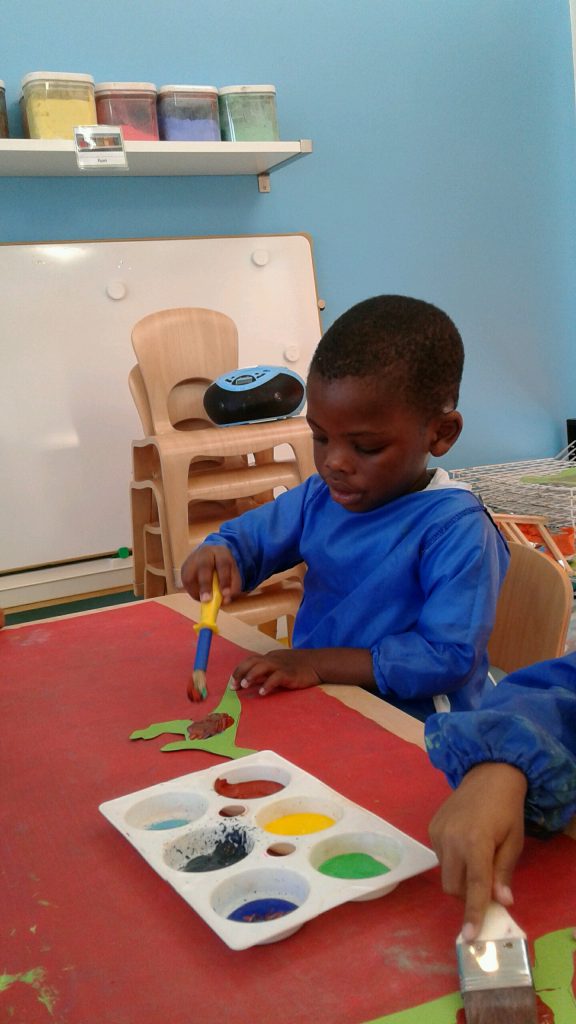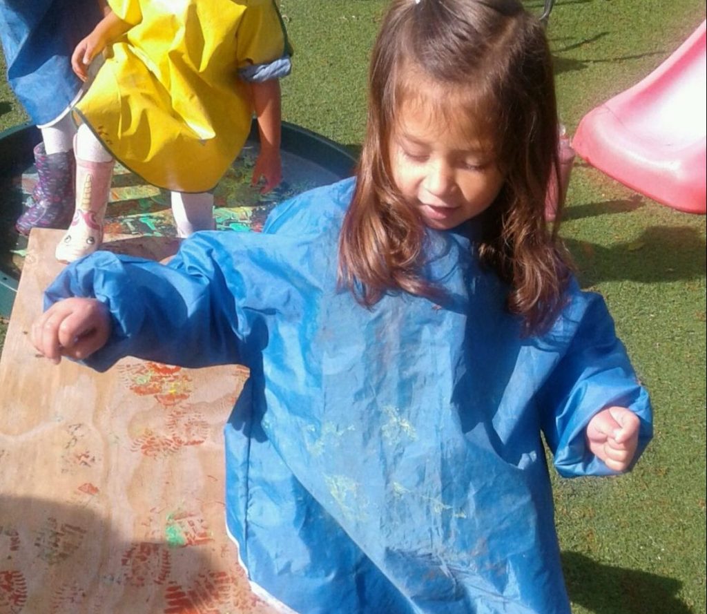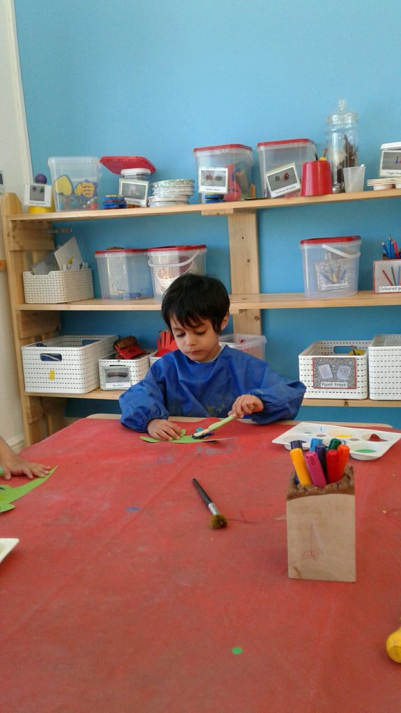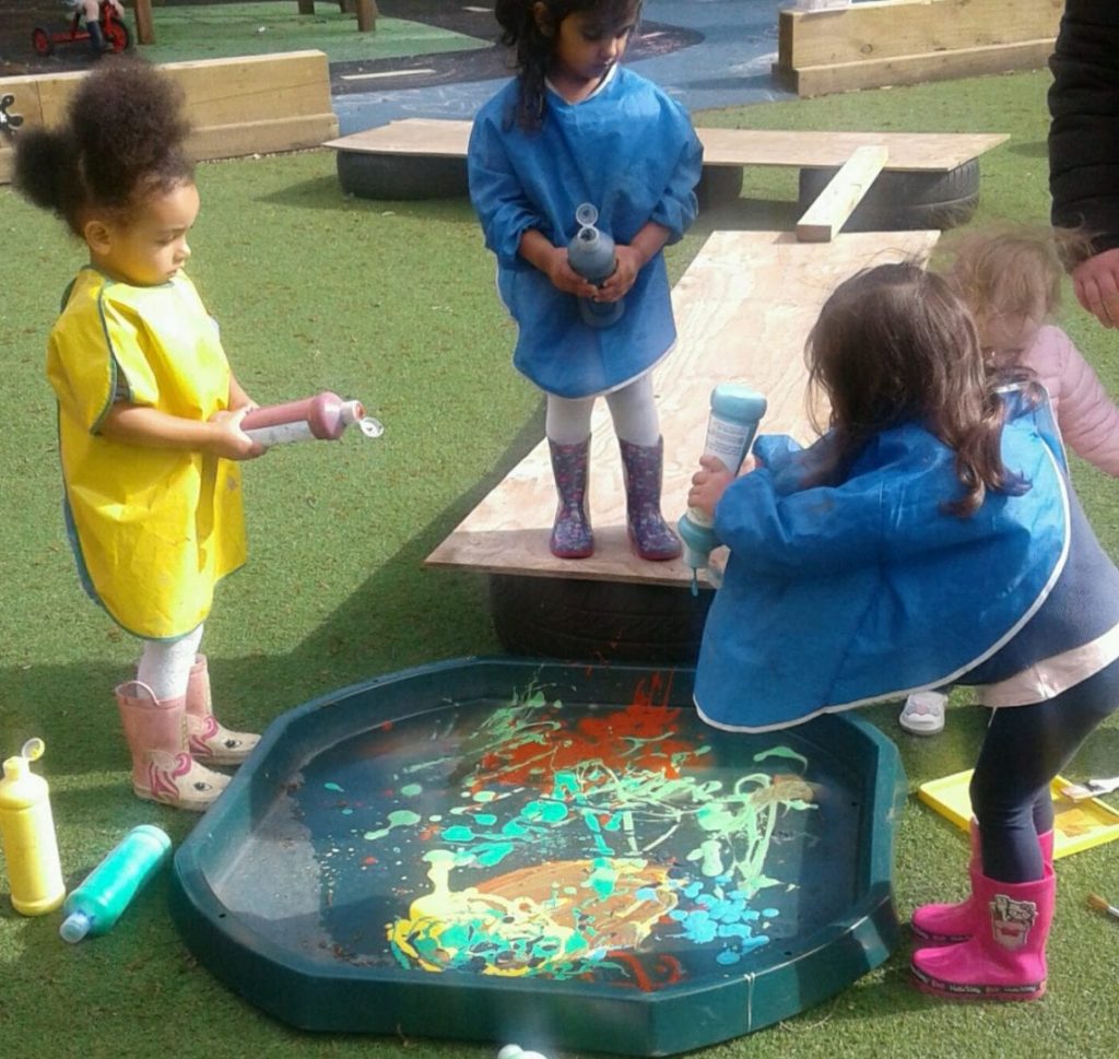 The children made their own dinosaur trail in the garden. They made it bright with the use of paints and observed how new colours were made when the paints were mixed together. The trail helped the children to develop a story line into their play as they set off on a dinosaur hunt. They stayed in character throughout their adventure.