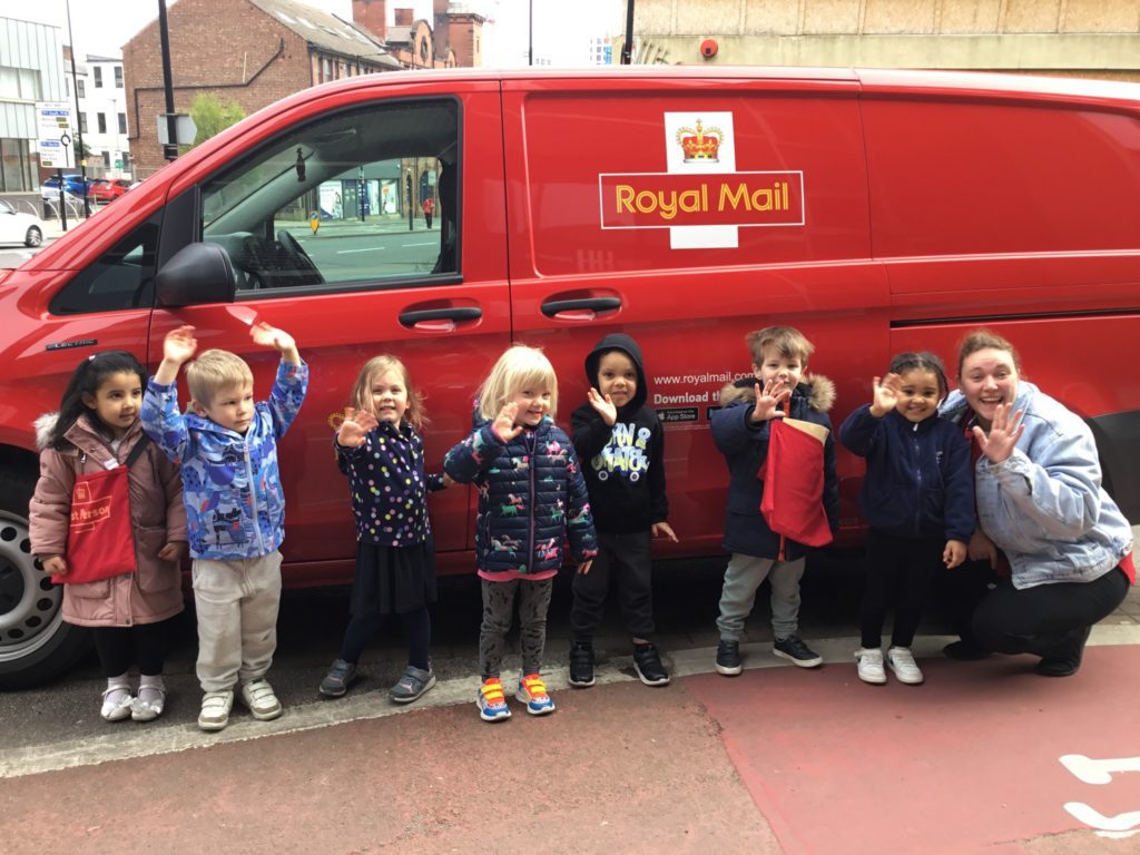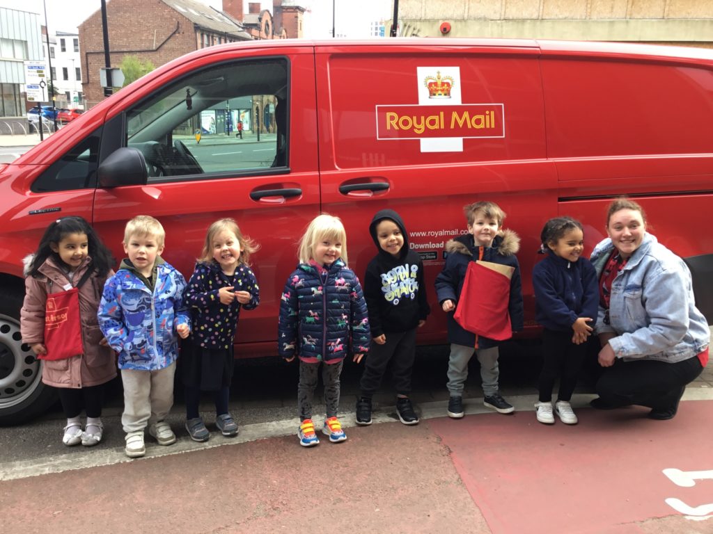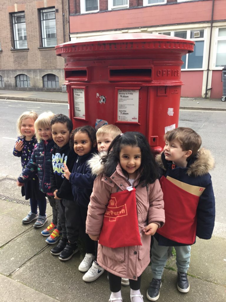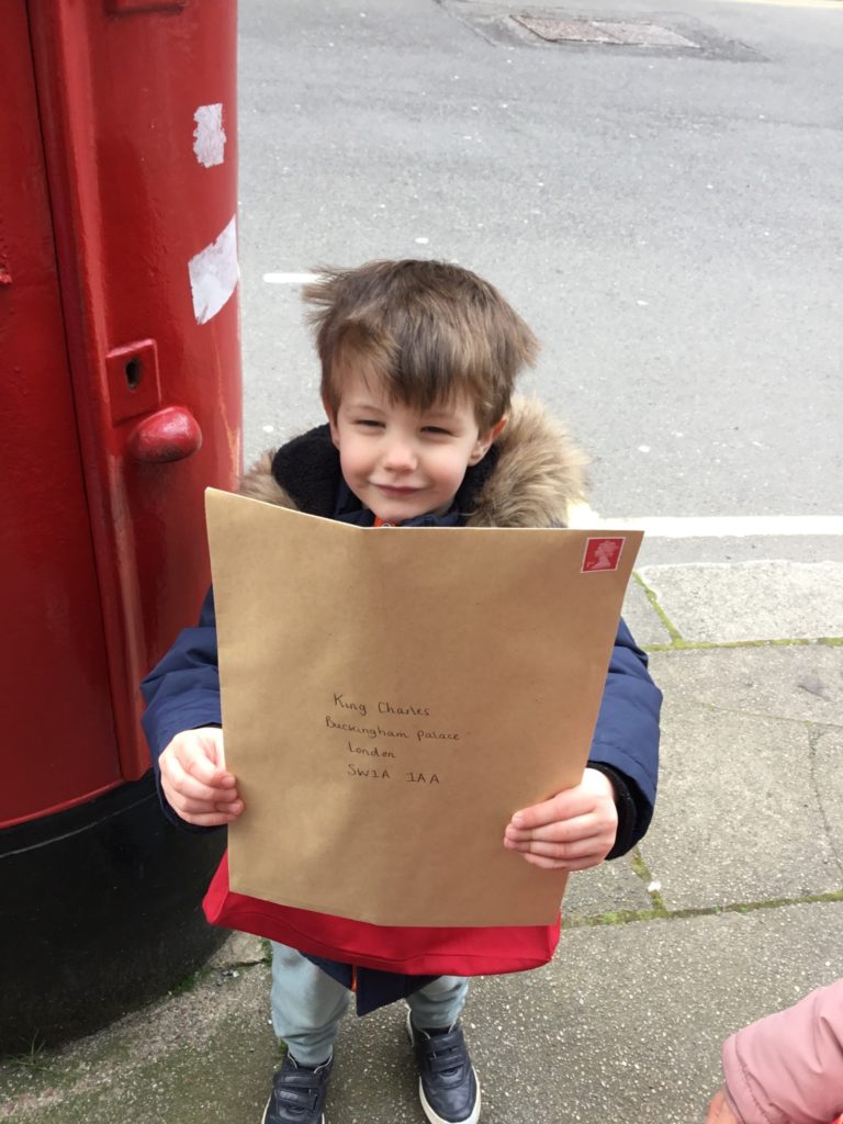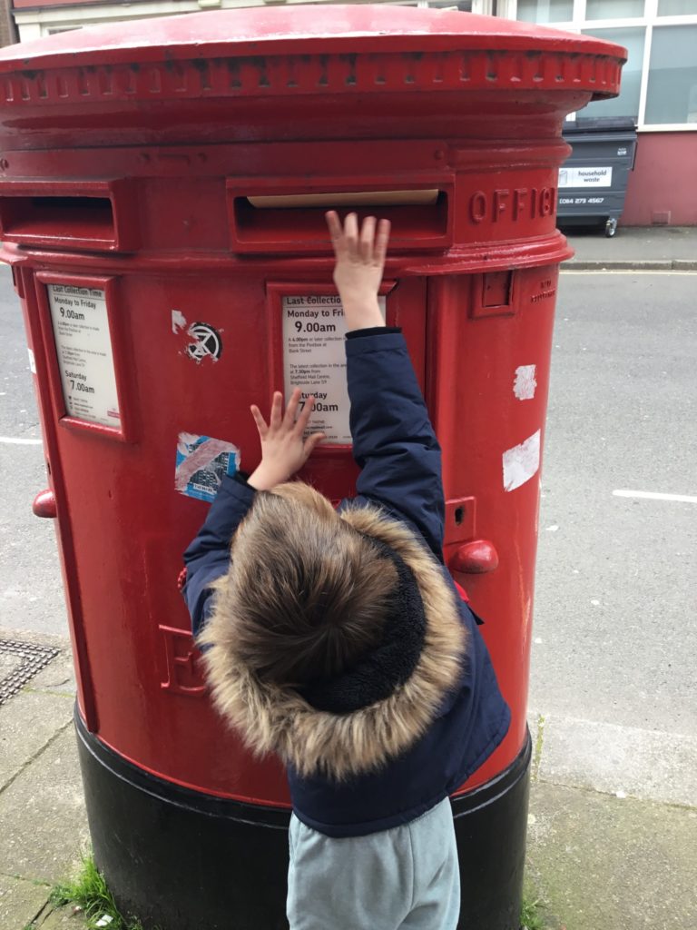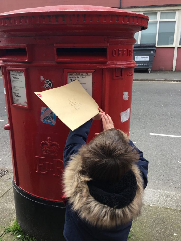 Having popped the letter and drawings into a big envelope, the children then had the task of taking it to the big red post box so it could make its way to Buckingham Palace.