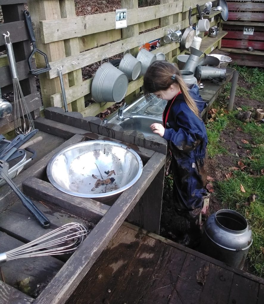 We used an assortment of containers to transfer the muddy water to the mud kitchen and back again. We stirred the mud and the water together and Imogen said, “I’m making soup.”