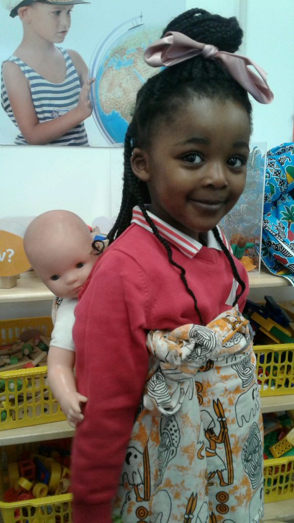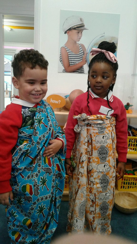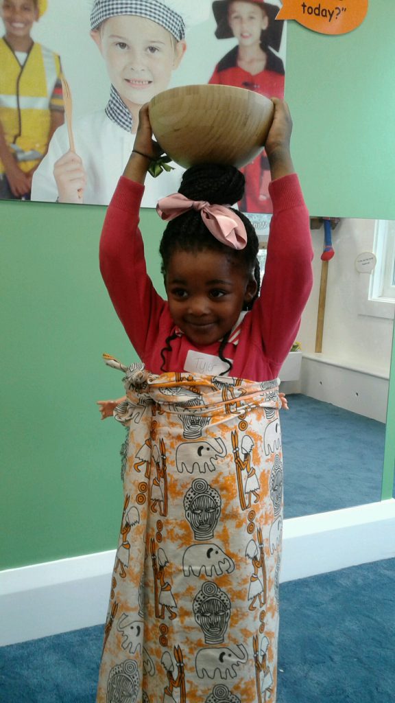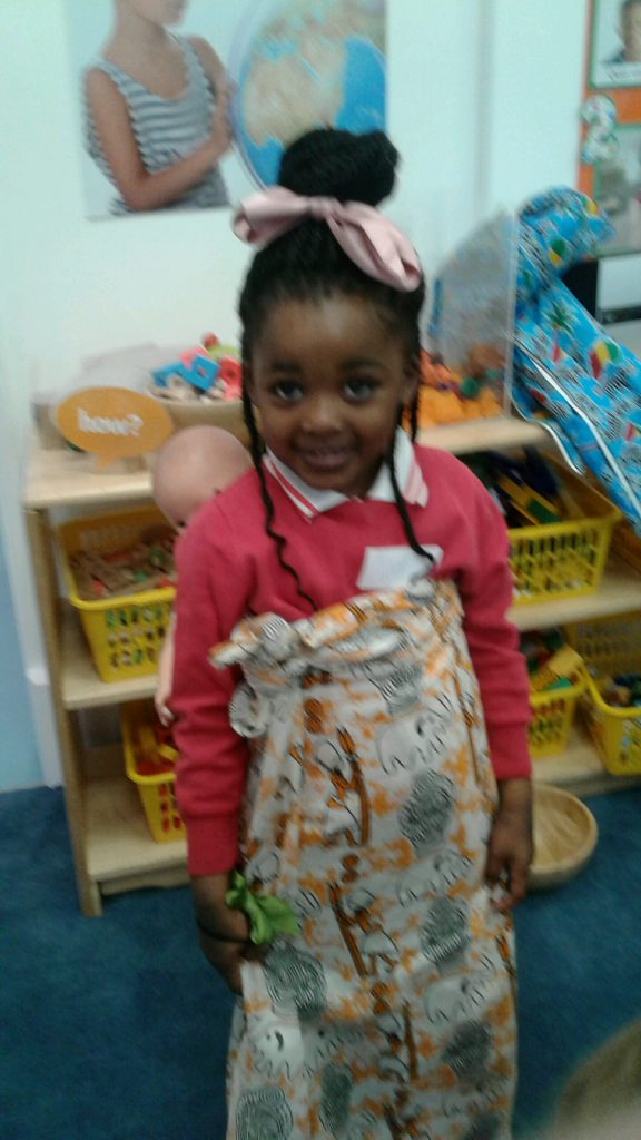 Bemma brought with her some beautiful fabrics from her hometown in Ghana and some of the children dressed up in traditional colourful robes, carrying bowls on their heads and babies who were tied to their backs.