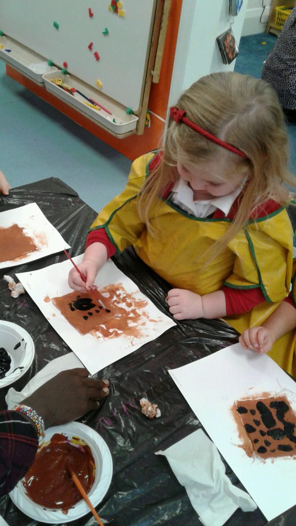 She also showed some children how to create ‘African mud painting’ where each child had a small piece of cloth which they decorated in typical African designs.
