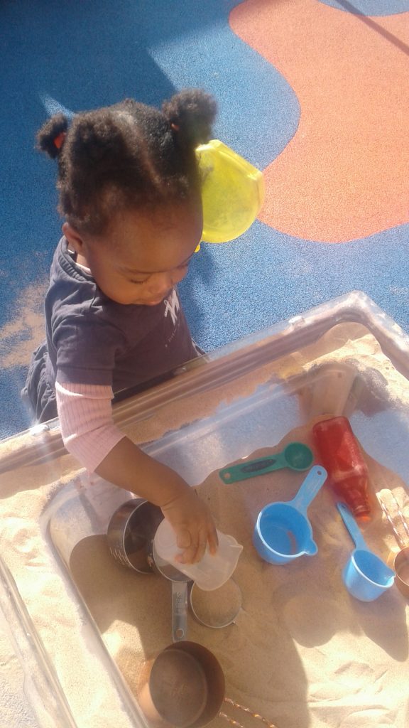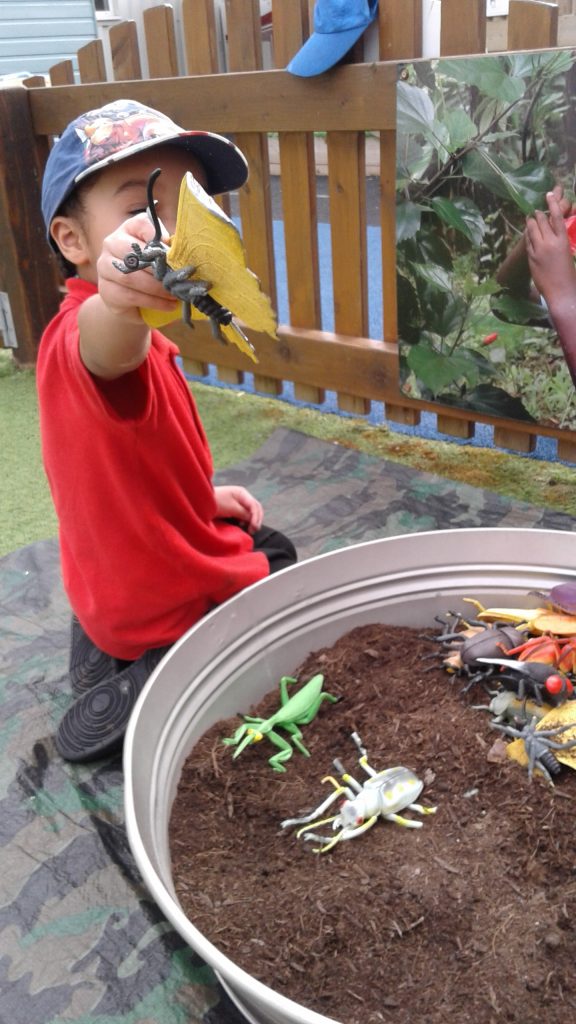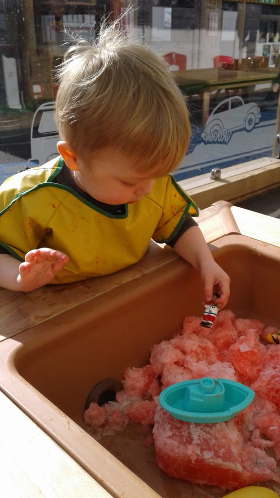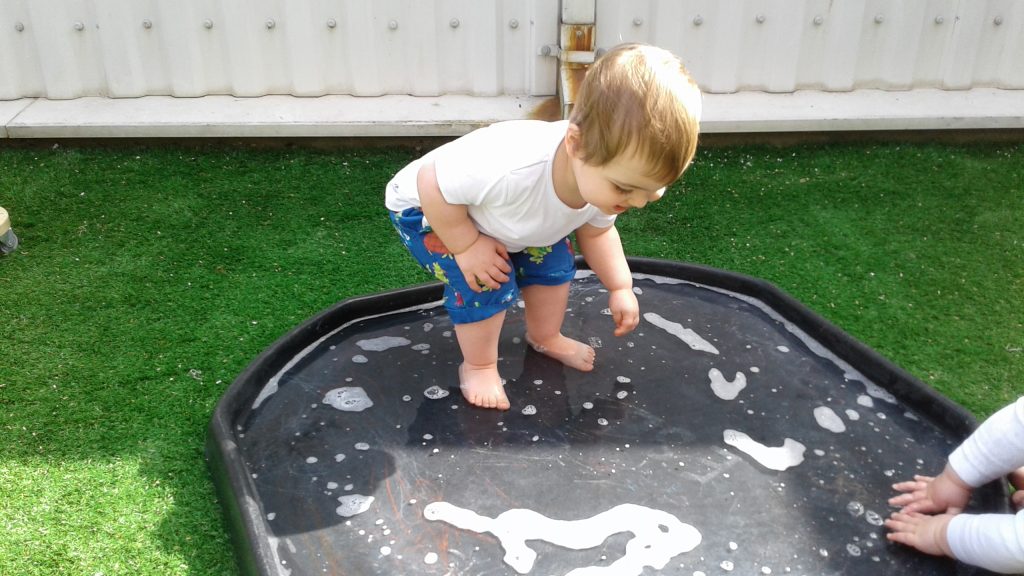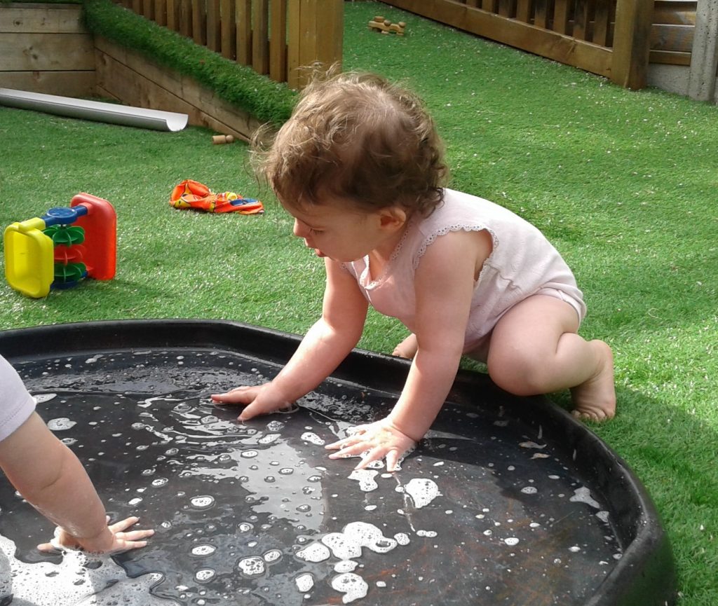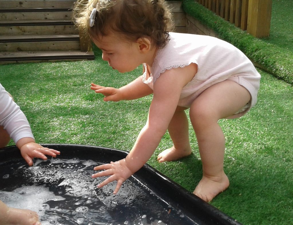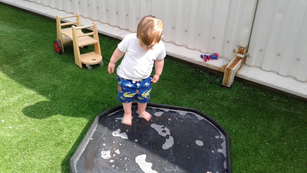 The under 2’s enjoyed getting wet in the water filled tuff tray, splashing the water around.