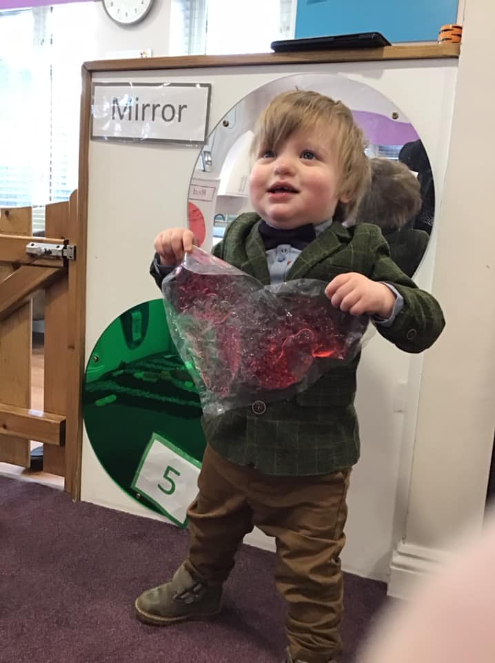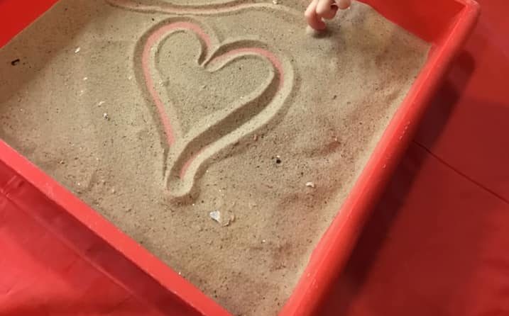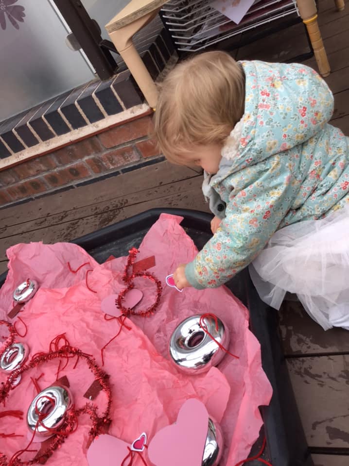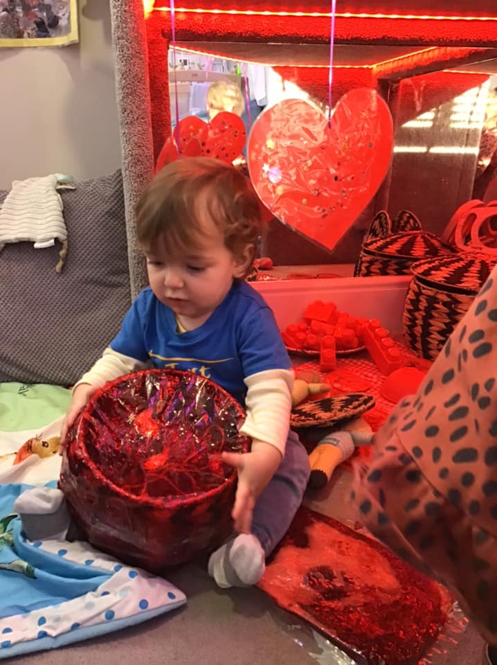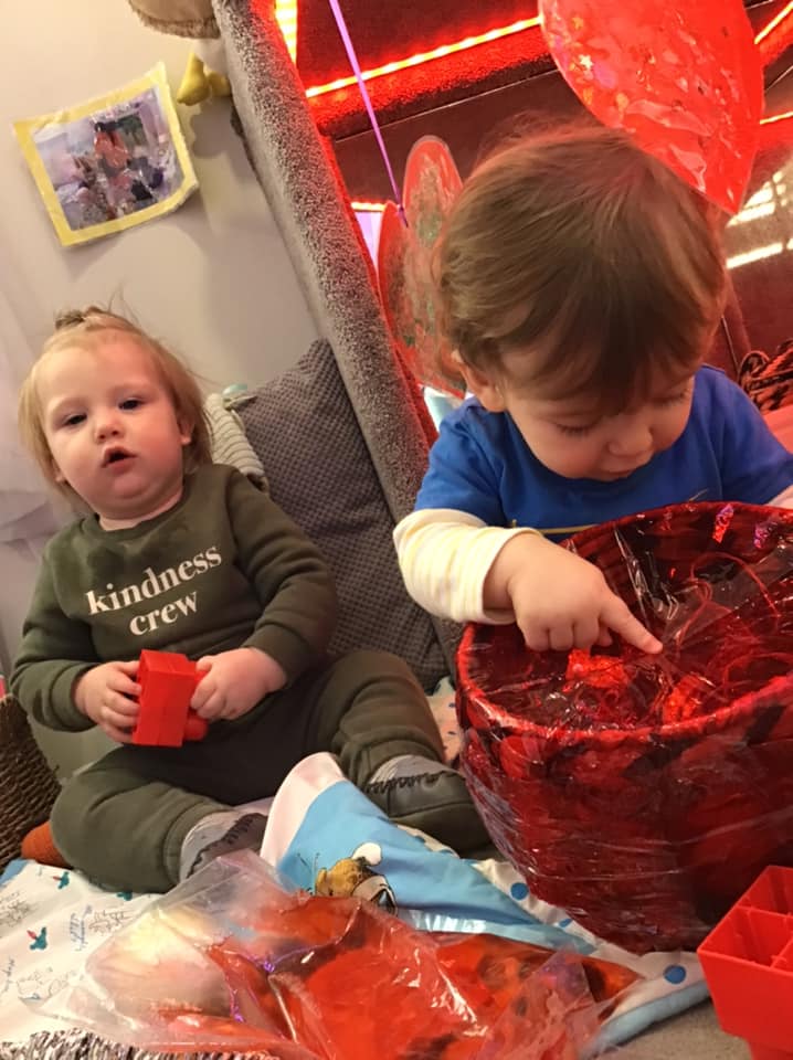 Our Jemima Puddleducks and Bobtails children enjoyed the heart themed sensory den/tuff spot, exploring the different materials and red and pink objects.