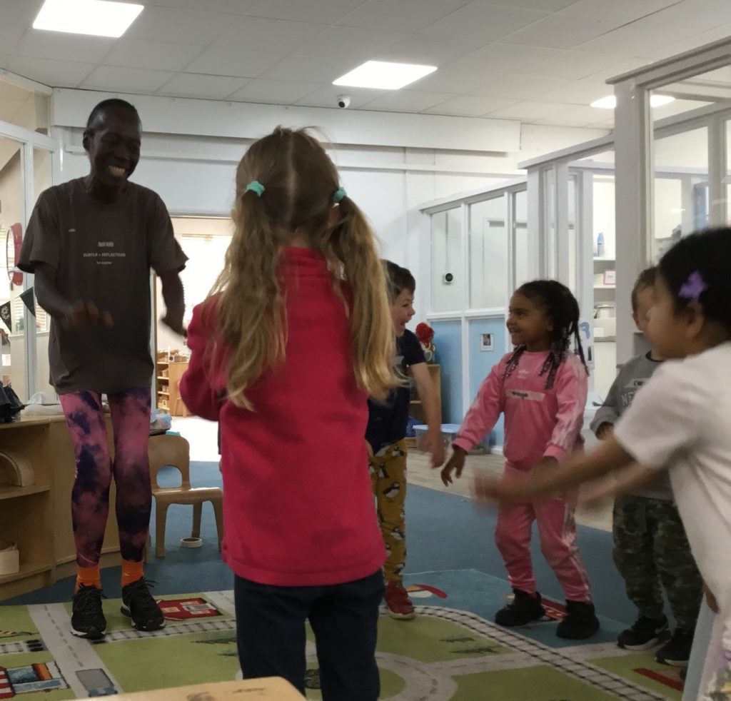Bemma shared examples of various dances that are enjoyed in her home country of Ghana and showed the children the different sounds made by the dancers as they moved. The children loved moving to music and dancing like the African animals that Bemma had told them about.