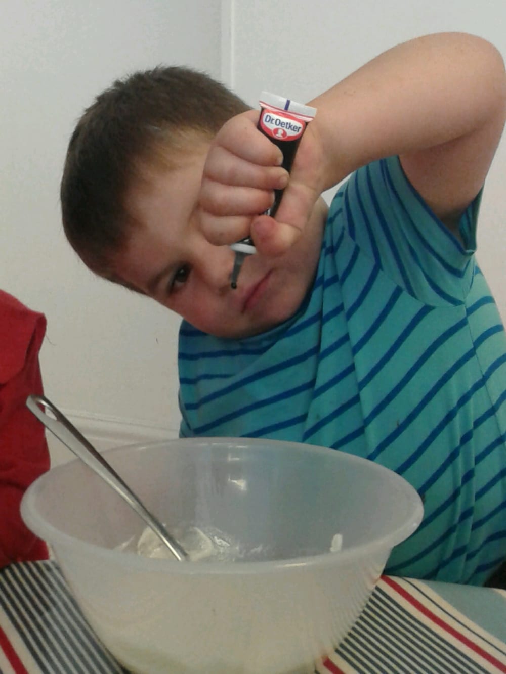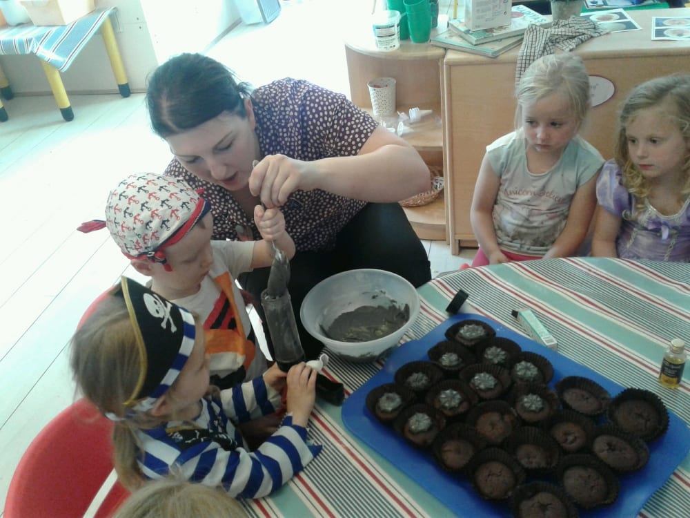 The children talked to the adults during Mr Harvey time about what they thought pirates had to eat. If the pirates were eating the same food as we eat, they wanted to know how they kept their food fresh. So, we had a very interesting chat about food preservation in the times before refrigeration! The children also wanted to make pirate cakes and discussed how they could set about this. They chose to use black or grey icing for decoration and chopped cherries to mix into their cakes.