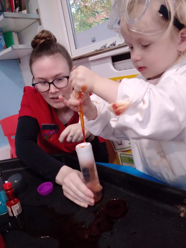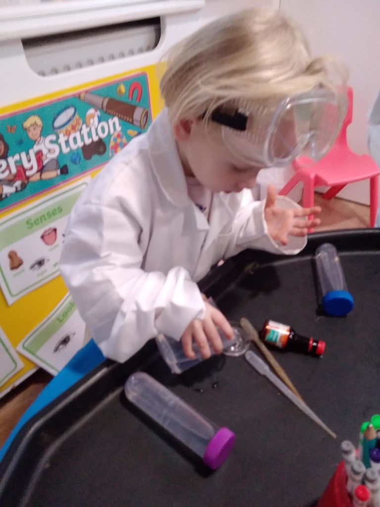 The children really enjoyed getting suited up with their lab coats and goggles to carry out their experiment, one that we revisited because it linked with our weather. Using shaving foam and water the children made their own rain!
