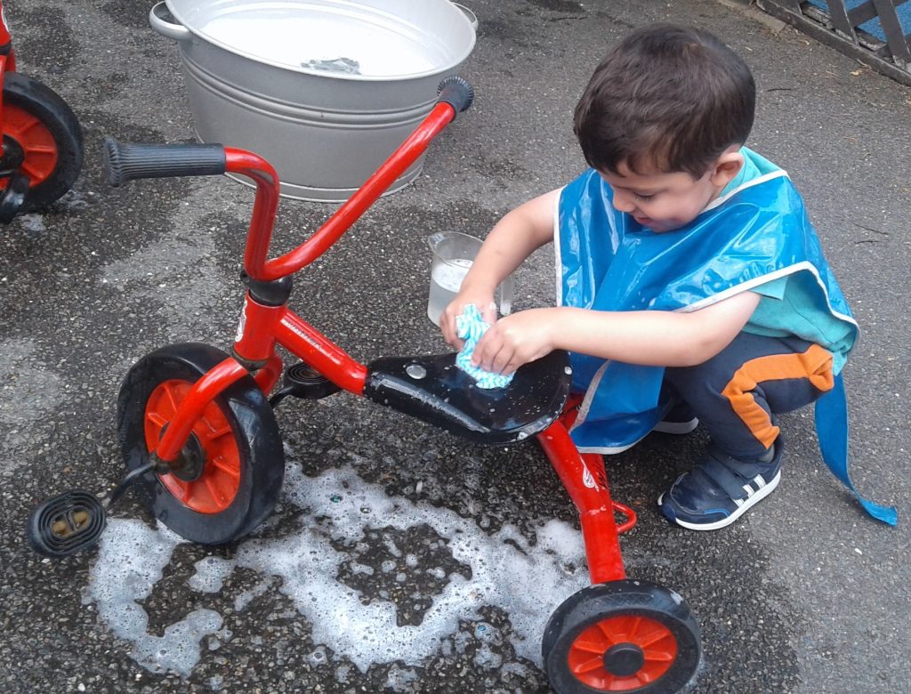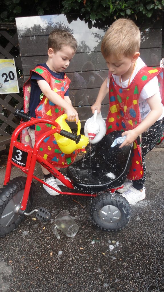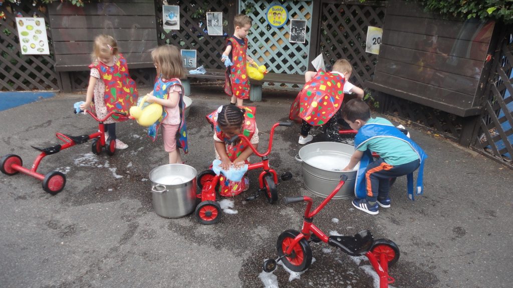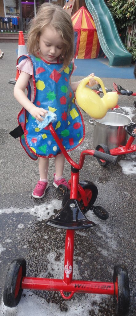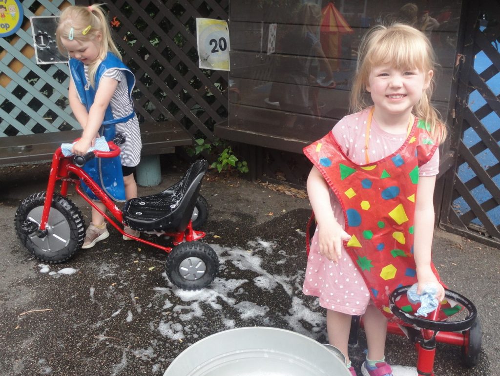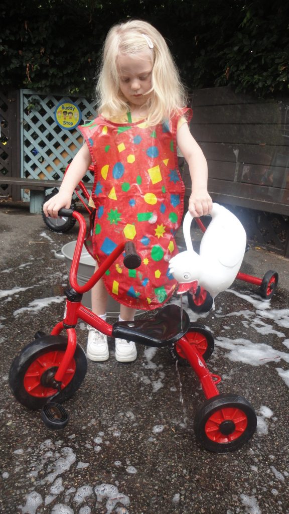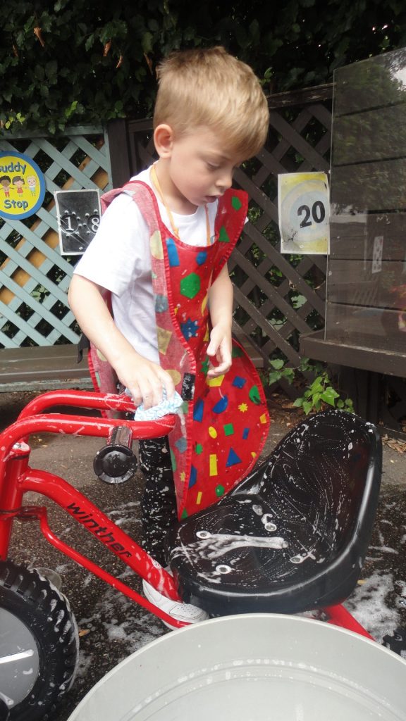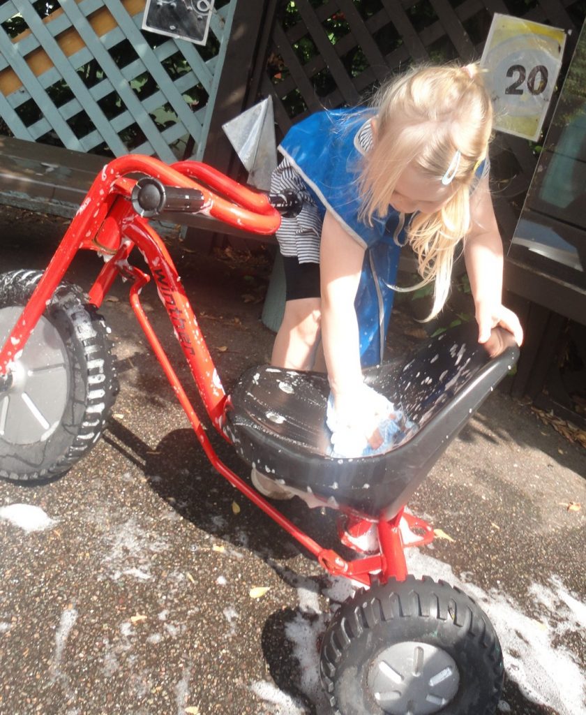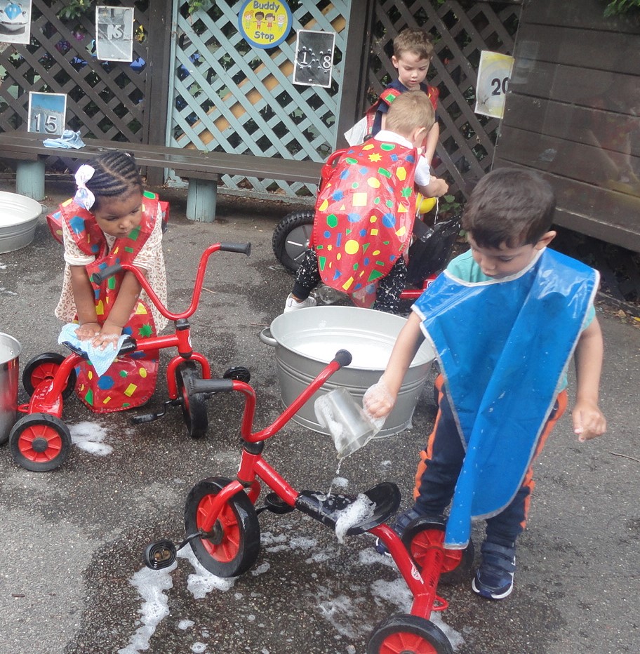 The early years children have been exploring the topic of transport and have been very busy in the garden washing the bikes.