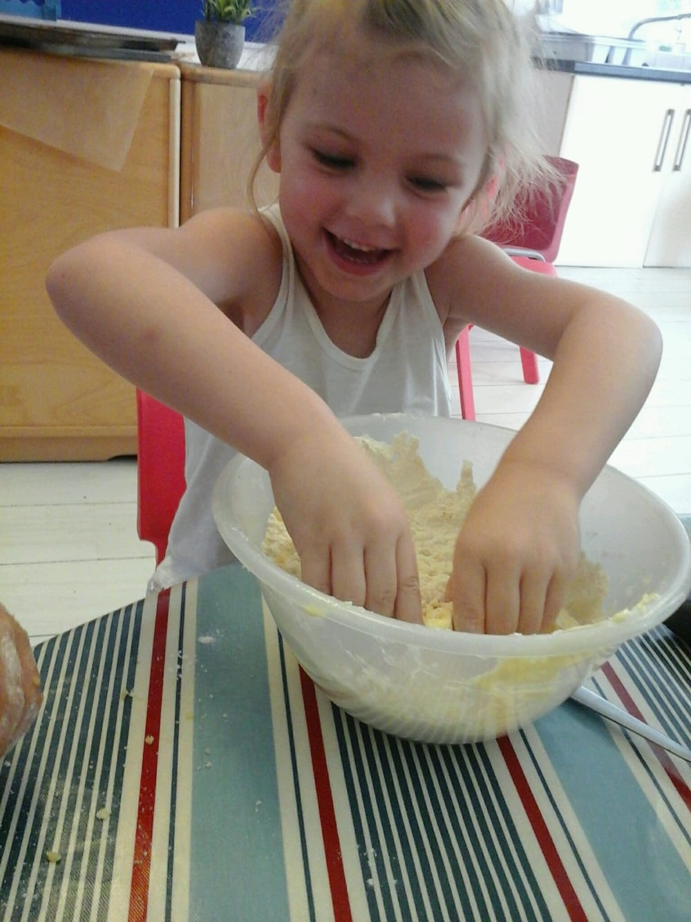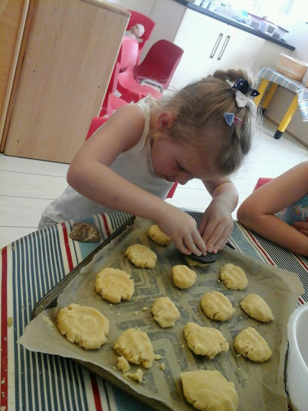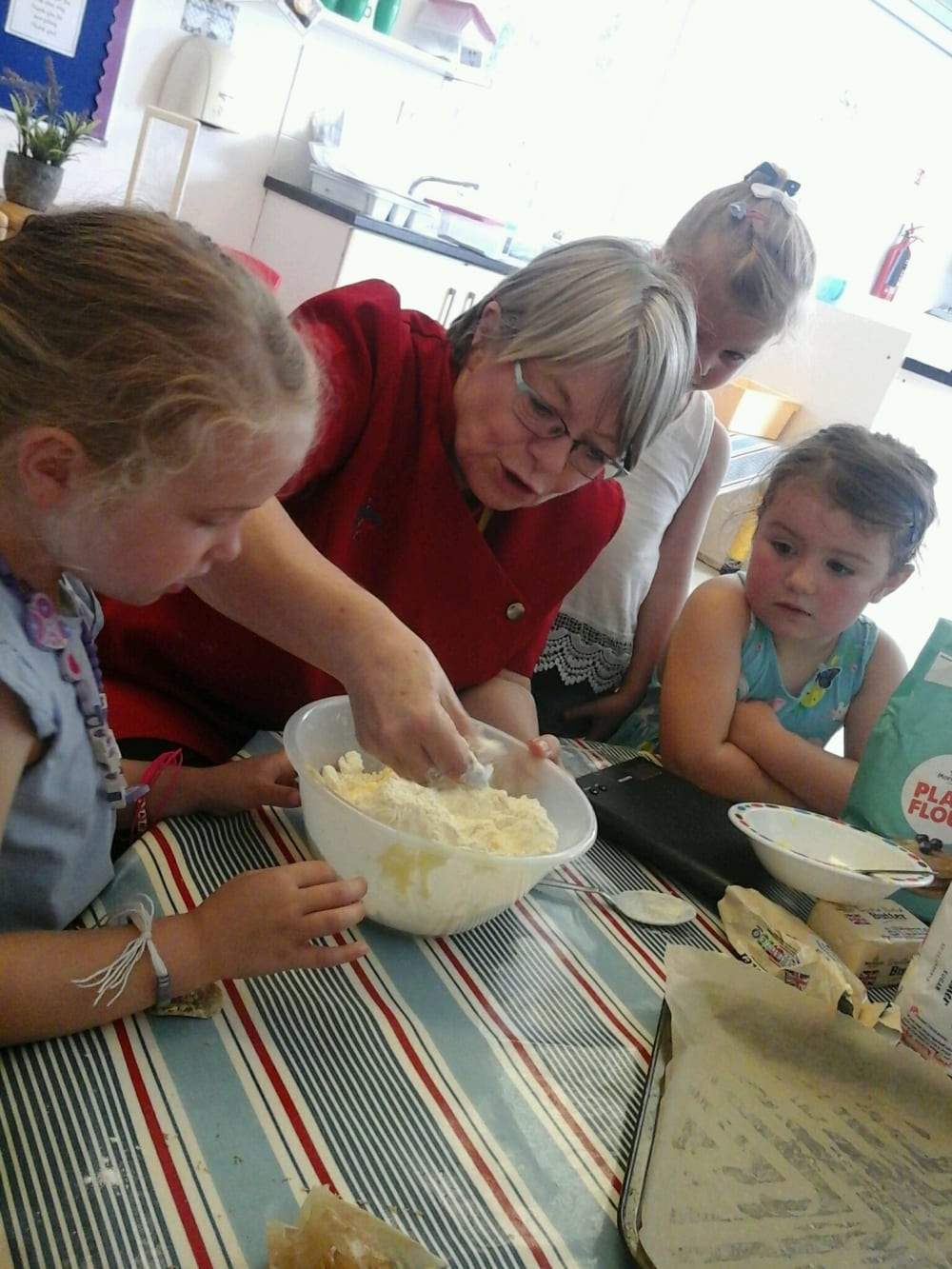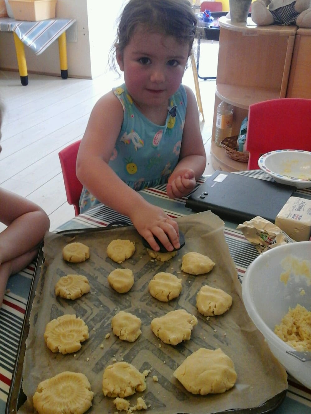Meanwhile indoors it was time for some baking. After reading the recipe and gathering and weighing the ingredients it was time to start making the biscuits. After rubbing the margarine into the flour and mixing in the water, the dough was shaped into rounds and shell cutters were used to make a nice finish. Once baked and cooled, the biscuits were ready for eating! Delicious!