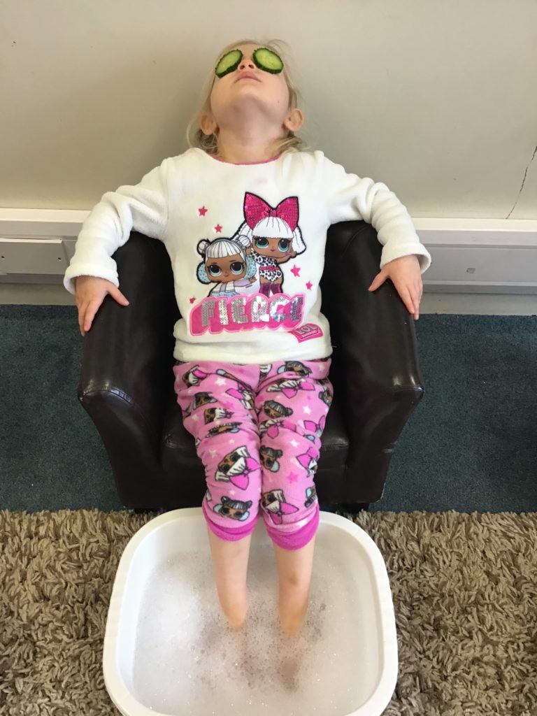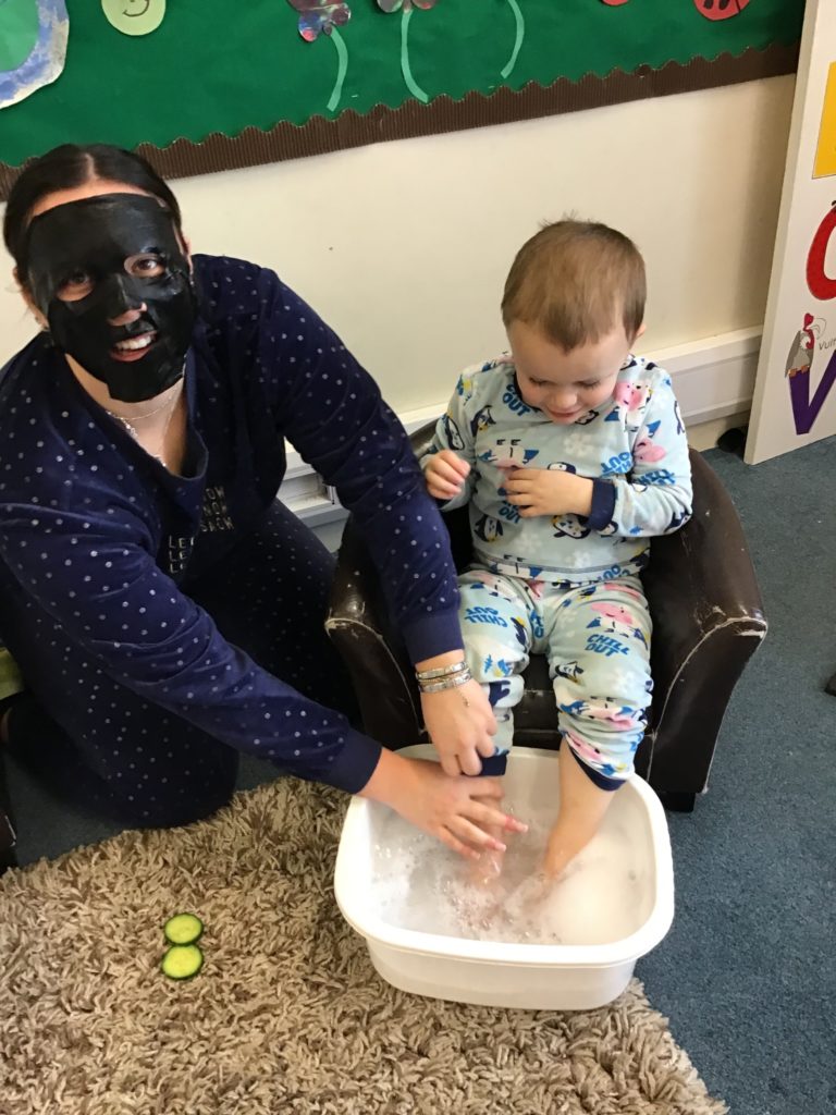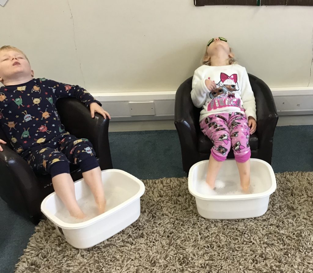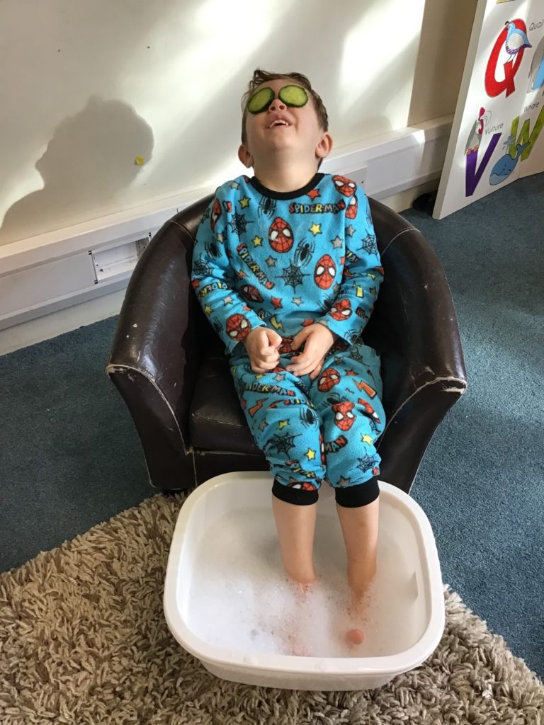 The children and staff were invited to come to nursery in their pyjamas, dressing gowns and slippers and they were treated to foot soaks, hand soaks, cucumber eye therapy, yoga, meditation/chill time and relaxing music throughout nursery.