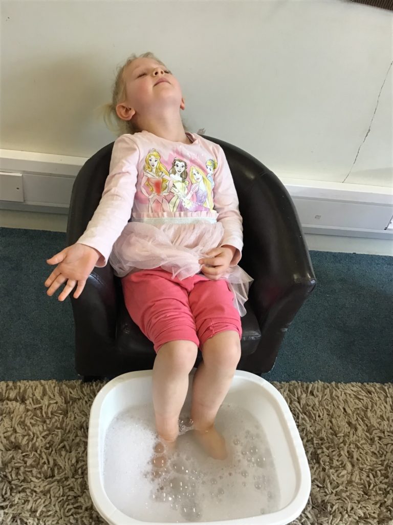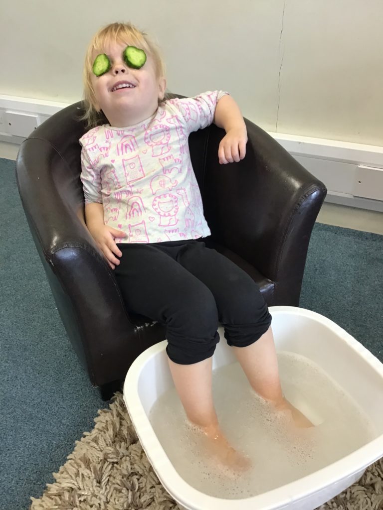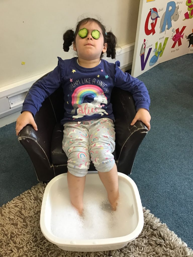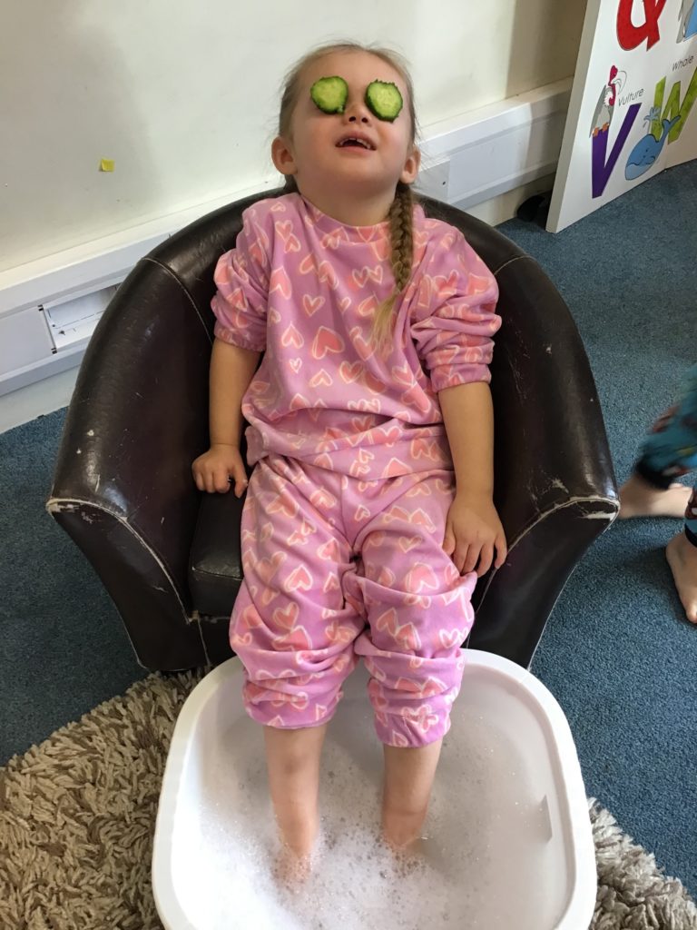 The children and staff were invited to come to nursery in their pyjamas, dressing gowns and slippers and they were treated to foot soaks, hand soaks, cucumber eye therapy, yoga, meditation/chill time and relaxing music throughout nursery.