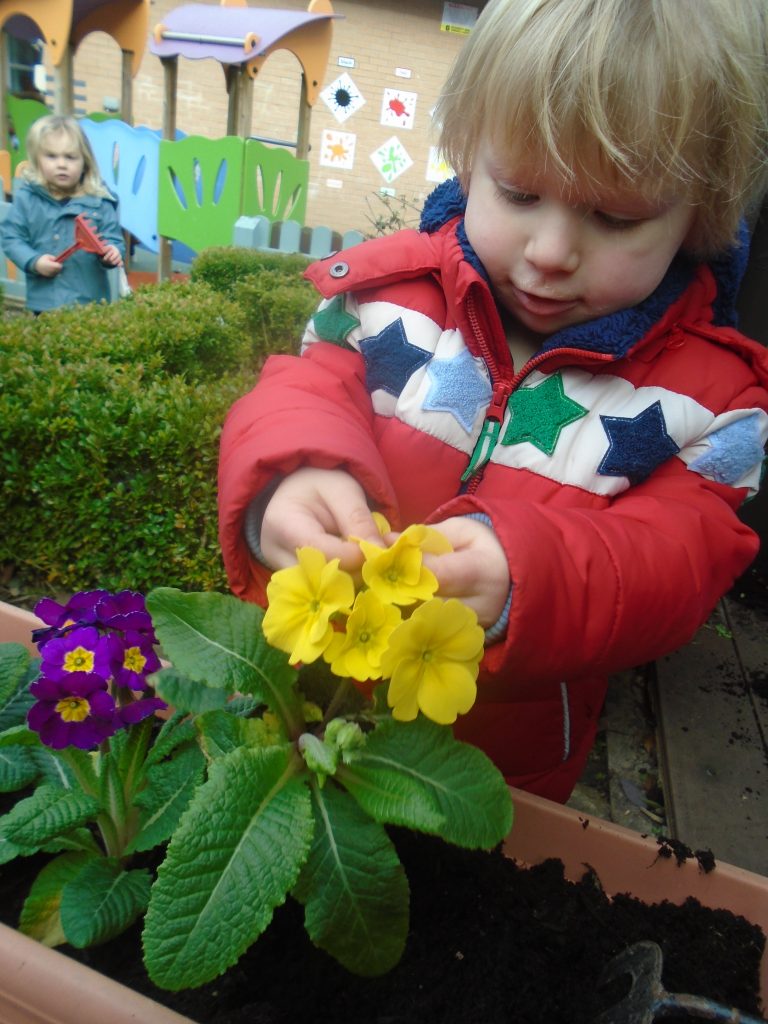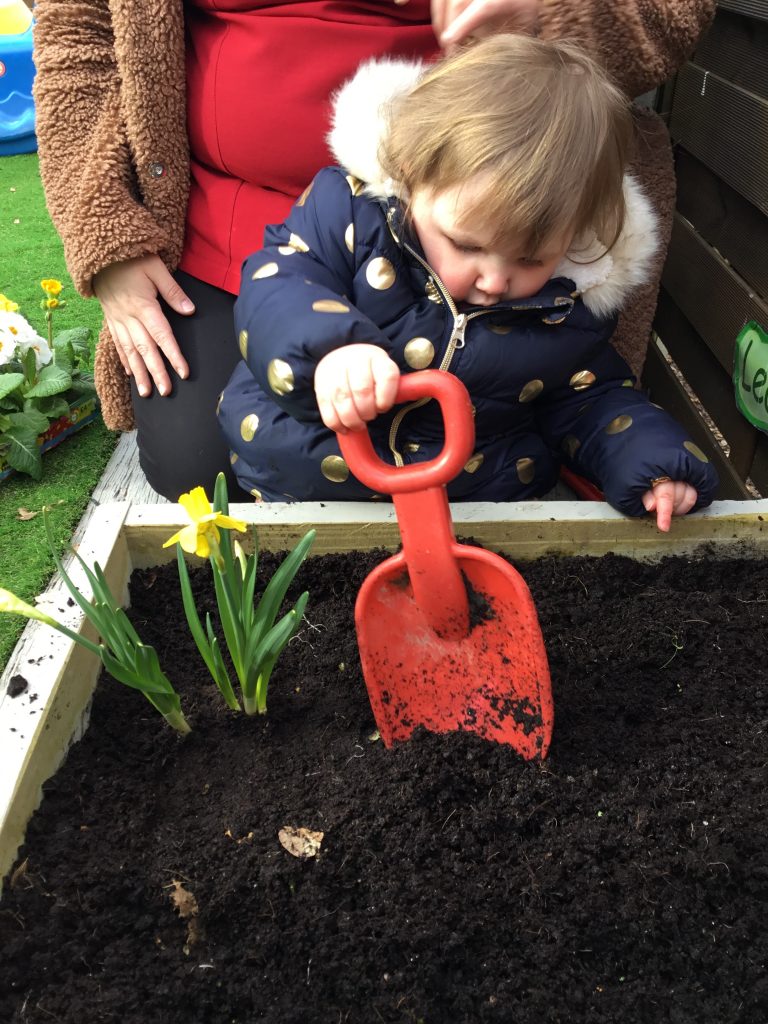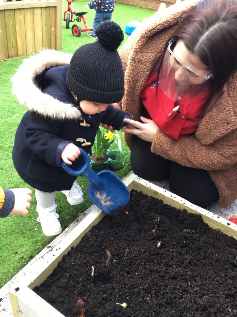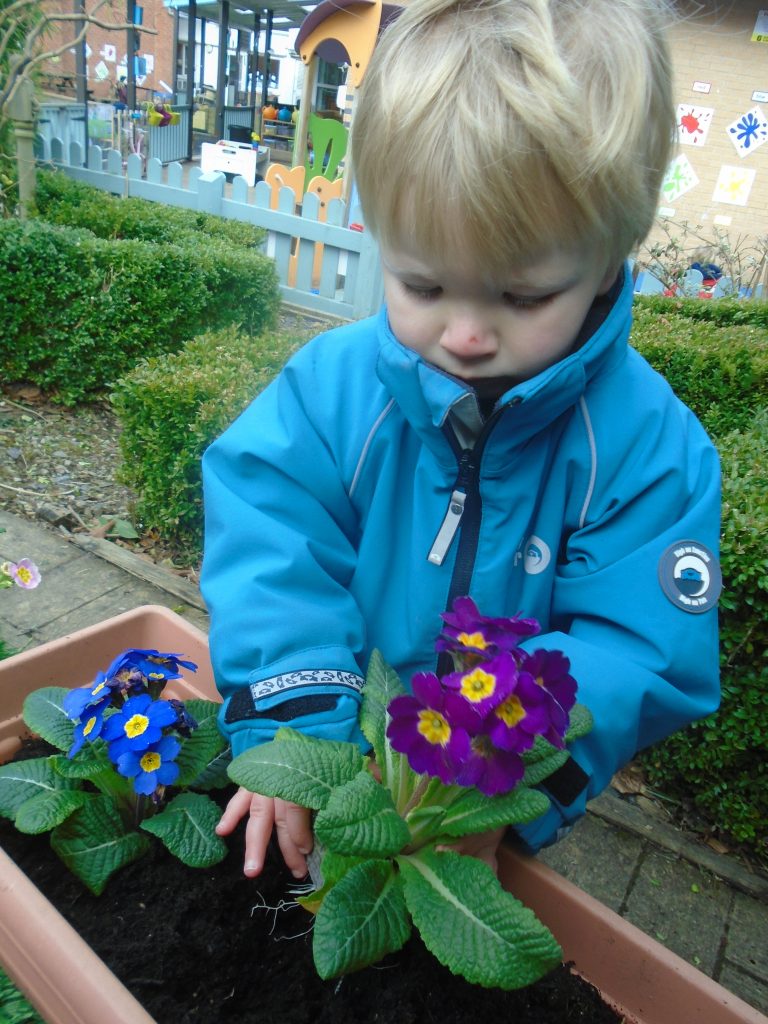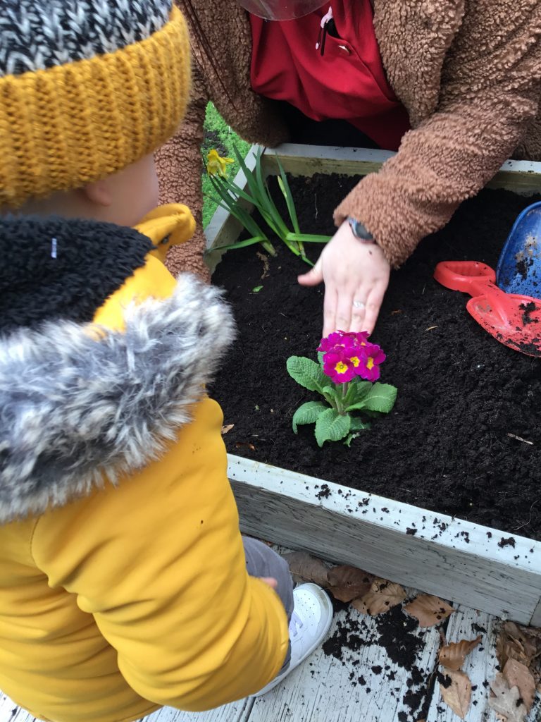 Next, with a little help from our adults, we dug little holes for our flowers to sit in. We then pushed the soil back into the hole and pressed the soil down using our hands.