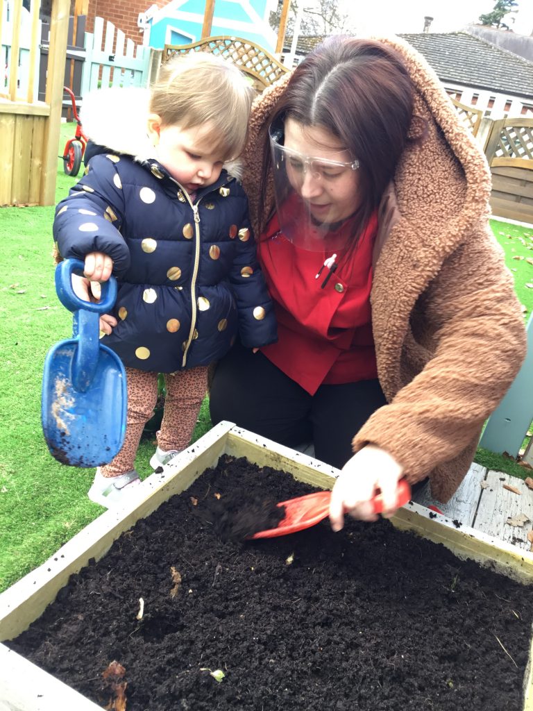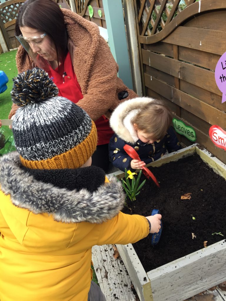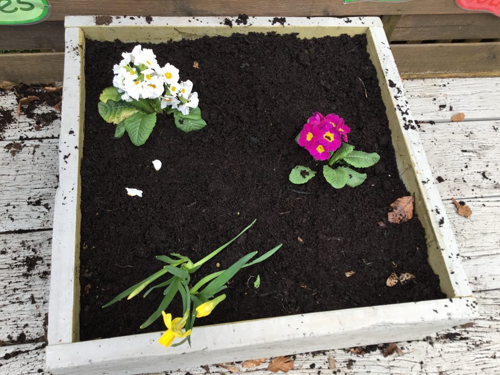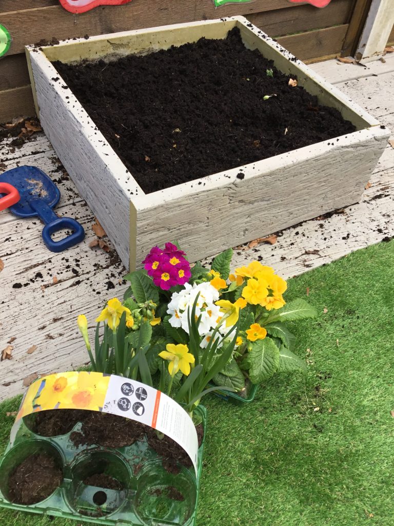 After choosing our favourite coloured flowers and picking our spades, we set to work. We discarded any leaves and old flowers and prepared the soil by turning it all over and raking the top.