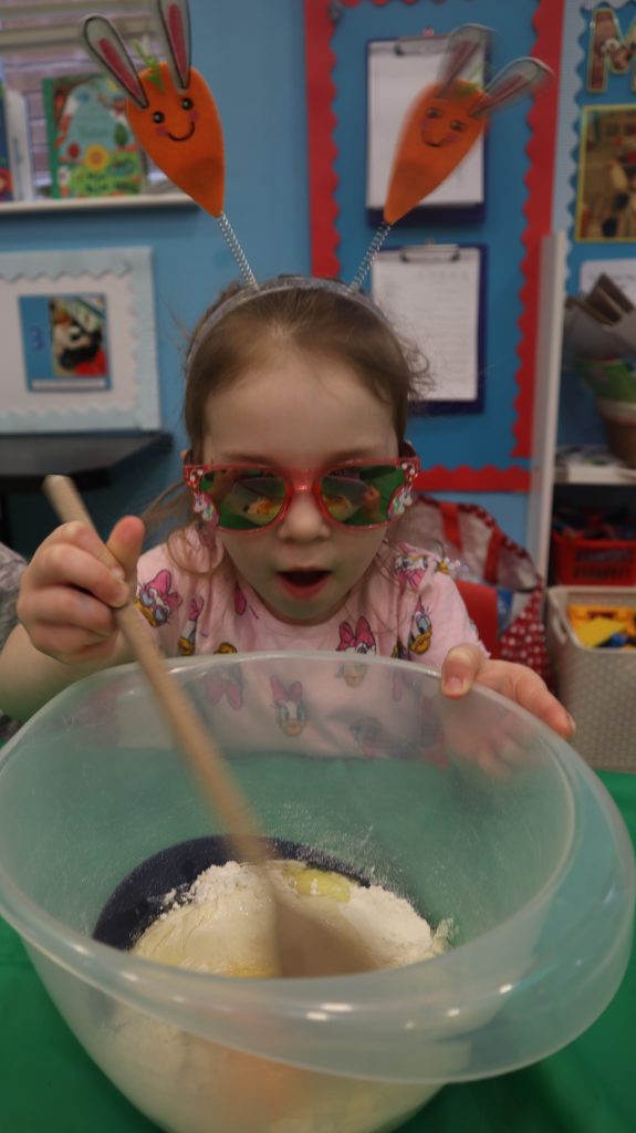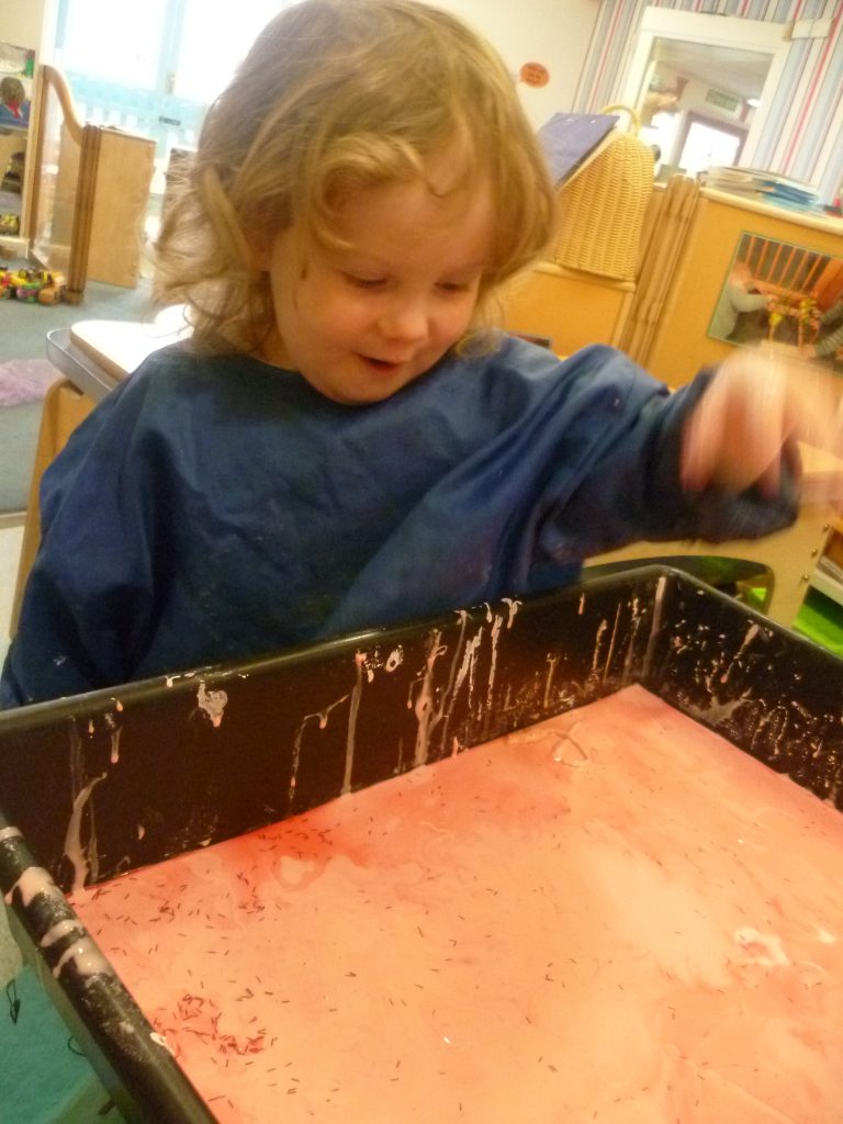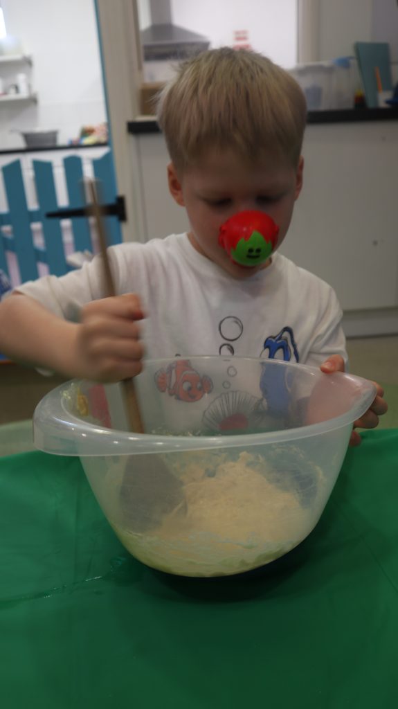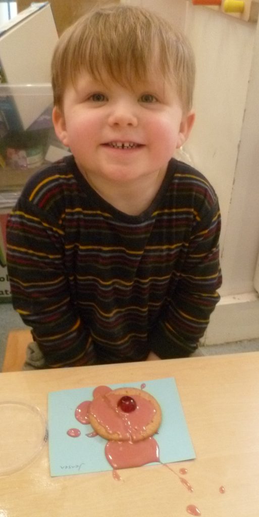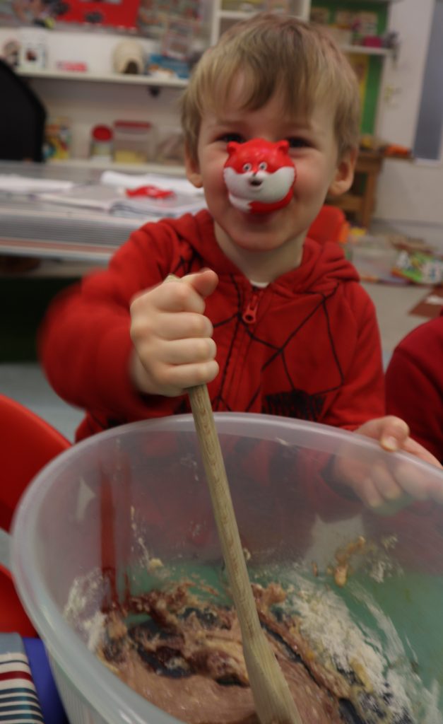 At Toton the children wore their red noses as they baked cakes, decorated nosey biscuits and played in red gloopy cornflour.