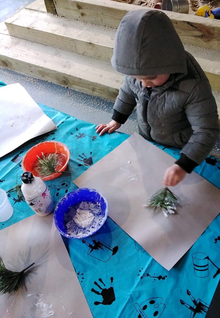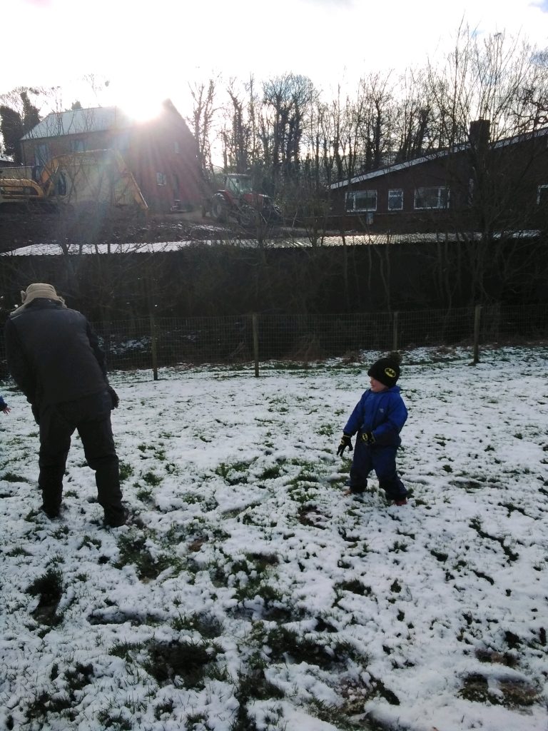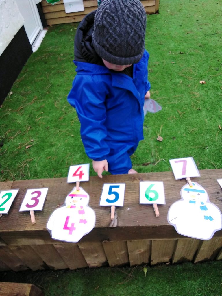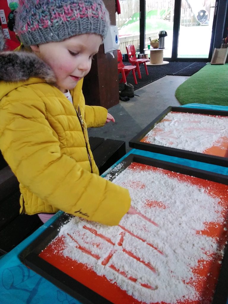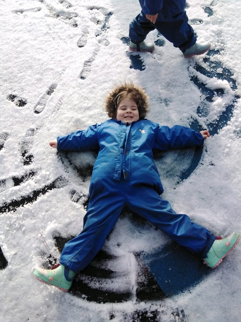 The snow brought such delight as everyone was keen to get outside and play.The children were quick to make snow angels and were soon making marks in the snow. This led to making marks in other ways such as  writing our names in flour and using tree branches to make marks with paint.