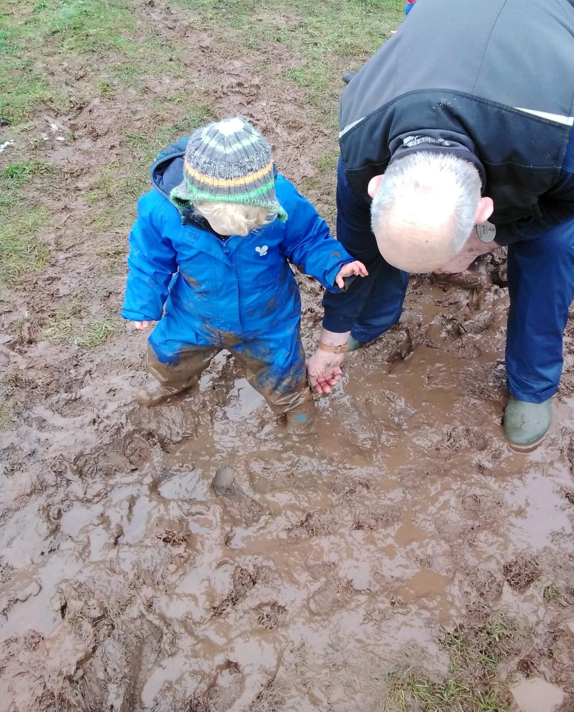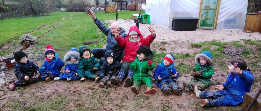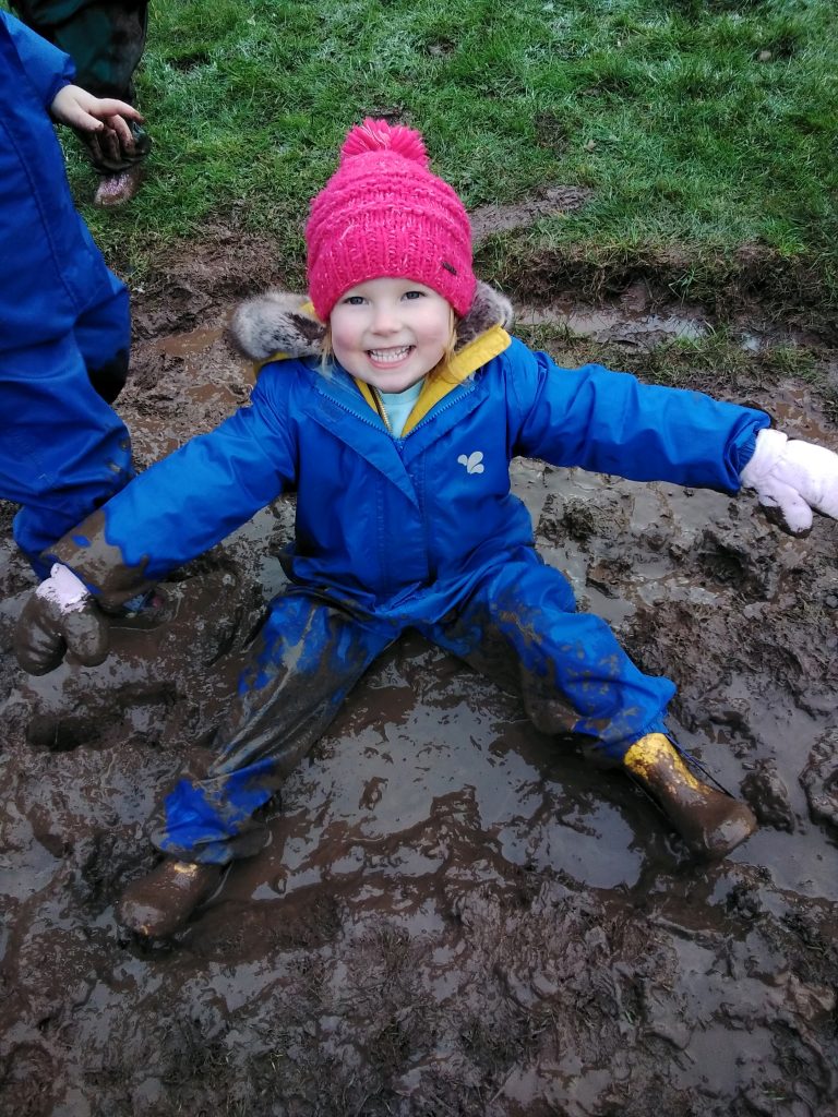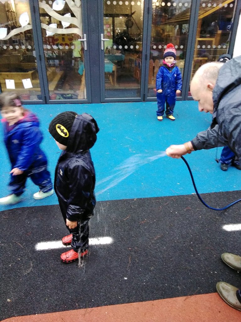 Of course, with all the rain there’s been plenty of mud, glorious mud to fascinate everyone. Getting muddy and nearly losing our wellies in the deep oozy mud was great fun! Thank-you Mr Peter for hosing us down, an experience which just added to the enjoyment.