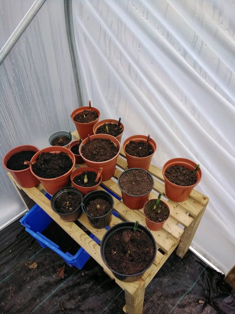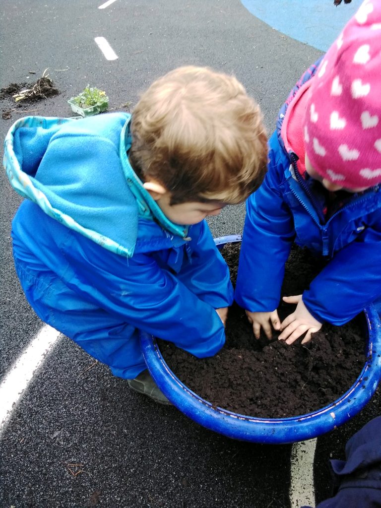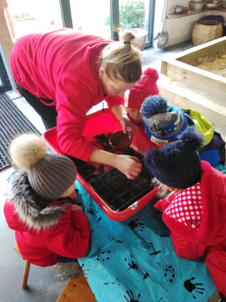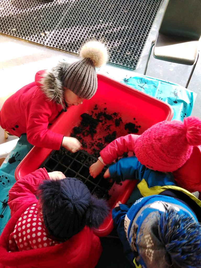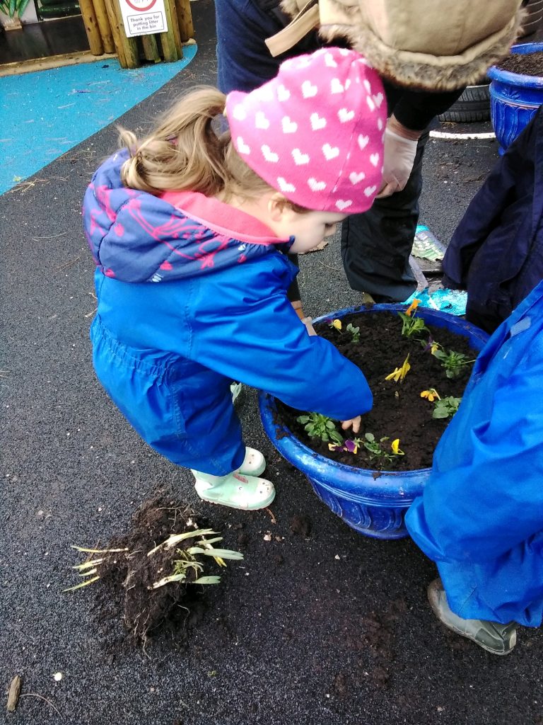 With all the snow, summer may seem a long way off but the children have been getting some plants ready. They planted pea seeds to grow indoors ready to eat for lunch in summer. To make the outside area look cheerful, the children transplanted the bulbs they planted in October into some new pots and added some pansies.