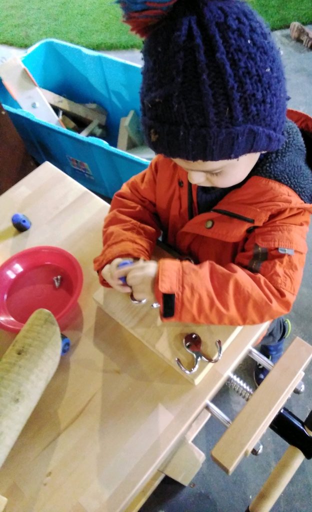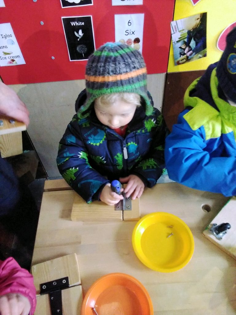 The children took part in an outdoor number hunt and enjoyed a range of woodworking activities with Mr Peter. Everyone is getting really good at using the screwdriver to add wheels, hooks and hinges to the wood.