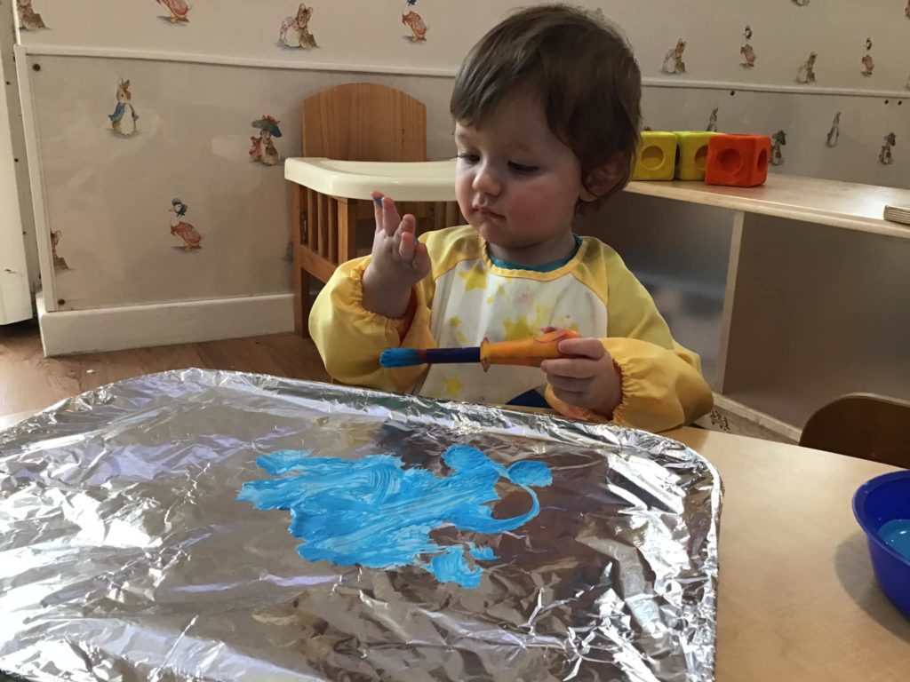 The babies have been very hands on enjoying painting on tin foil. They could feel all the different textures that come with this activity.  Feeling, hearing, and seeing the different effects they made as they sloshed the paint around made this a very enjoyable activity.