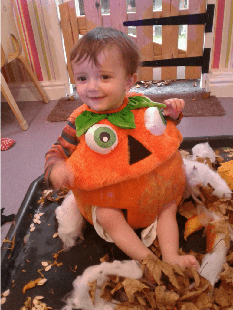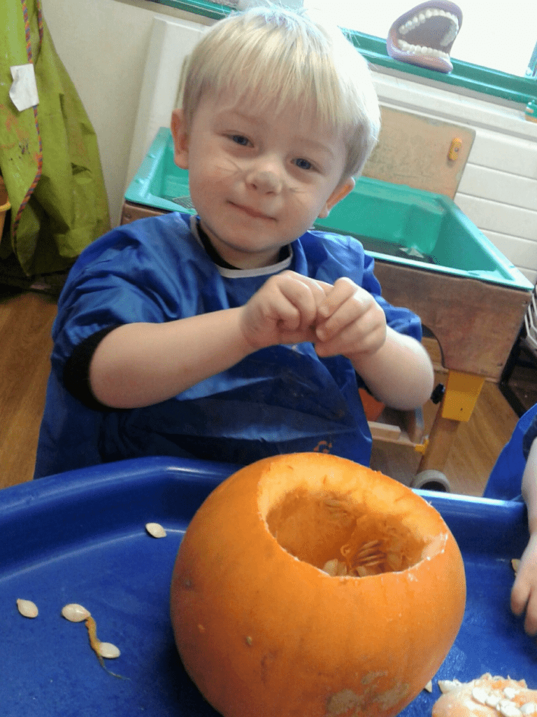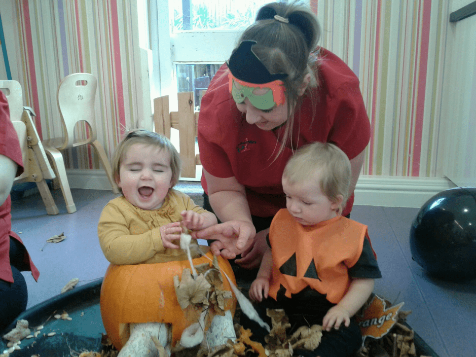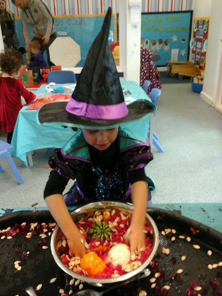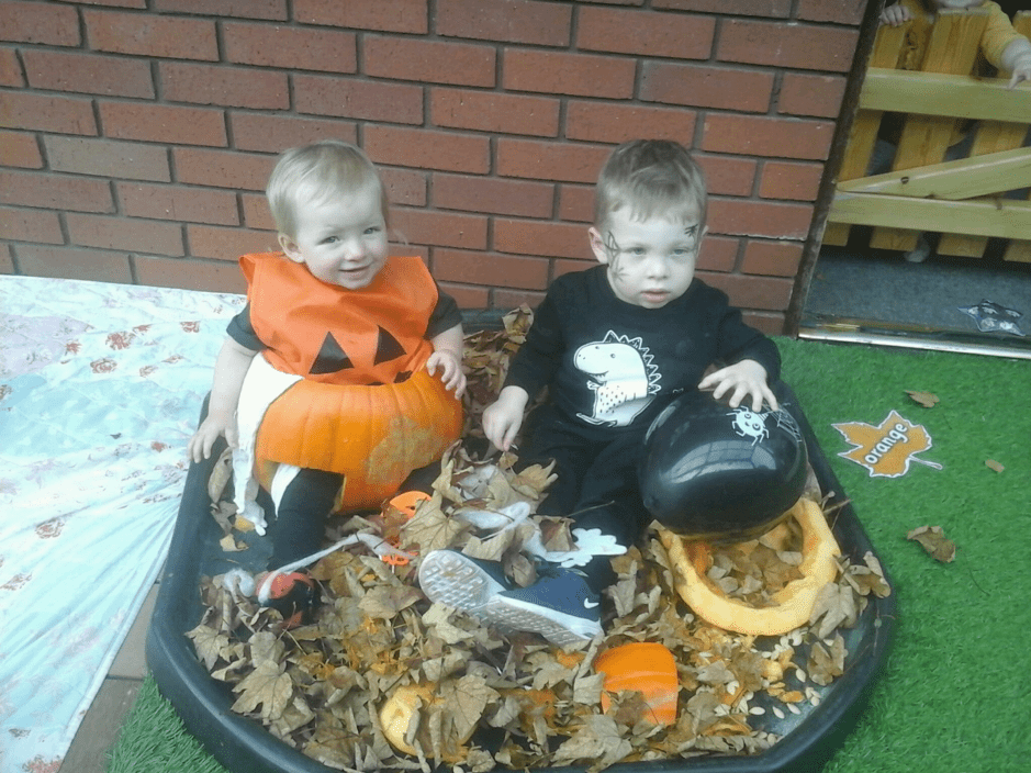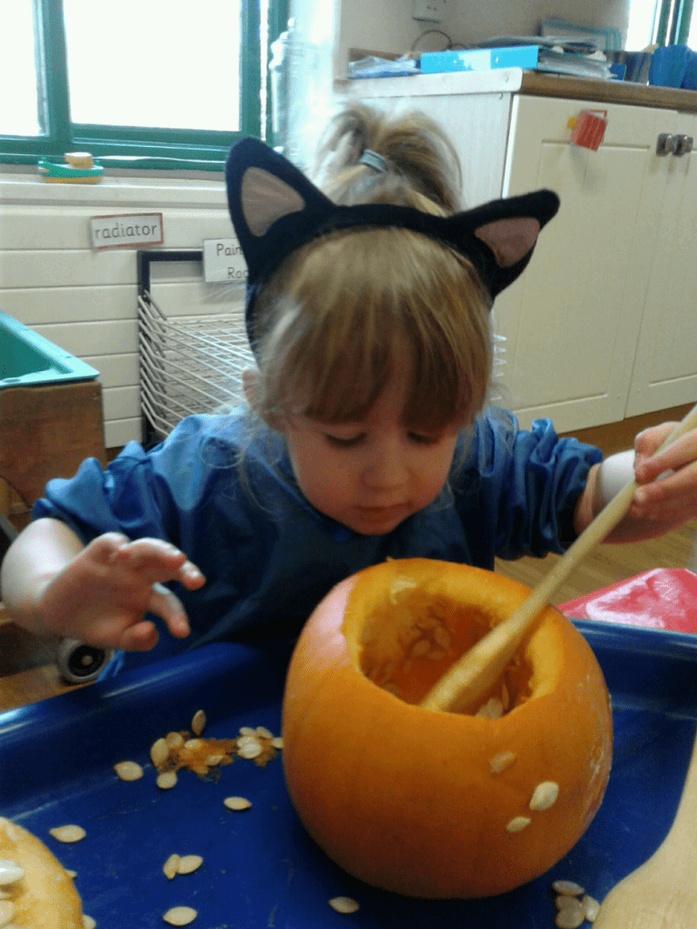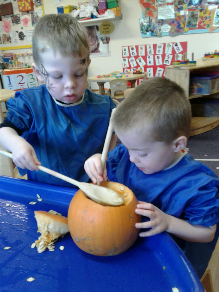At Buckinghams, there was also plenty of wonderful costumes which gave us all lots to chat about. Pumpkins were explored and used as a stimulus for more talking and creative activities. The children really concentrated as they used the big spoons to scoop out the flesh and the seeds from the pumpkins. The babies had fun sitting in a giant hollowed out pumpkin surrounded by Autumn leaves in the tuff spot.