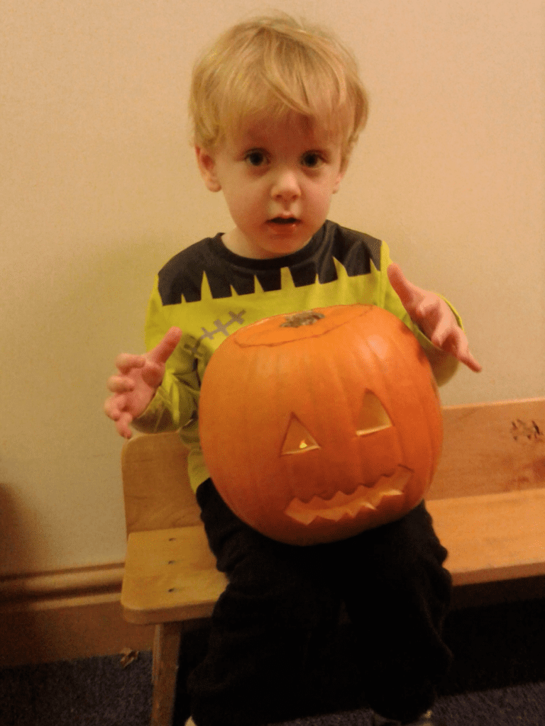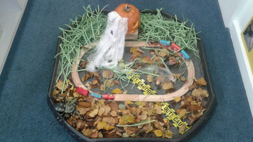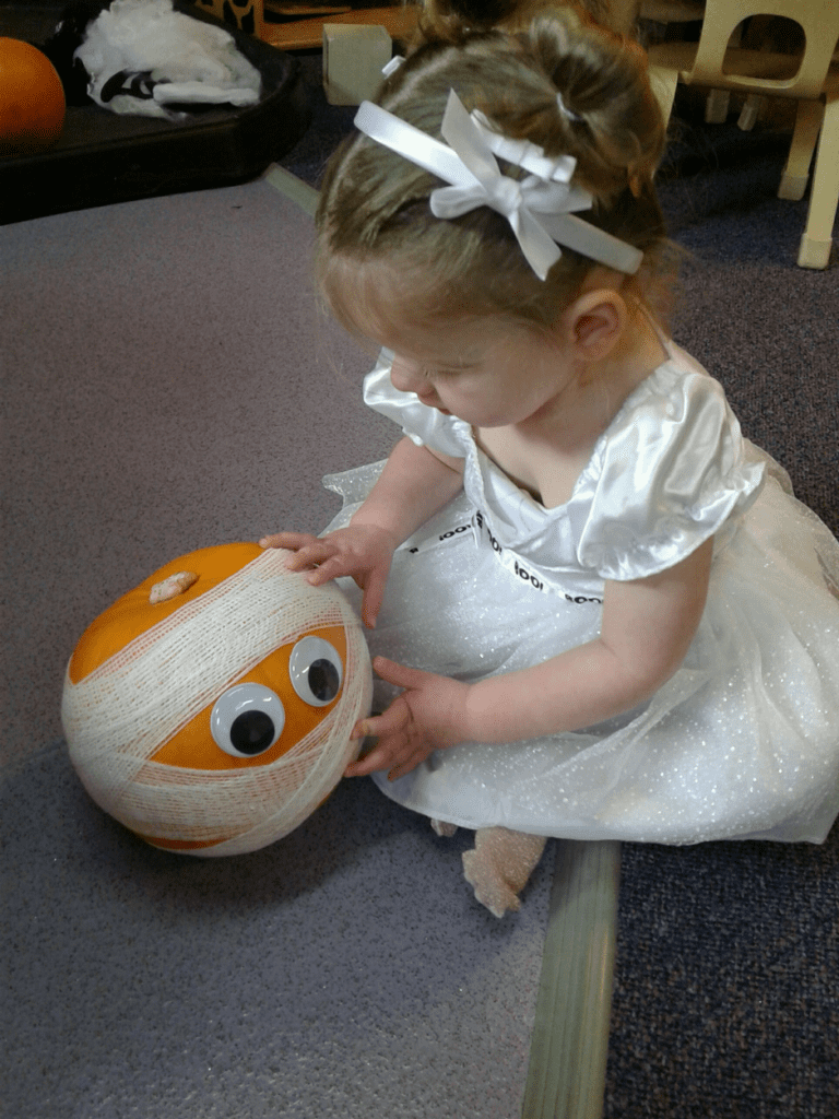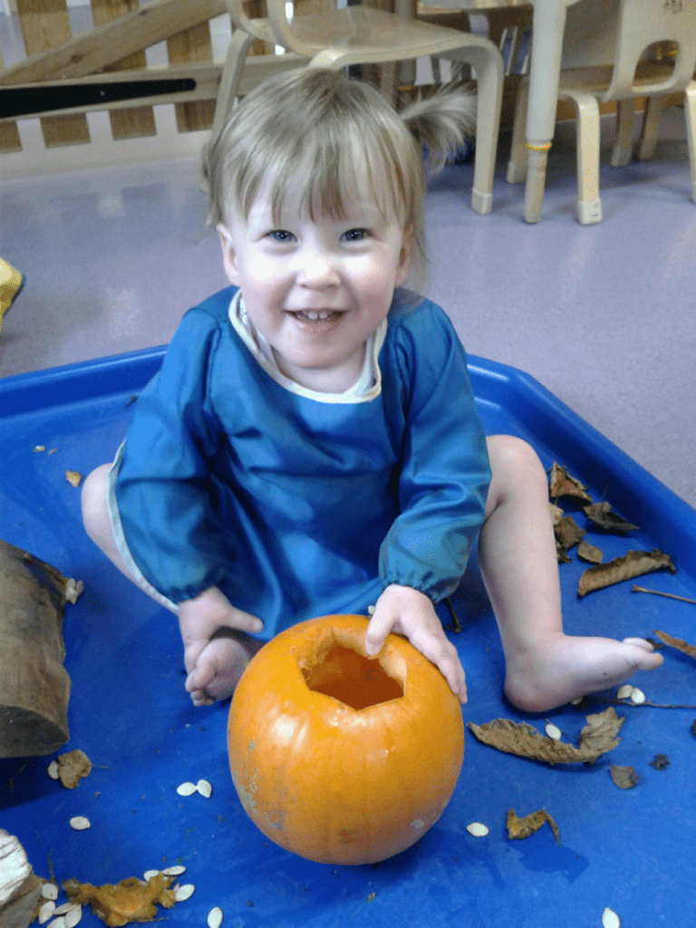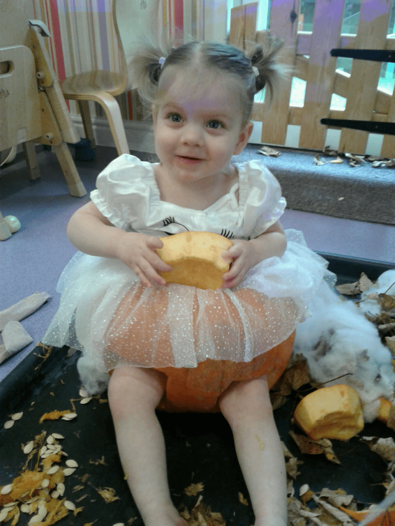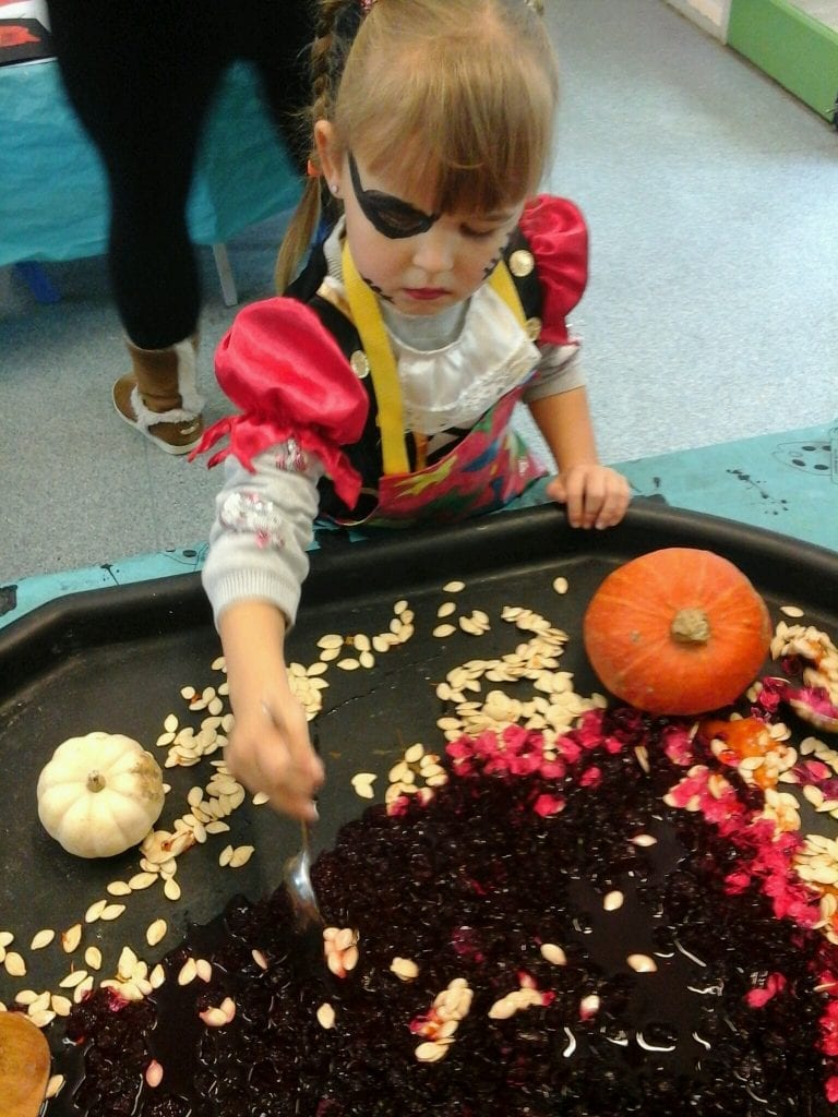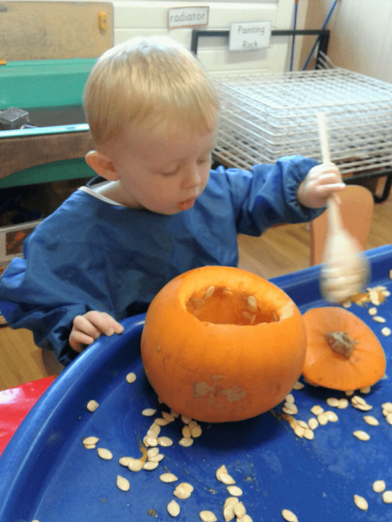 At Buckinghams, there was also plenty of wonderful costumes which gave us all lots to chat about. Pumpkins were explored and used as a stimulus for more talking and creative activities. The children really concentrated as they used the big spoons to scoop out the flesh and the seeds from the pumpkins. The babies had fun sitting in a giant hollowed out pumpkin surrounded by Autumn leaves in the tuff spot.