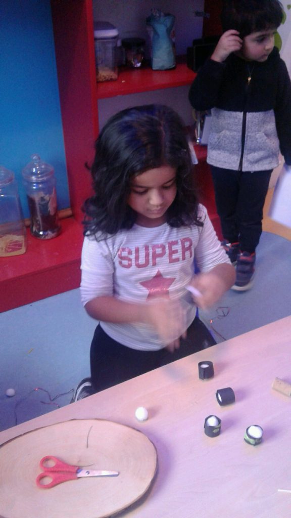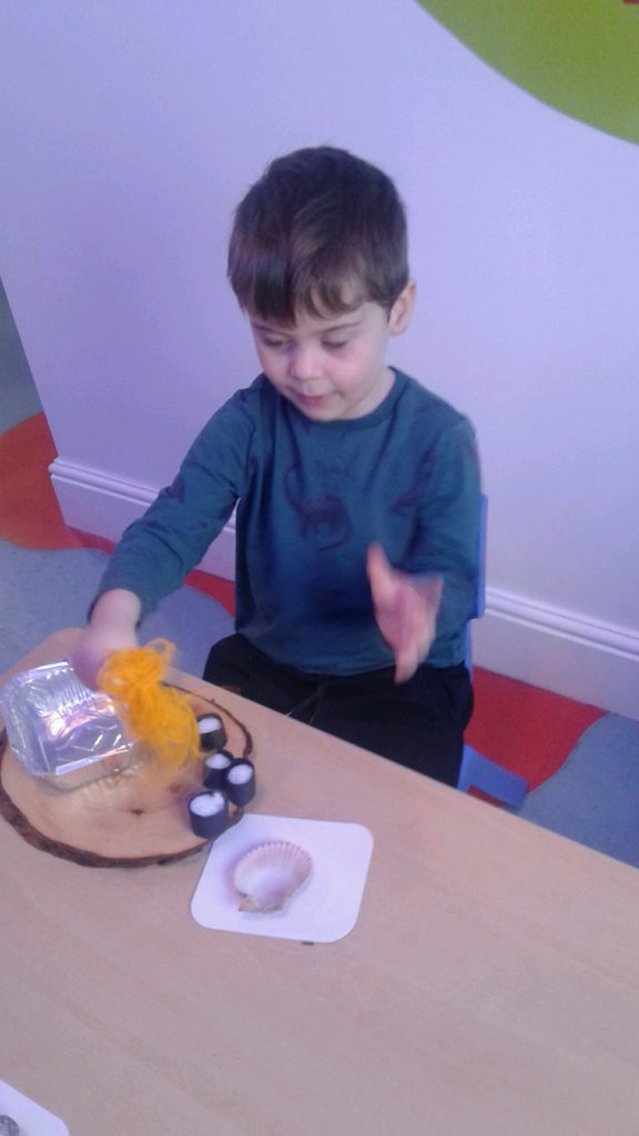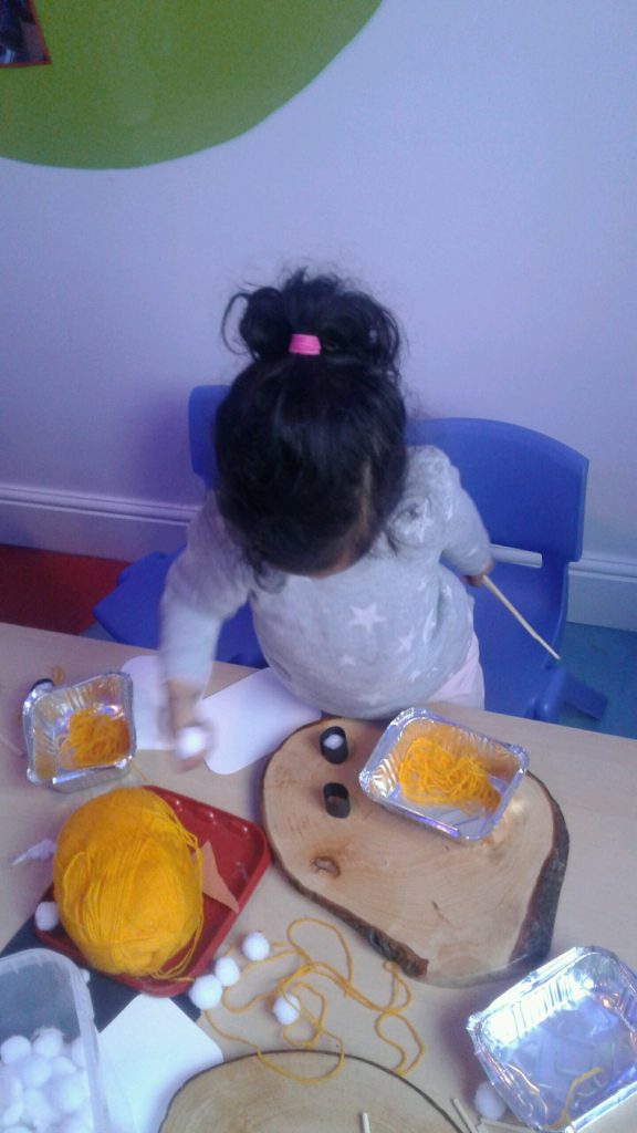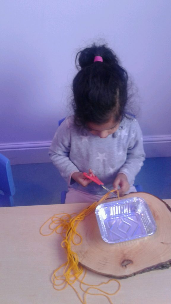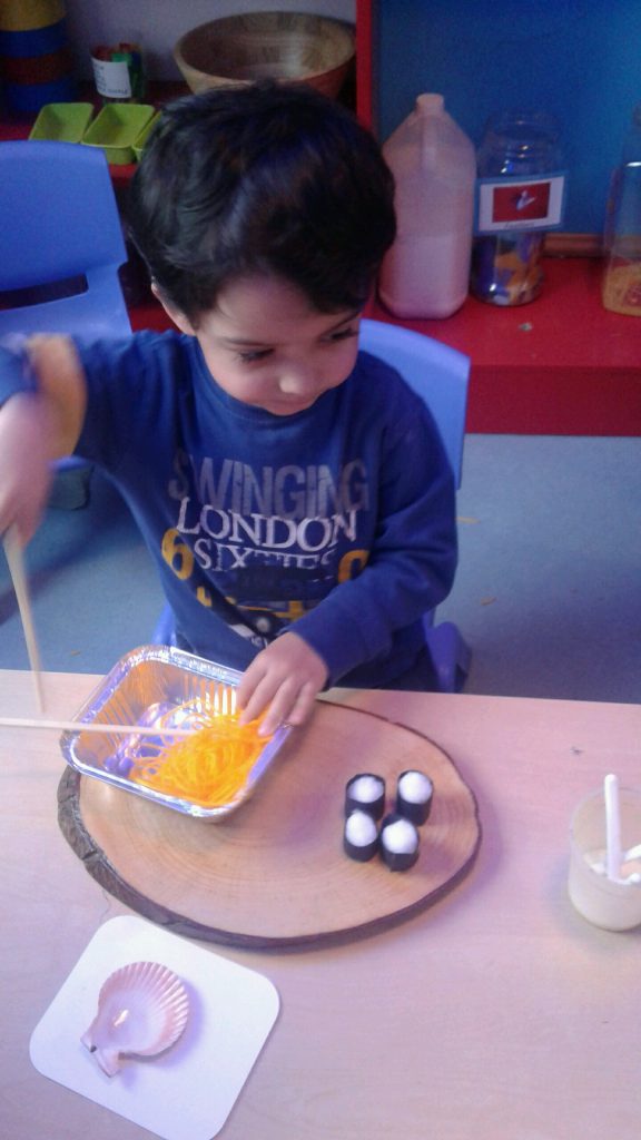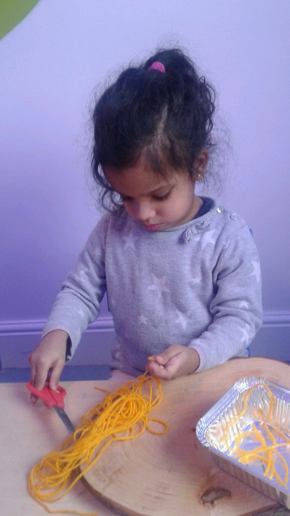 Using foil dishes, pretend noodles cut from yellow wool, and chopsticks the children set about transferring the noodles to the containers. This was far from easy! However, the children showed that they were able to use their fine motor skills to snip the wool, control the chopsticks and place the noodles into the trays. The children loved this activity which really tested their concentration and perseverance skills. Great work everyone!