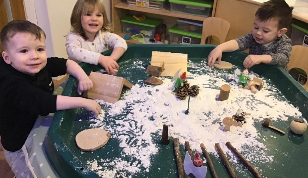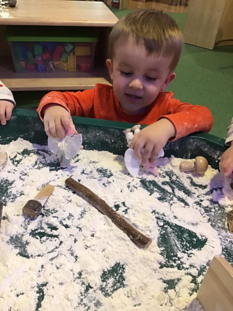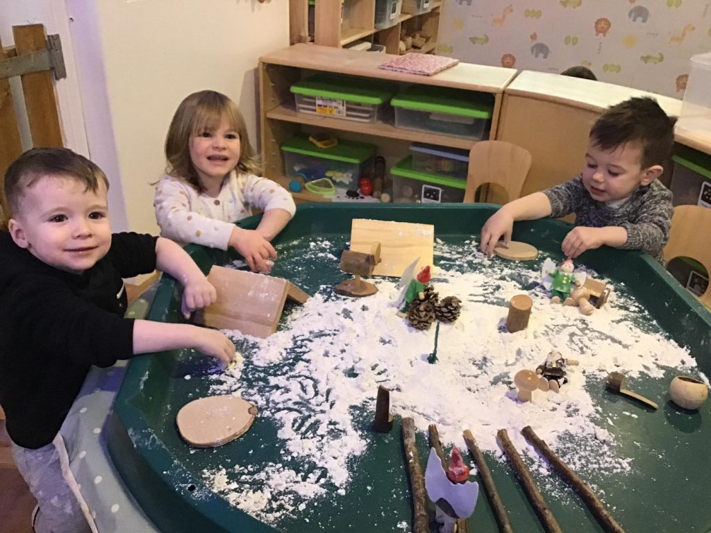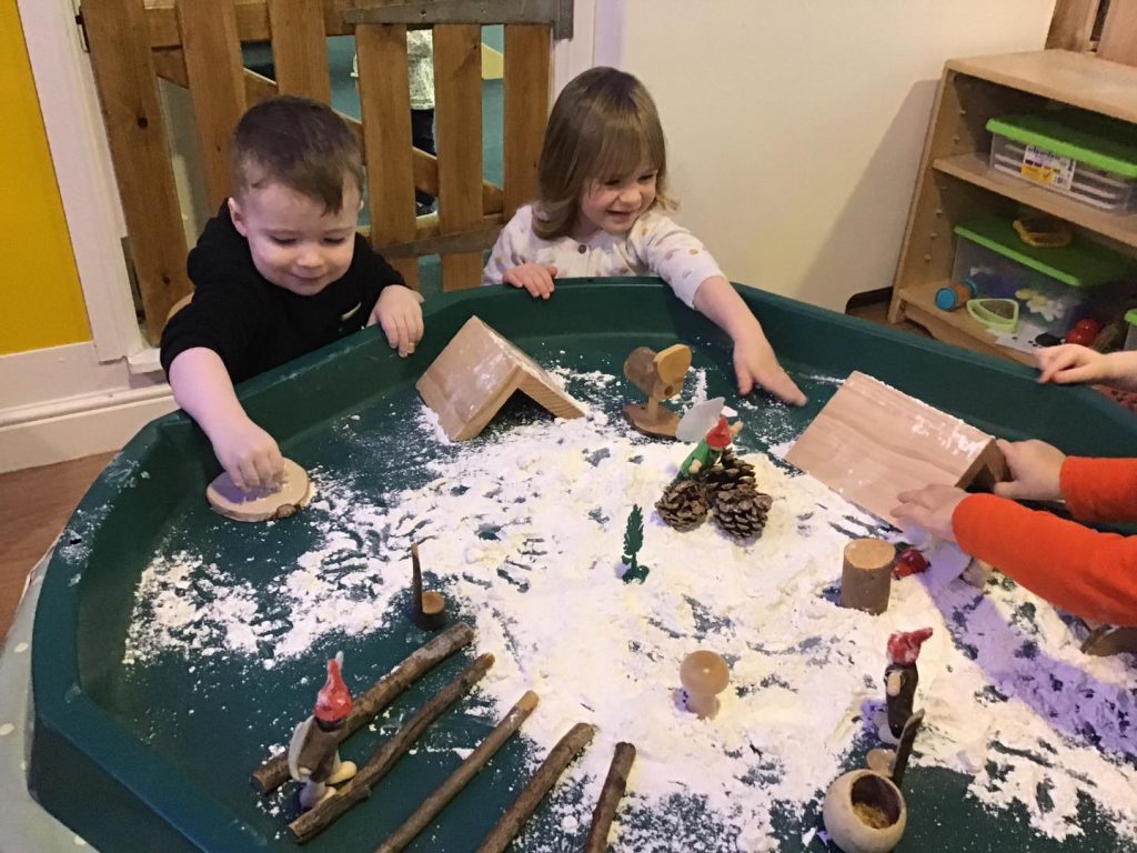 The Peter Rabbits have had so much fun playing in our winter wonderland tuff tray.  First they helped to make the snow and then built a magical snowy scene with our different small world toys! They liked feeling the texture of the snow with their finger tips, and used their imaginations to make houses for the fairies!