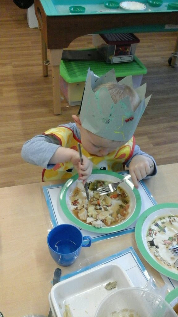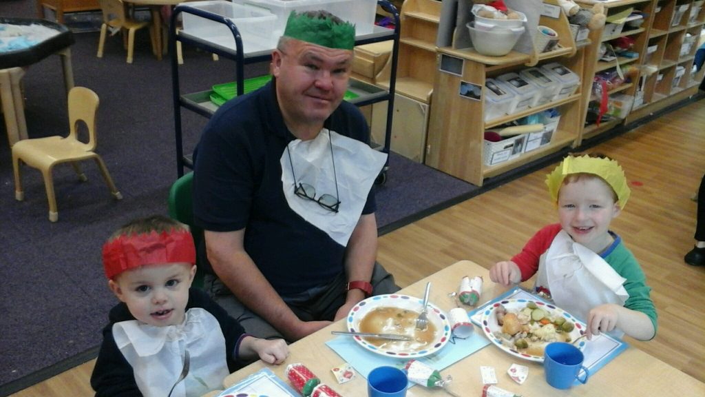 For our Christmas dinner we were pleased to welcome Miss Mel who looks after all the nursery admin and Daz the caretaker. The children impressed our guests with their wonderful table manners as everyone tucked in to a delicious lunch prepared by Miss Phoebe, our wonderful cook. Daz’s clean plate shows how much he enjoyed this special dinner!