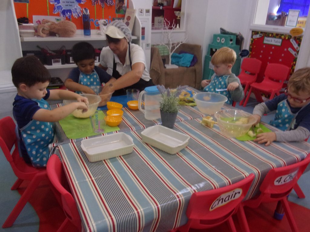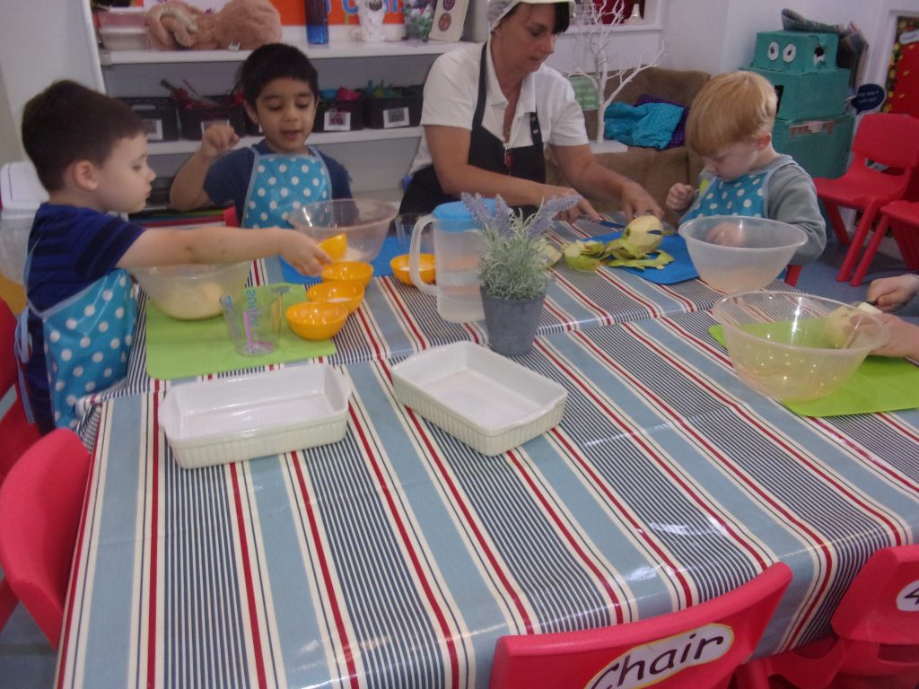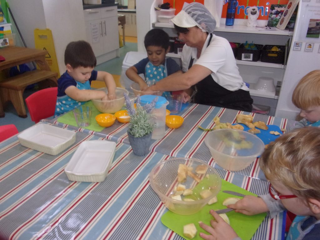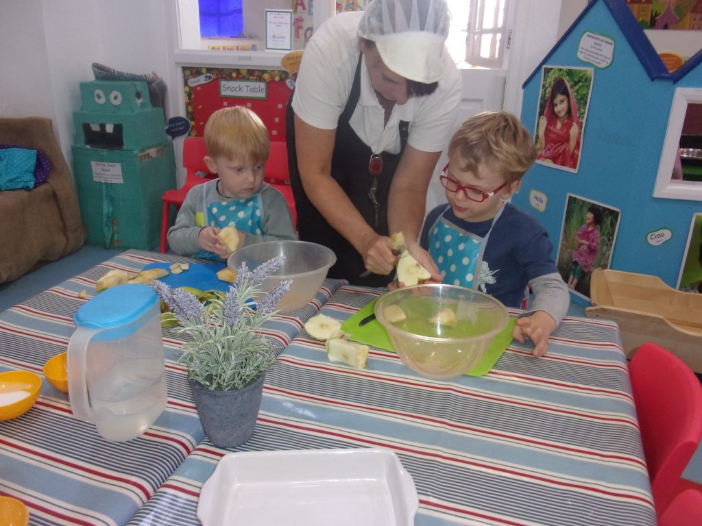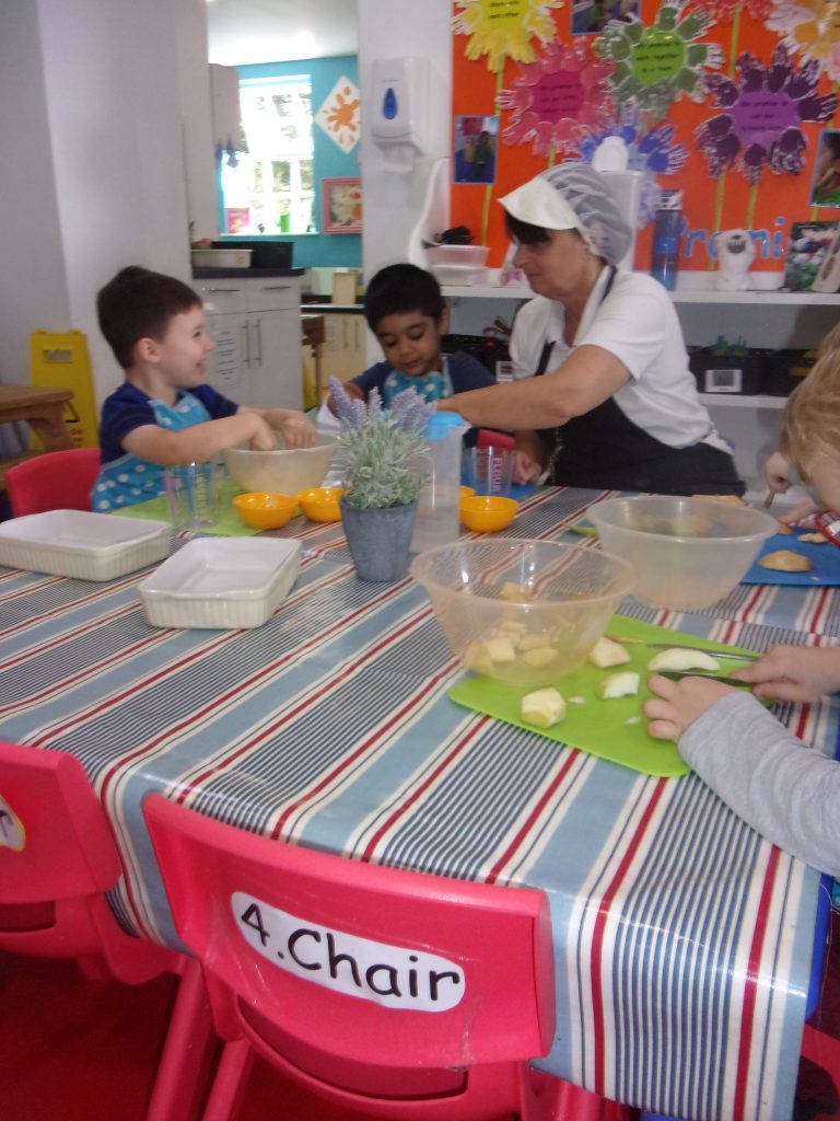 Miss Tina, our cook, provided a helping hand to teach children how to chop, peel and mix the ingredients together to make a delicious pudding. Our apples were home grown and kindly provided to us by a parent.