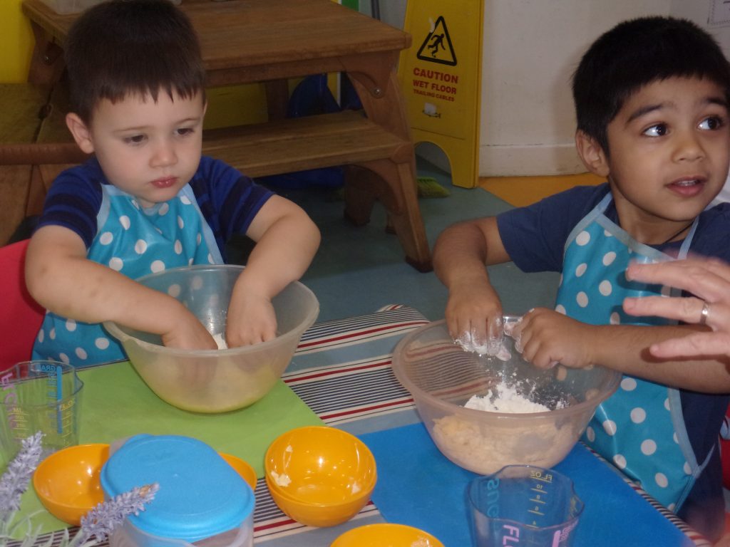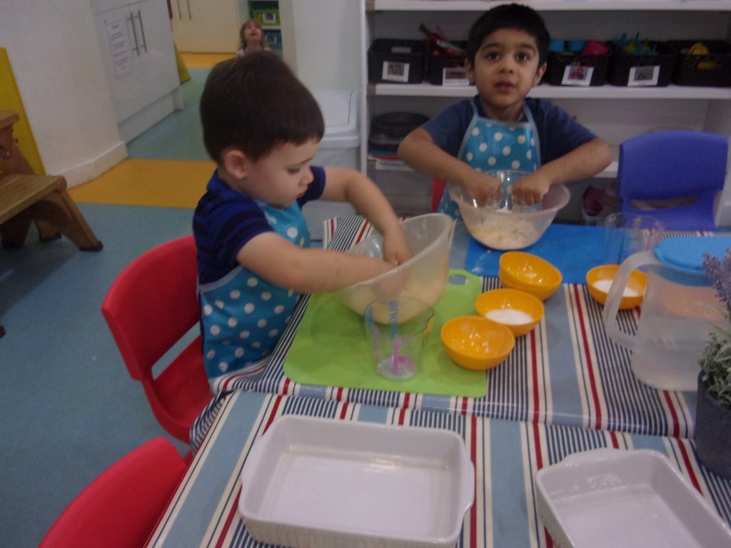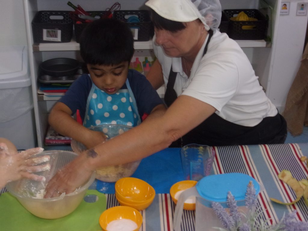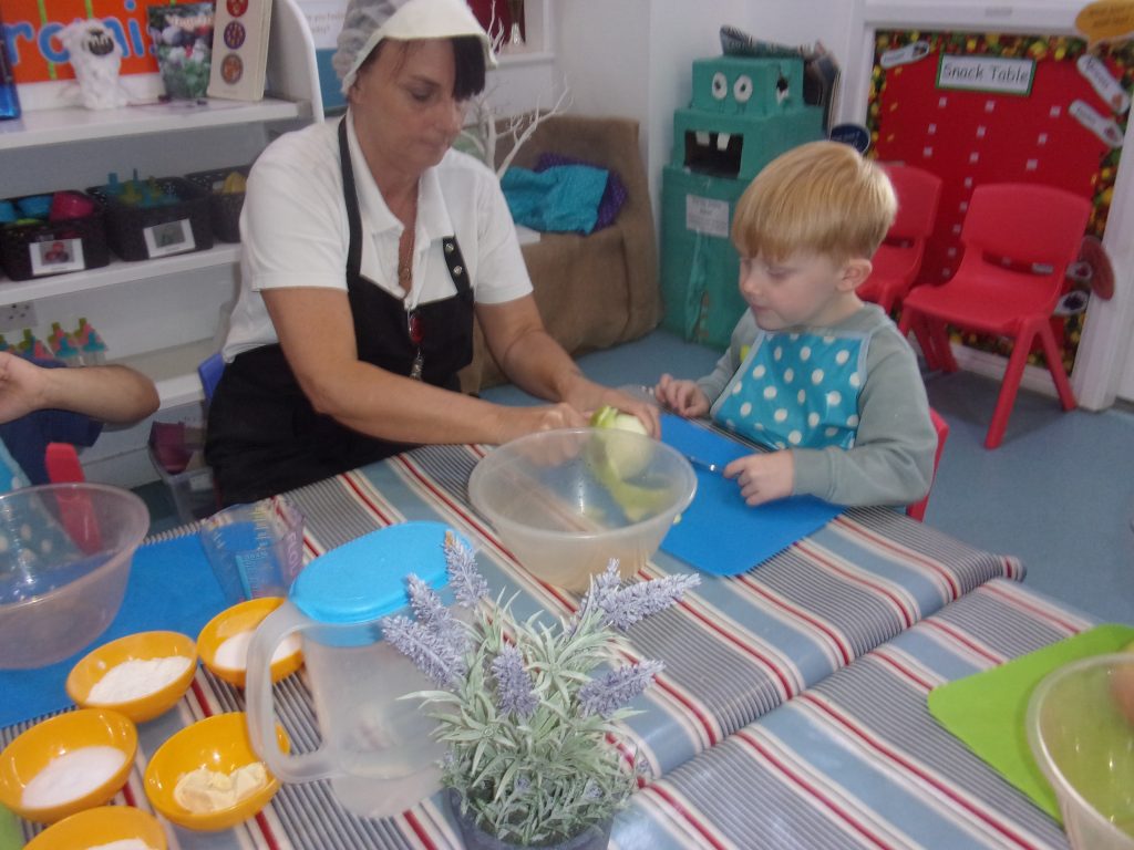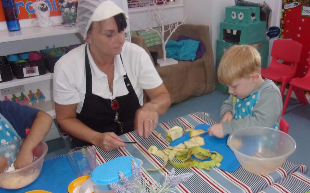 Miss Tina, our cook, provided a helping hand to teach children how to chop, peel and mix the ingredients together to make a delicious pudding. Our apples were home grown and kindly provided to us by a parent.