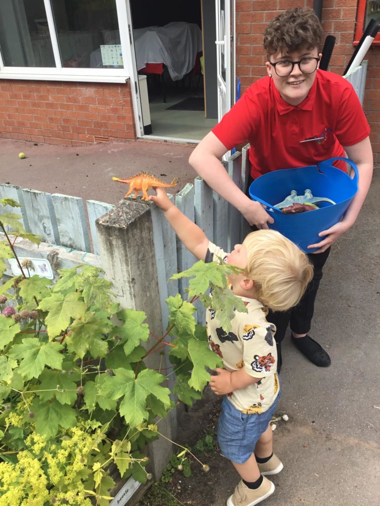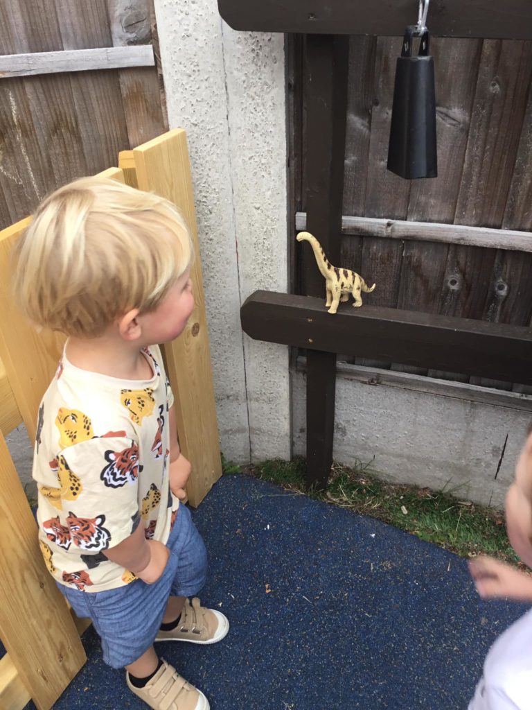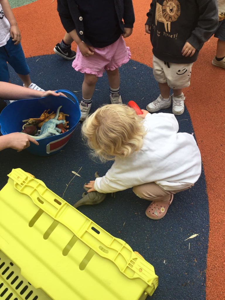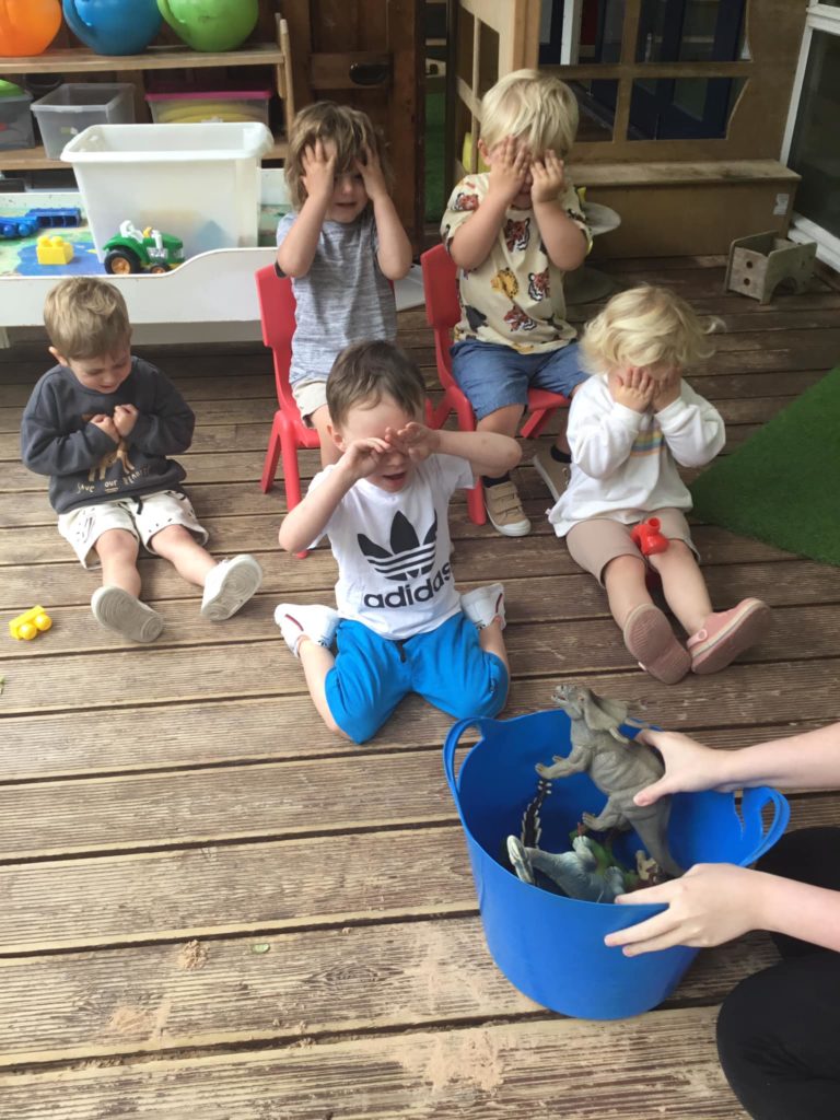 First of all, the children all sat and covered their eyes and counted to give the dinosaurs time to hide. Once they opened their eyes, they saw that all of the dinosaurs had run away and hidden. It was down to our expert dino hunters to find them. After a massive search the Peter Rabbits found all the pesky dinosaurs and managed to get them back into the bucket so that they were safe.