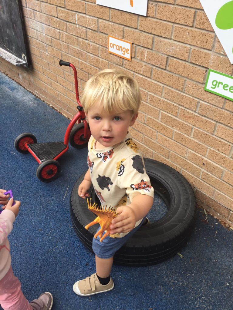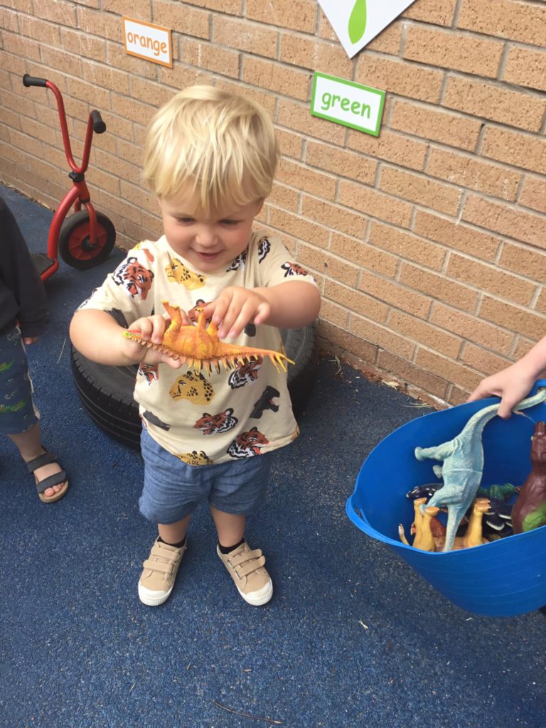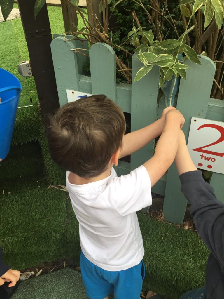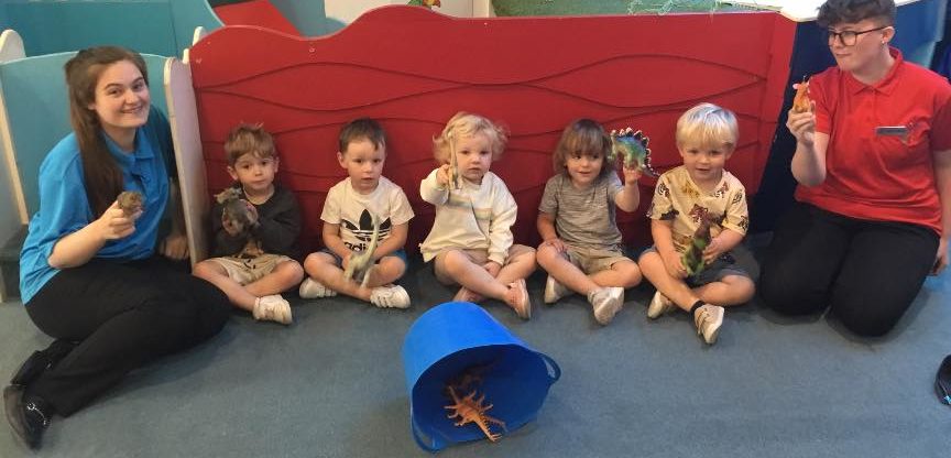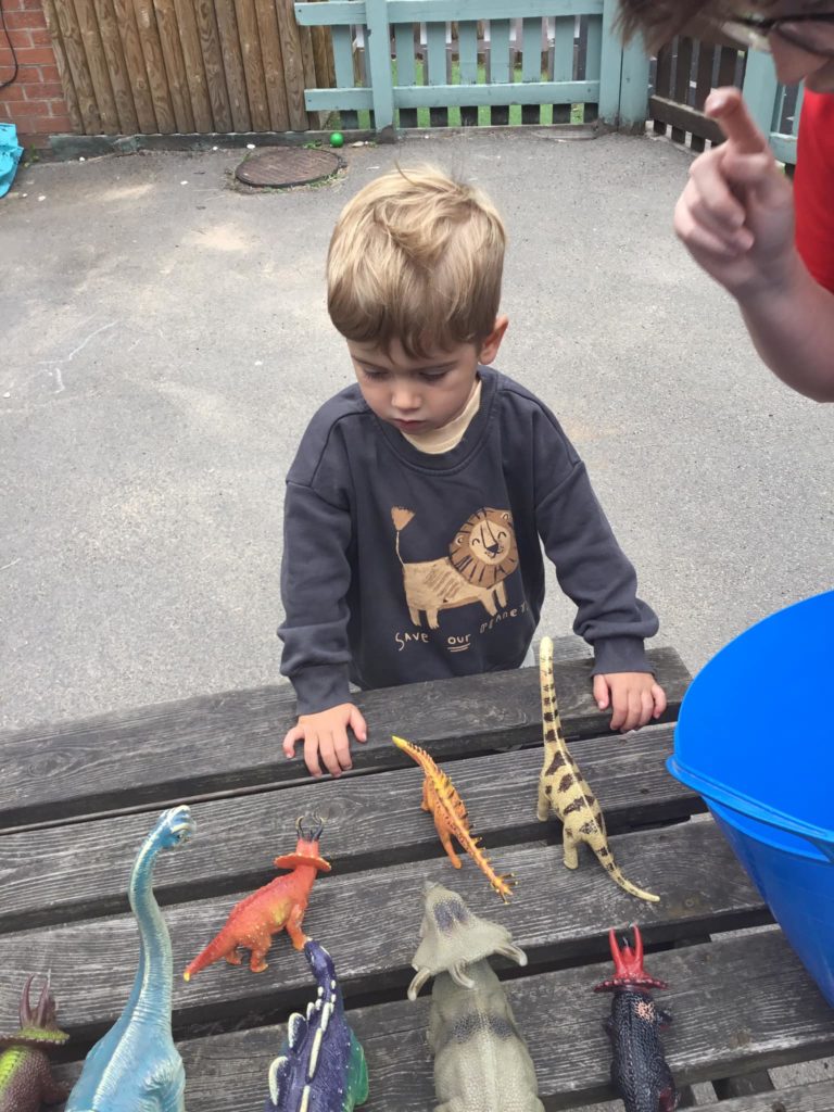 First of all, the children all sat and covered their eyes and counted to give the dinosaurs time to hide. Once they opened their eyes, they saw that all of the dinosaurs had run away and hidden. It was down to our expert dino hunters to find them. After a massive search the Peter Rabbits found all the pesky dinosaurs and managed to get them back into the bucket so that they were safe.