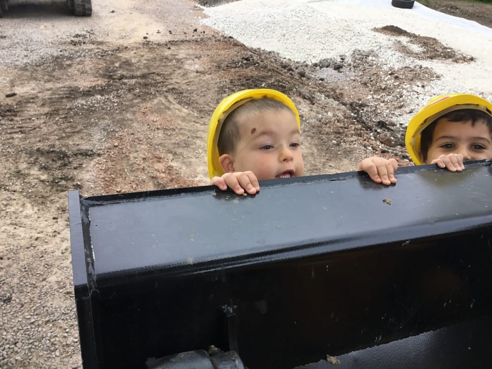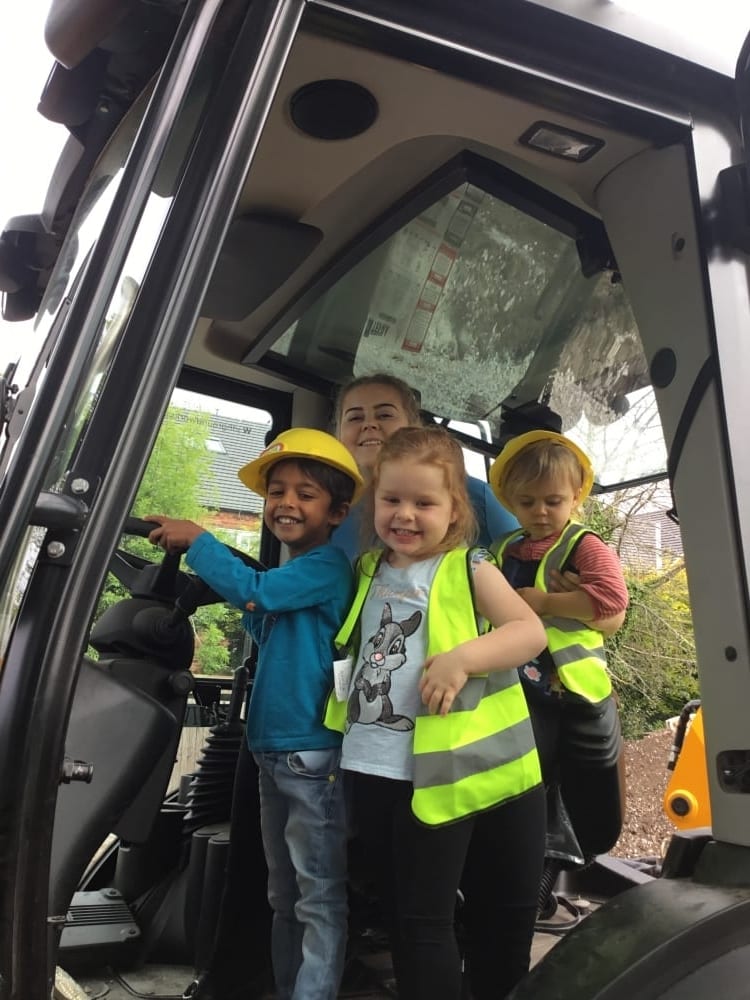 We got ready with our safety hats and high visibility jackets and made our way down to the garden. As we got closer the digger got bigger! The children climbed up and sat in the digger. It was so much fun looking at all the different buttons, the huge wheels and the enormous scoop!