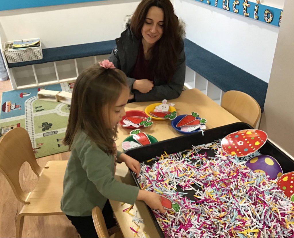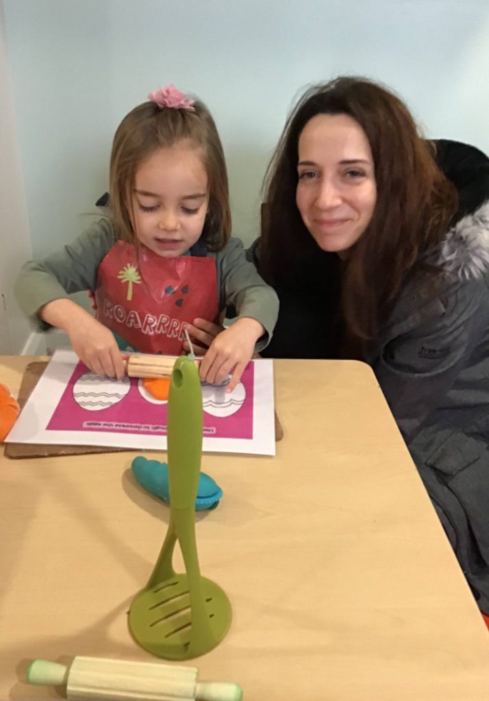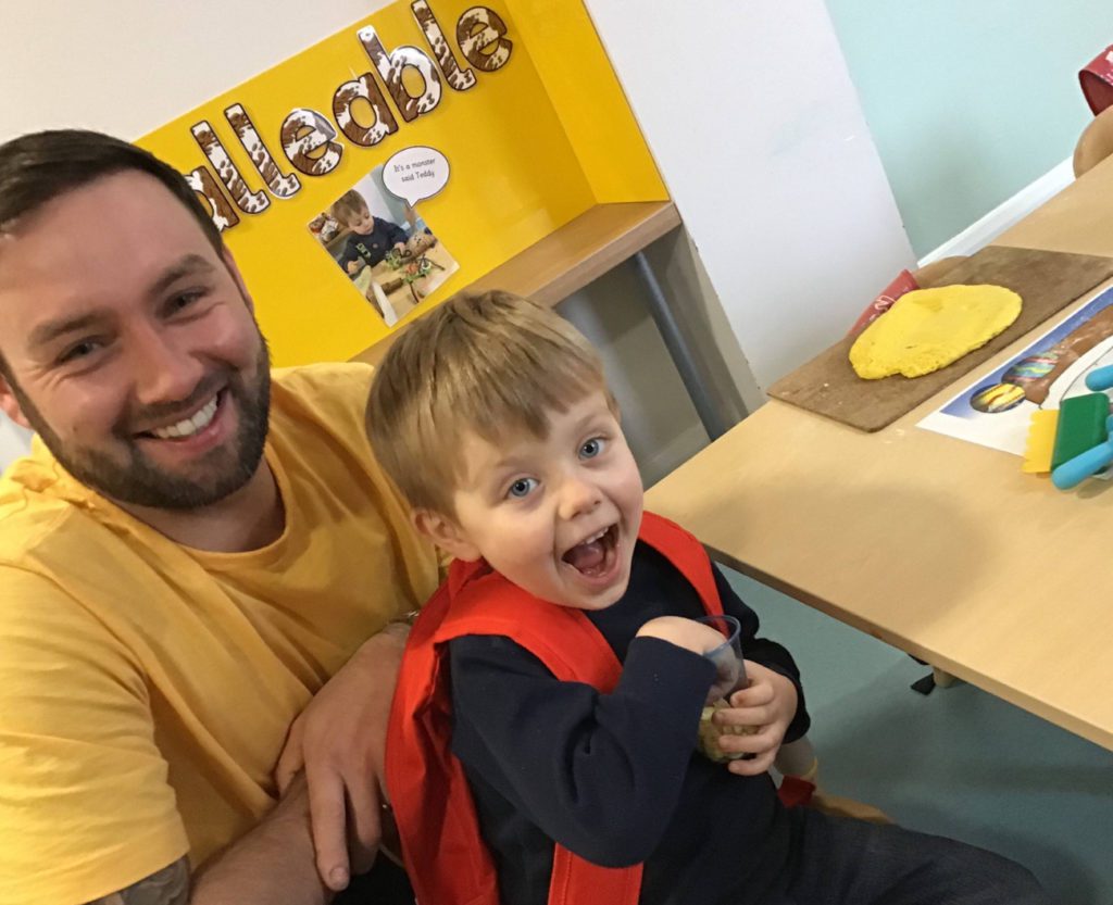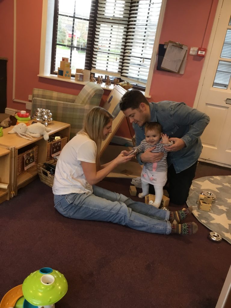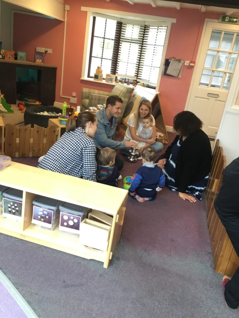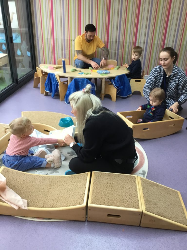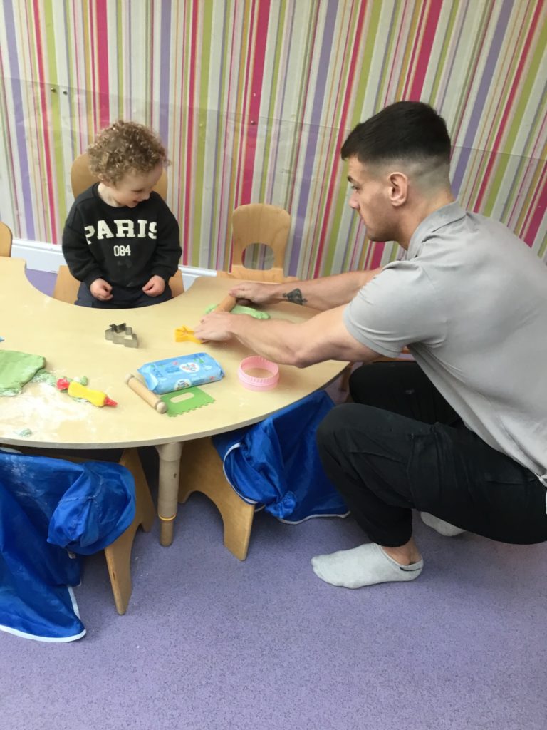 In Under 2’s the children and parents loved exploring the mint smelling play dough, rolling it out and using the cutters to make different shapes. The children also enjoyed exploring the Easter sensory tray and showing their parents the different toys at nursery such as the dolls, slide and musical ball run.