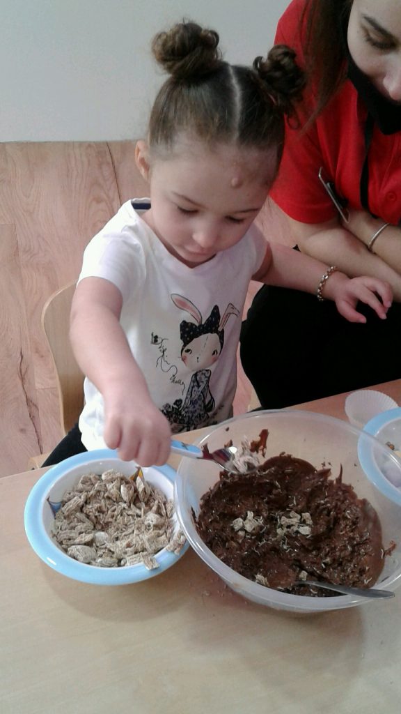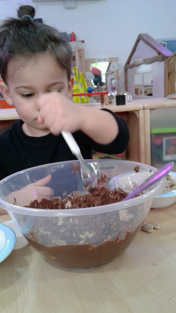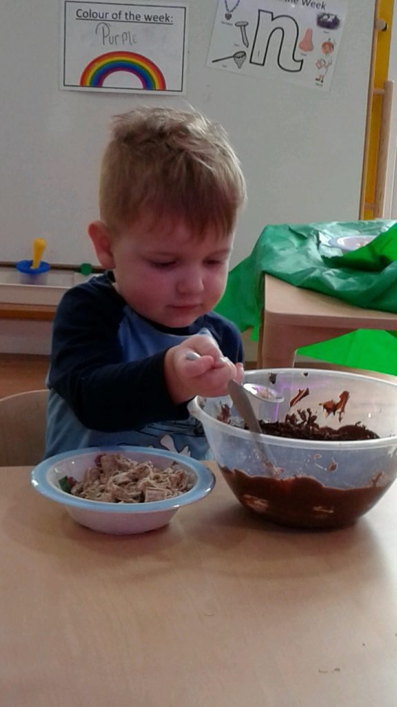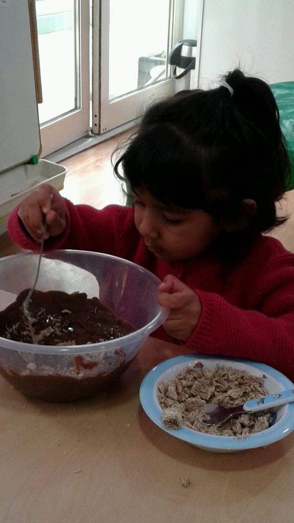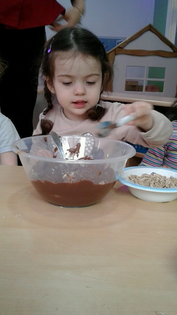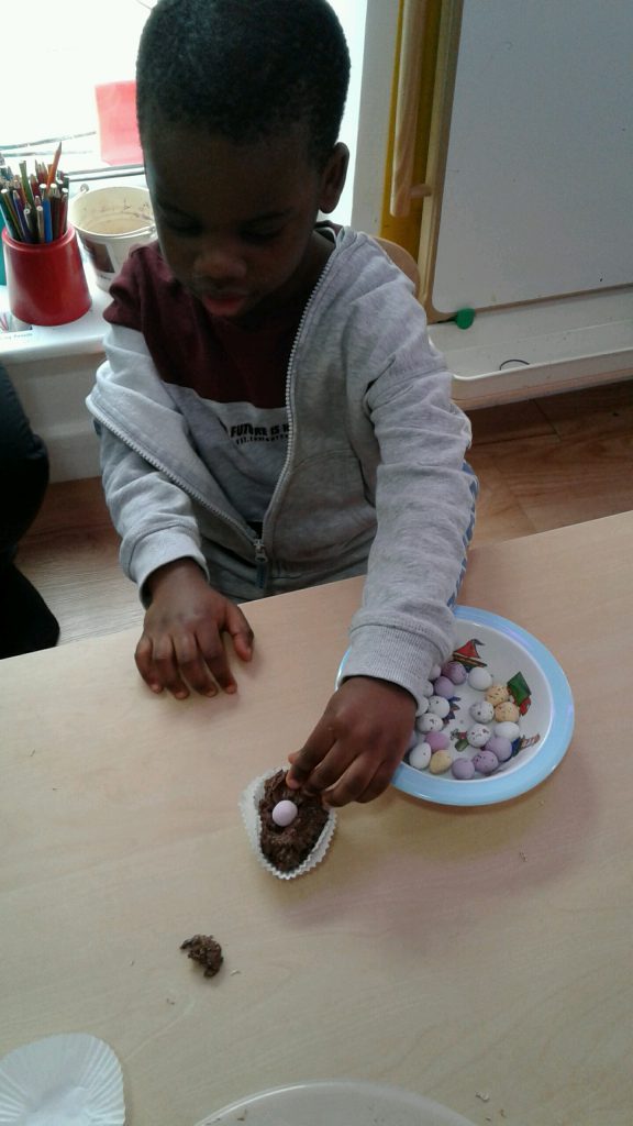 No Easter celebration would be complete without chocolate! Making our Easter nests required everyone to help out with the stirring and adding of breakfast cereal to the melted chocolate. Transferring the chocolate mixture to individual baking cases was a bit tricky but we managed it and then had the fun of adding chocolate mini eggs as decoration. The results were delicious.