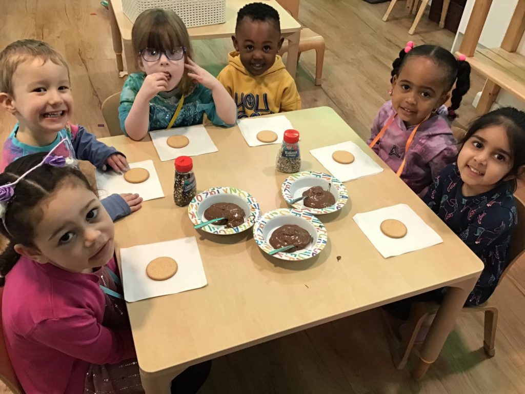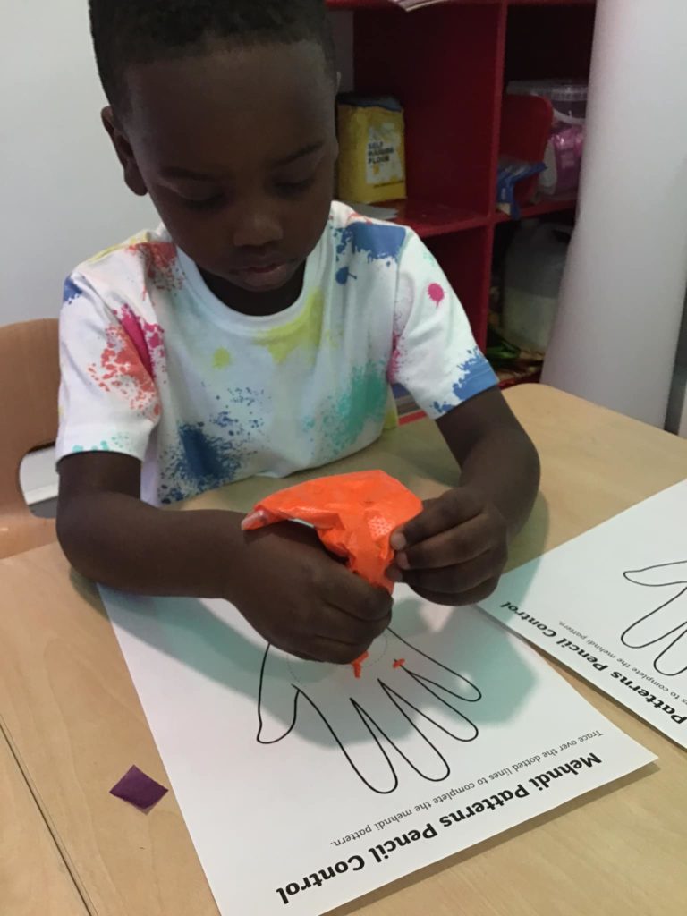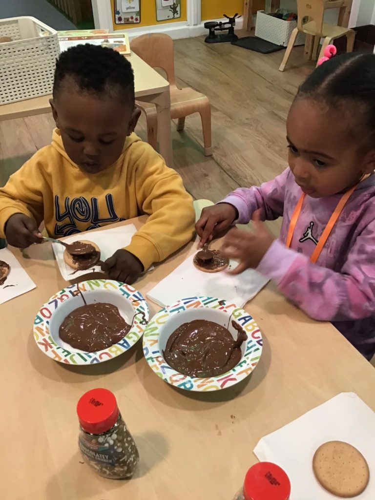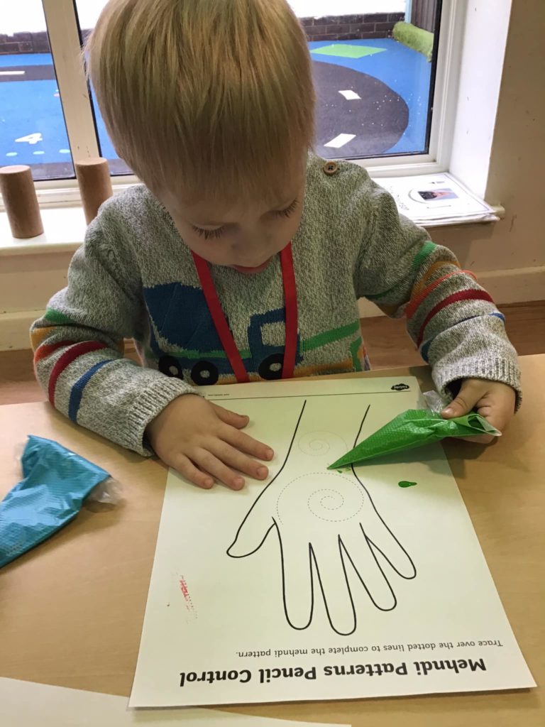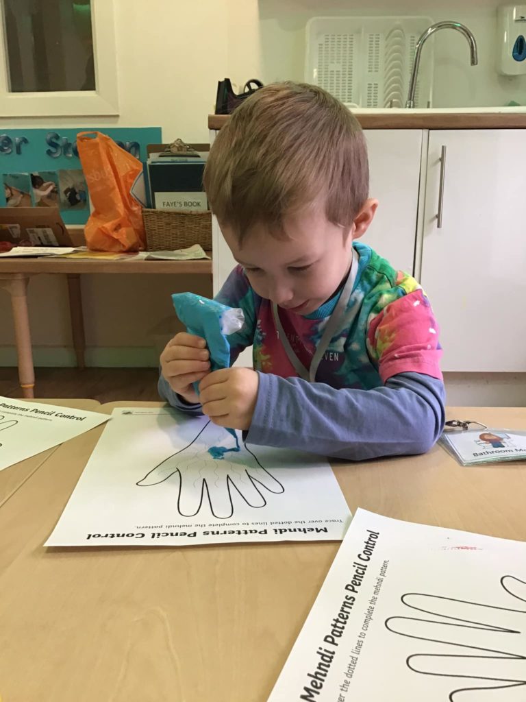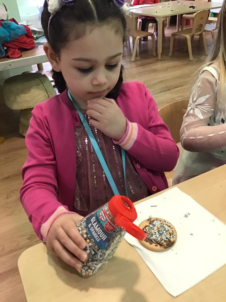 The Early Years children at Leicester loved having the traditional henna patterns drawn onto their hands and some has very creative ideas of what they wanted their pattern to look like. The children also had a go themselves of creating some colourful mendhi patterns. They had a tasty time icing some biscuits with chocolate and sprinkling lots of sprinkles before settling down to eat them.