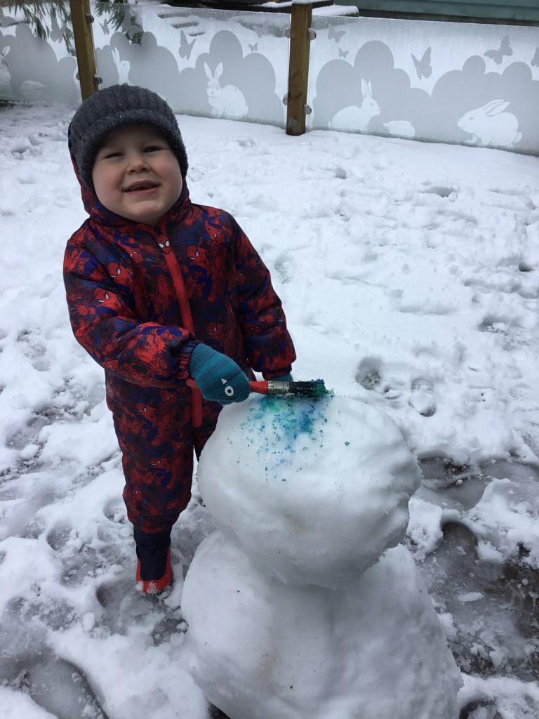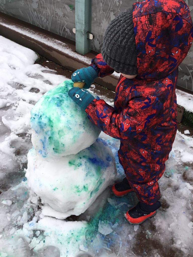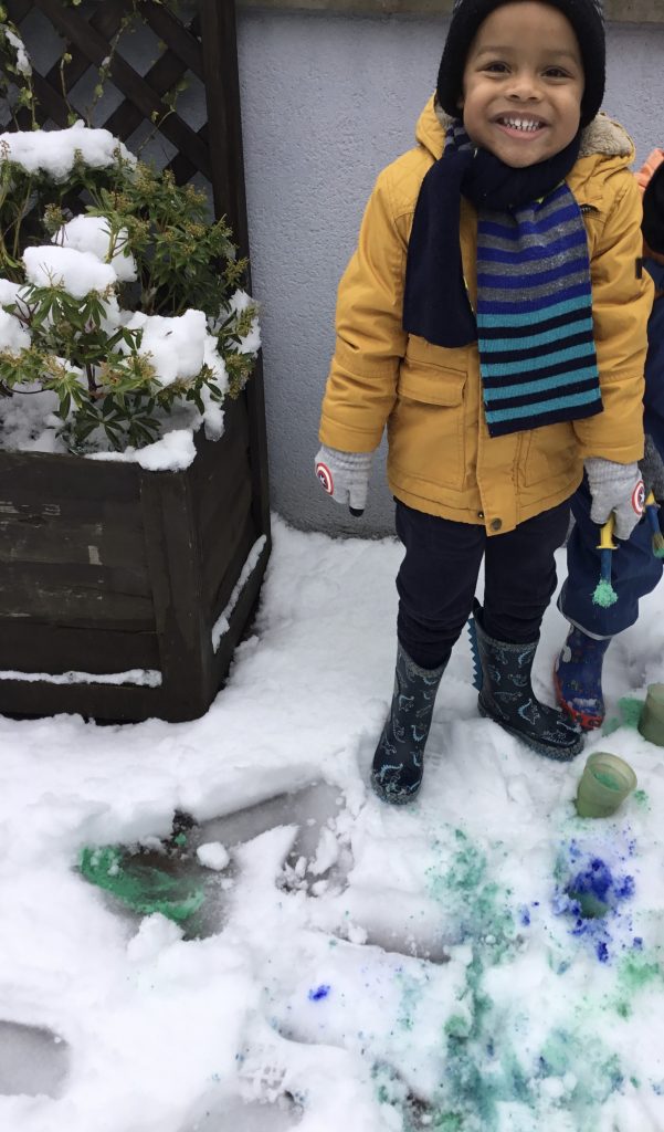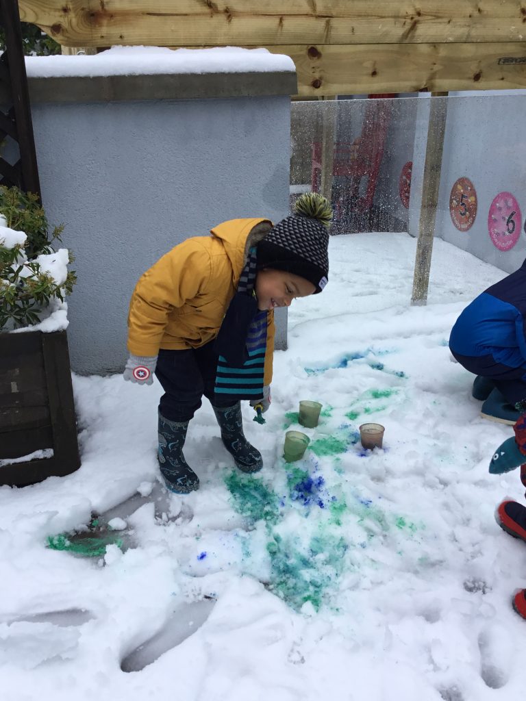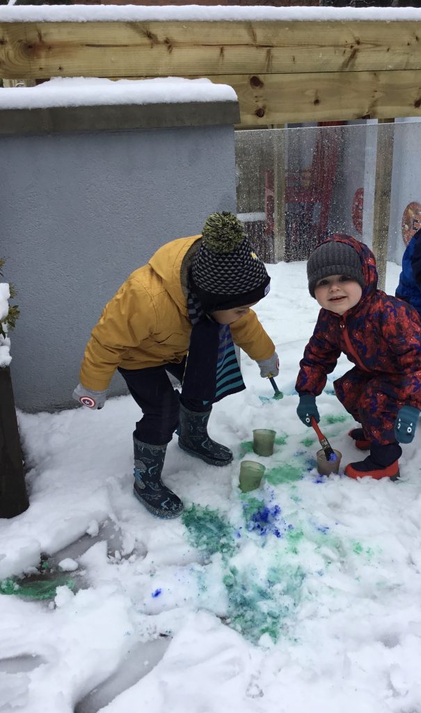 Early years have loved playing in the snow. We made the snow into magic rainbow snow and loved watching the paint dissolve and turn the snow into a rainbow.