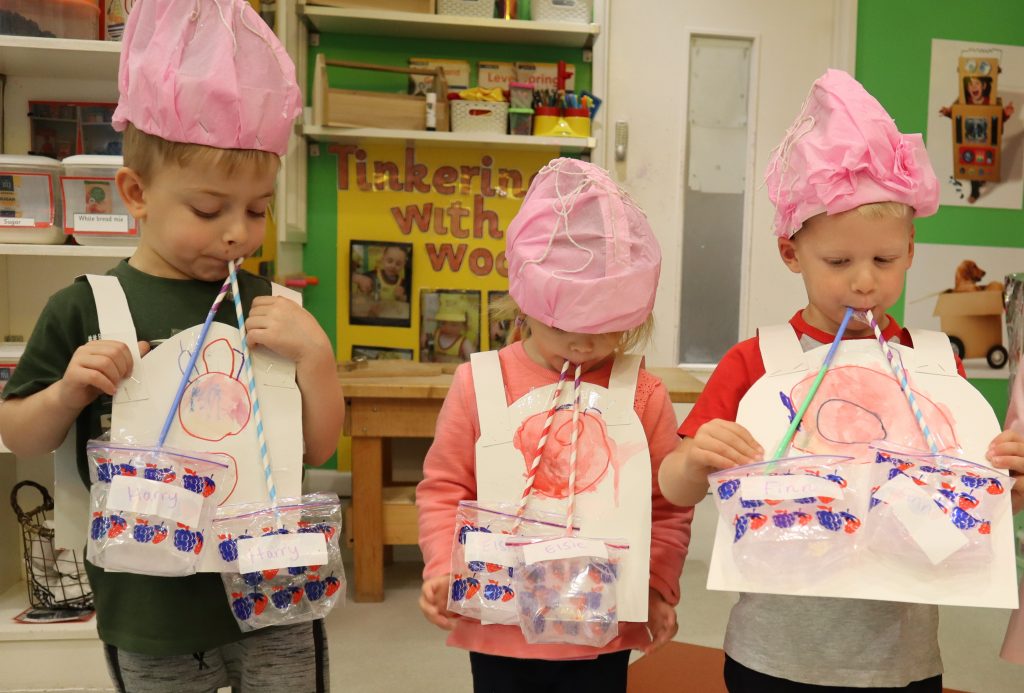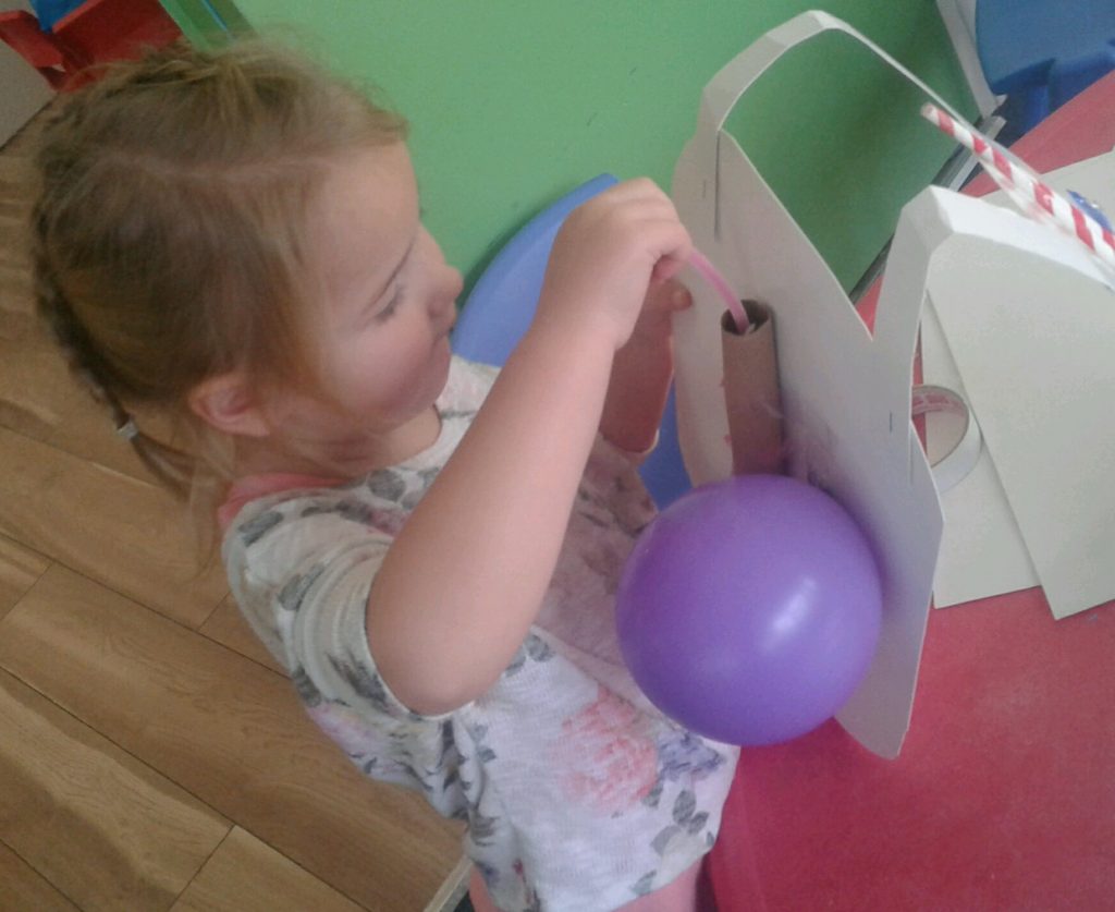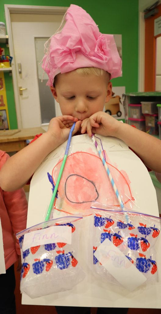 The children also learnt about their lungs and used two bags and straws to represent how the lungs work showing that when we inhale, air goes into our lungs and blows them up like balloons and when we iexhale the air is sucked out of our lungs and they deflate slightly. The children loved working their lungs using the air from their mouths to work them.