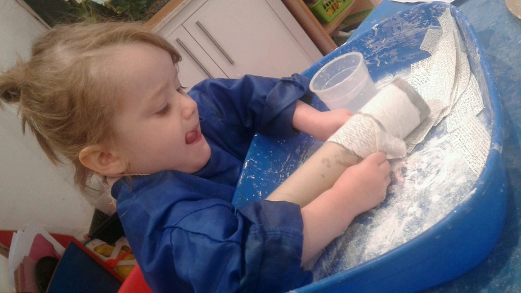 The children have also been learning about their bones and looking at X-rays of their bones. They have made x-ray pictures using white paint and printing their hands and arms onto the black paper. Once dried the children used the X-ray pictures as a guide to where to stick on match stick bones onto their hand outline prints. They also learnt about what happens if we have a broken bone and the process of ‘casting’. We used our own casting bandages on tubes (which we pretended were our poorly arms) and wrapped them up in casting bandages. Once the cast had set the children enjoyed decorating them with pens.