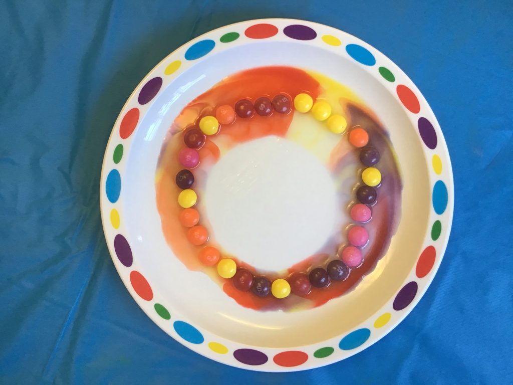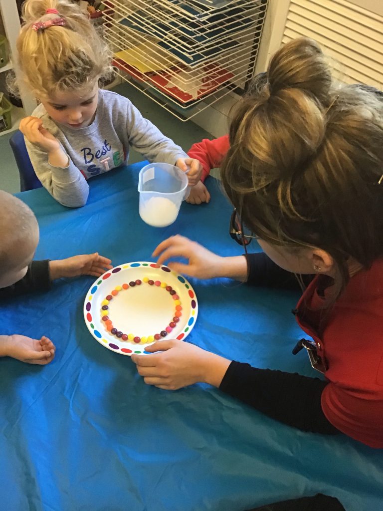 The Skittle experiment saw the children watching closely as the water dropped on the sweets to create a rainbow. Isaac was impressed saying, “Wow! It’s a rainbow!”