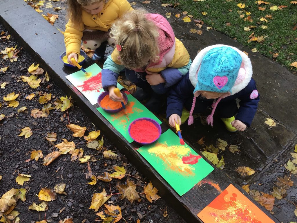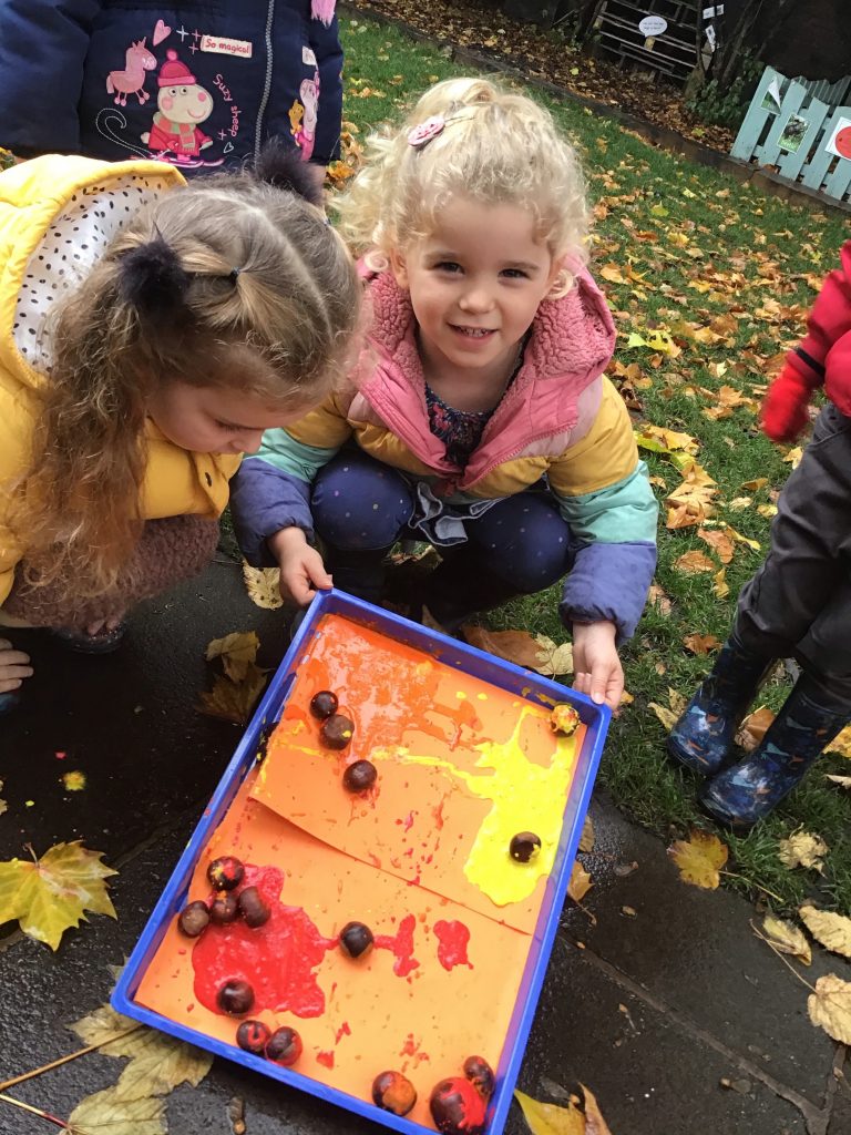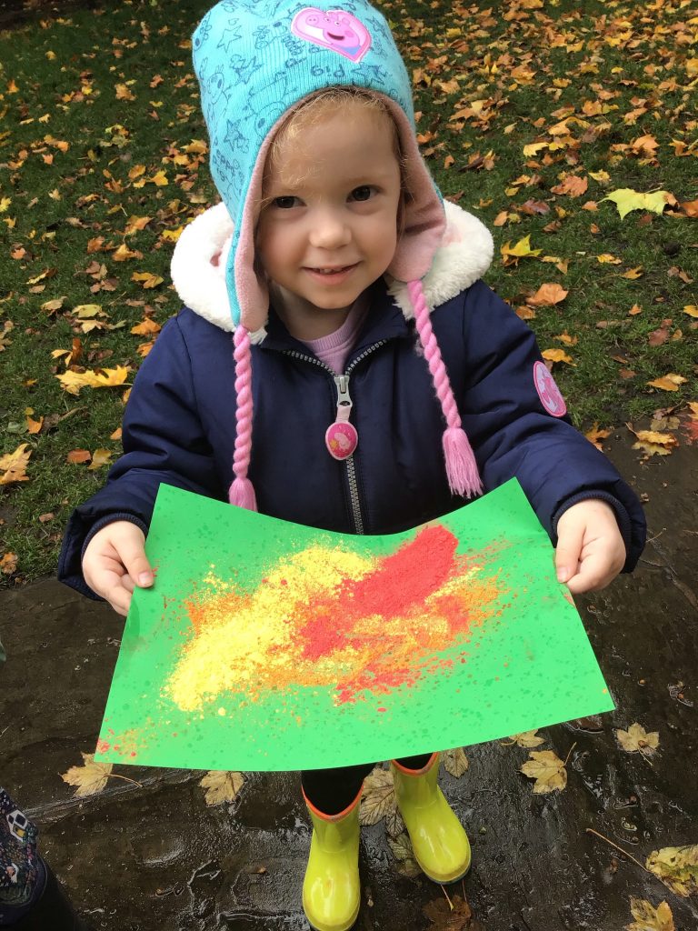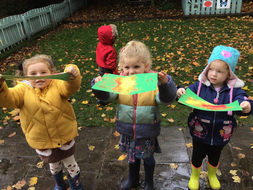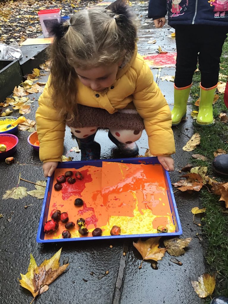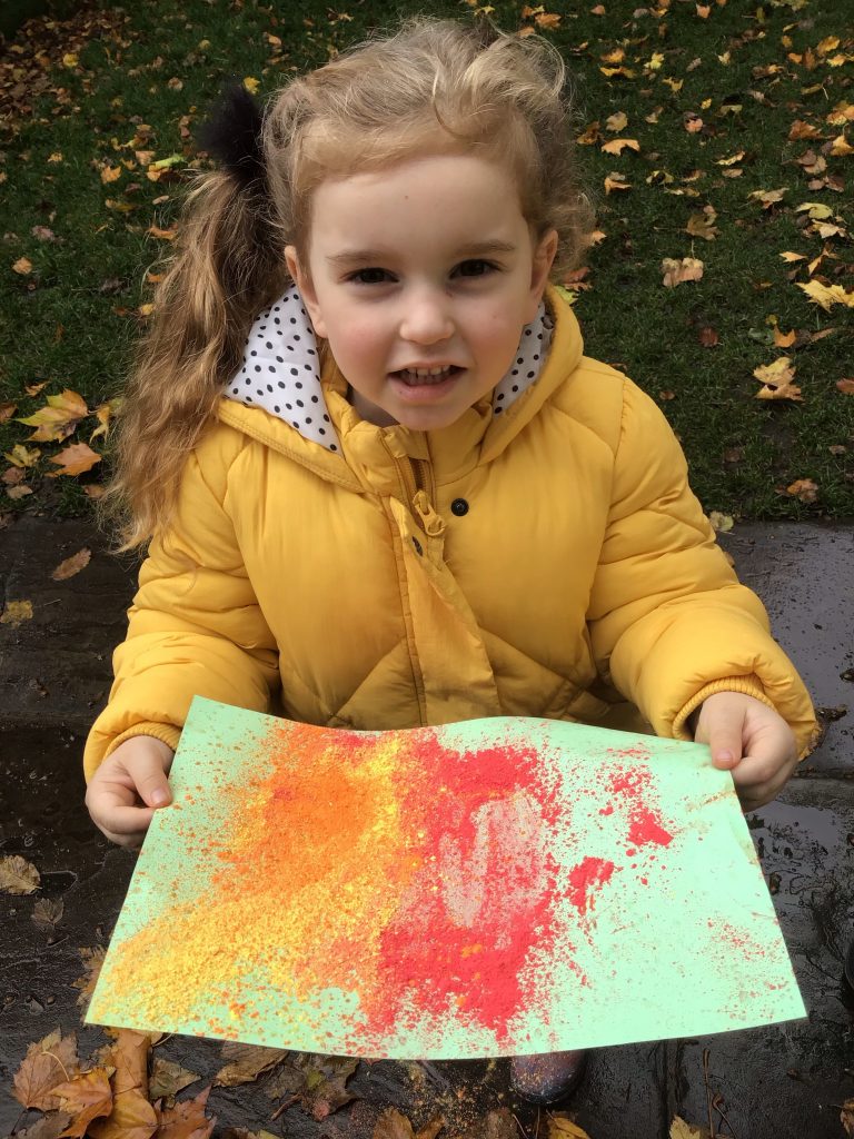 Science Week also linked with our Autumn topic. Alicia was delighted to see how the raindrops changed her painting saying, “The colours make the same colours as the Autumn leaves.”