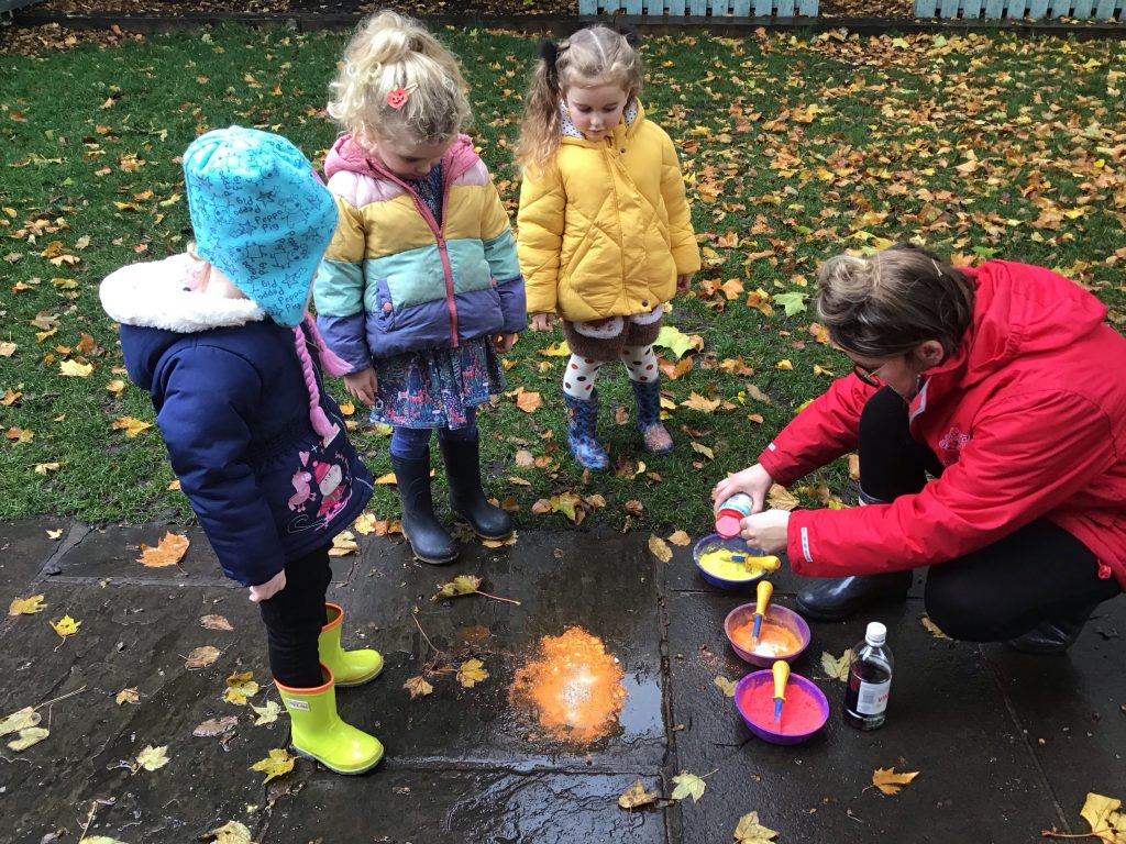 The children were keen to observe how the colours behaved when they were wet and how the raindrops made such pretty patterns as the colours merged.