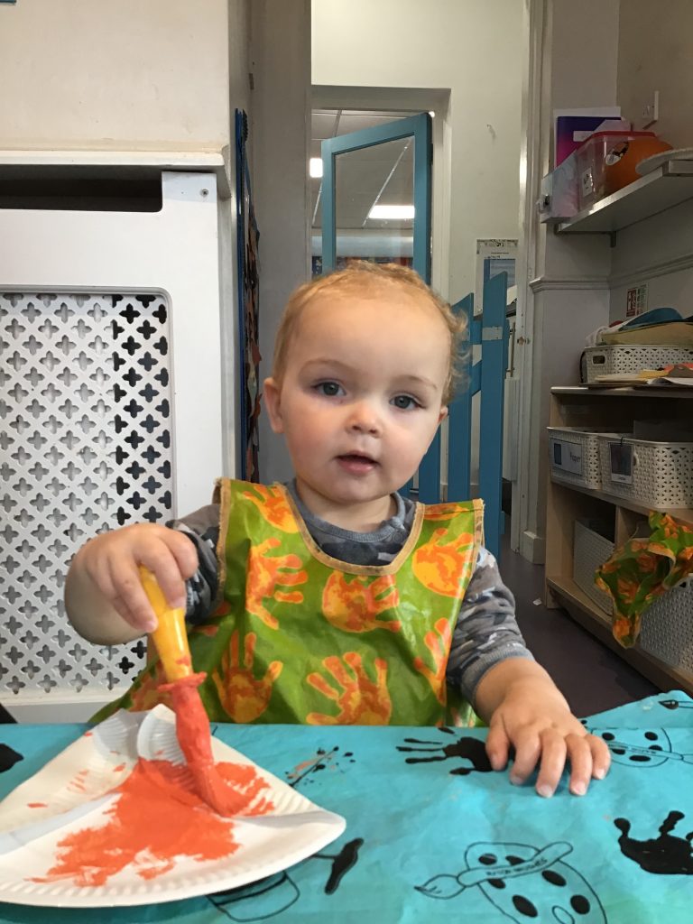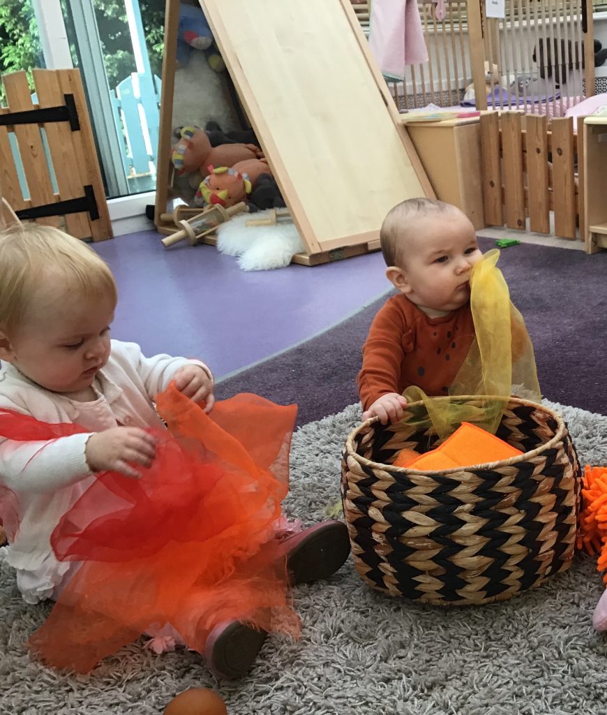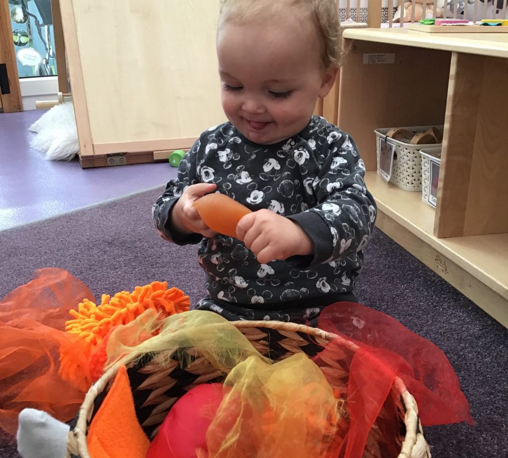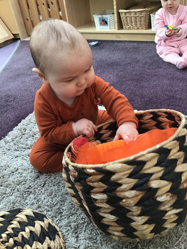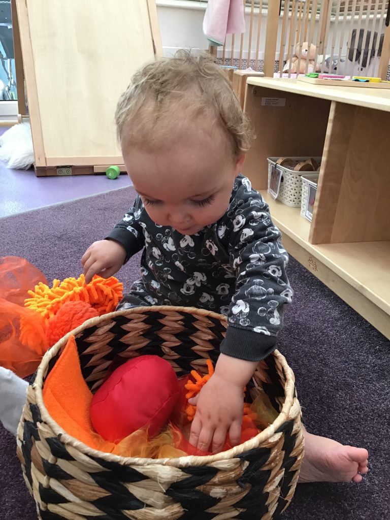 They’ve loved discovering the contents of their Autumn treasure baskets, looking at the colours and shapes, feeling the textures and shaking the items to find out all about them. It’s always lovely to see how the little ones focus on each item with a sense of wonder.