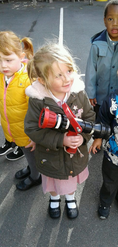 The shiny red fire engine was a huge hit and even though the children could not sit in the cab because of Covid safety measures, they were excited to see and hear about all the equipment carried on the machine.  After listening to the loud siren Zahira said,”It says nee naw, nee naw!” Theo loved the warning lights. “It has blue and red flashy lights!”