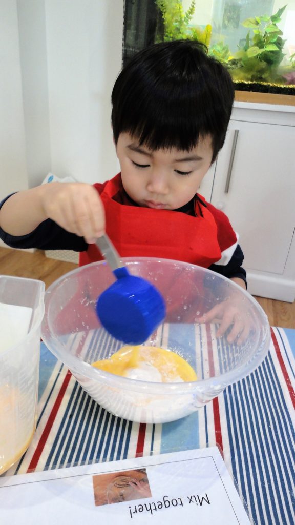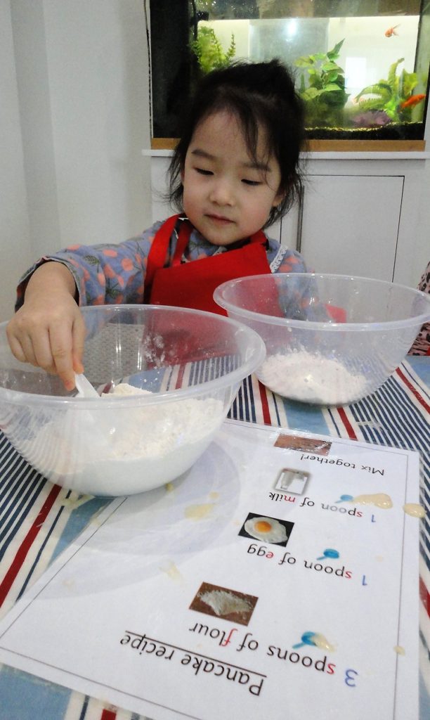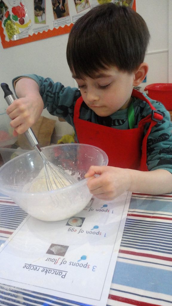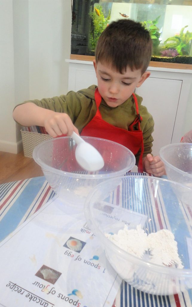 The Early Years children have also followed instructions to make their own pancake mixture. Once the pancake mixture was made the children delivered it to Mr George in the kitchen, who used it to make pancakes for tea!