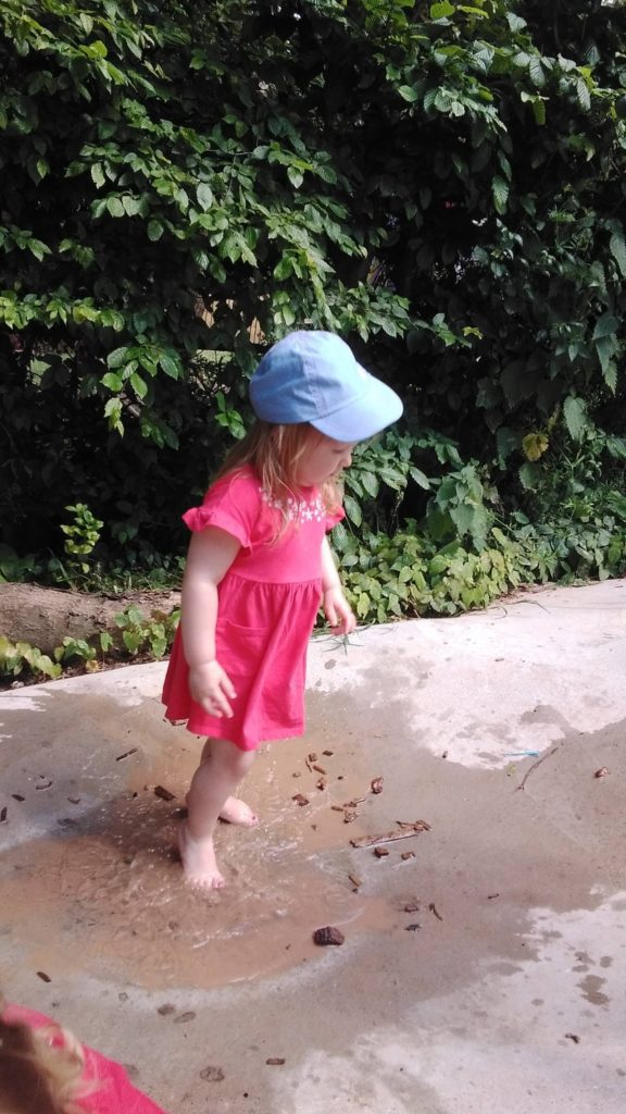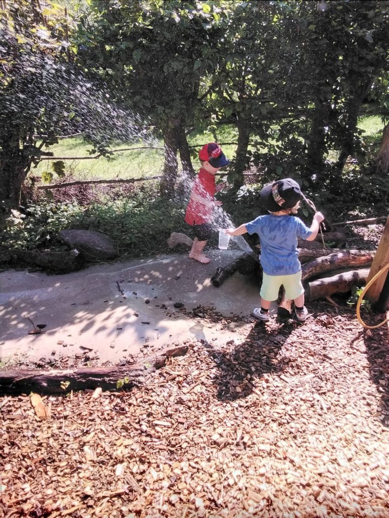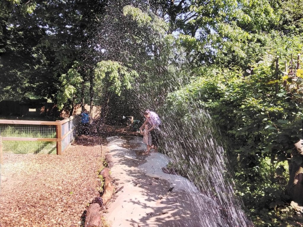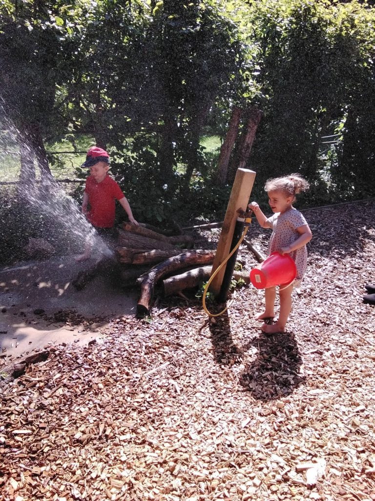 Exploring the forest in the sunshine gave the Benjamin Bunnies some different experiences, such as playing barefoot, jumping and splashing in the stream and feeling the running water with their hands and feet! They also enjoyed running through the spraying water to help cool down in the sunshine.