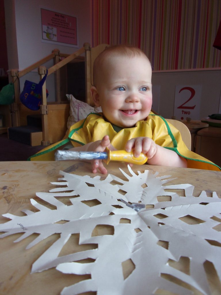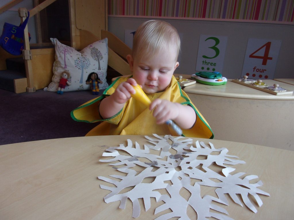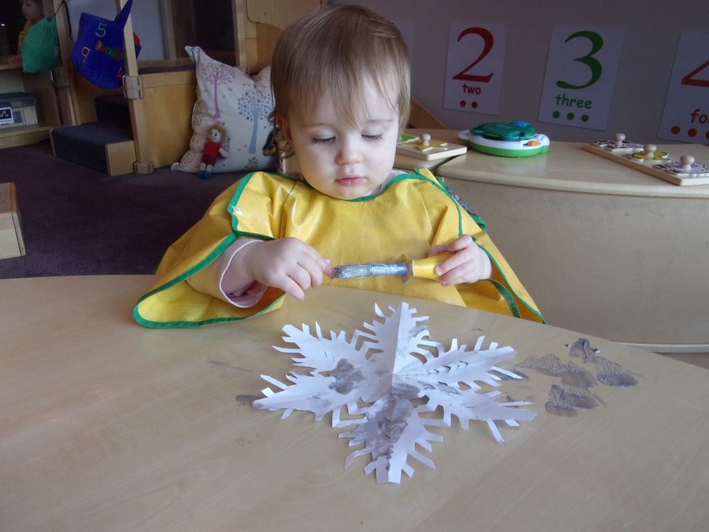 The Bobtails at Toton were just as keen to play in the snow and had great fun as they stomped about and scooped up the cold snow. Jemima Puddleducks were busy inside helping to make huge glittery snowflakes to hang up in nursery too!