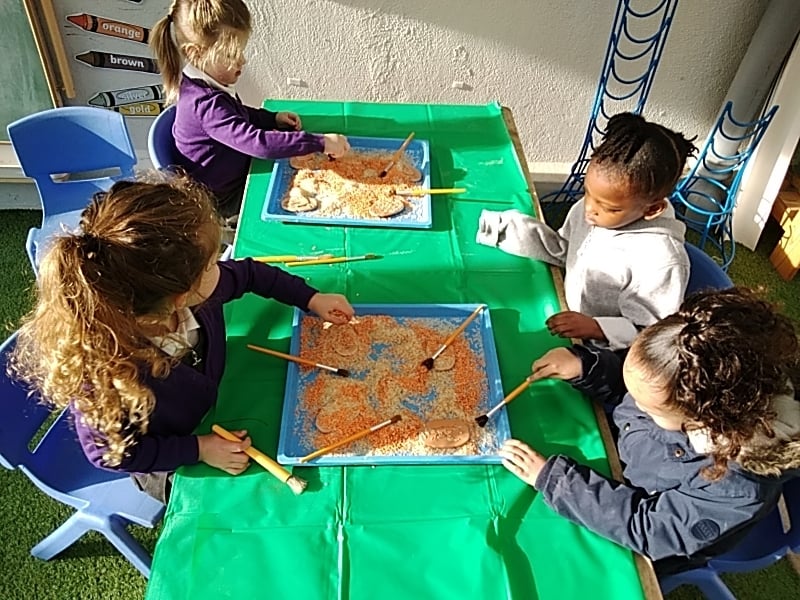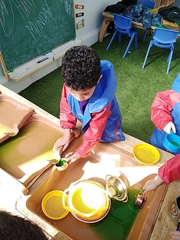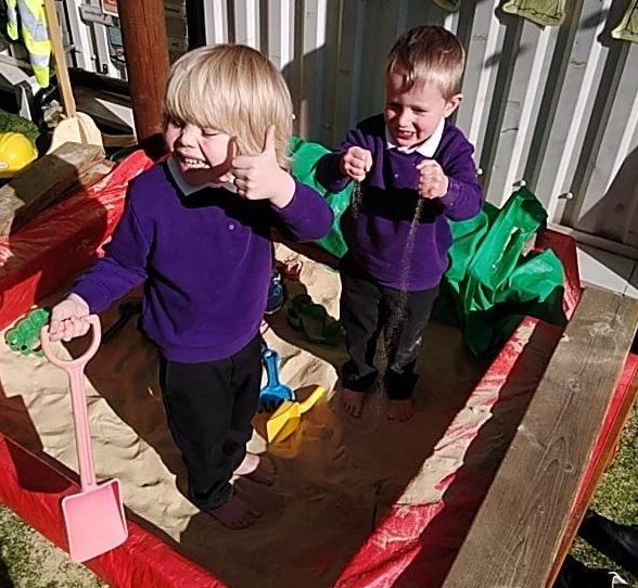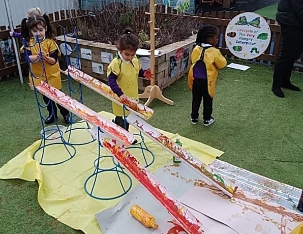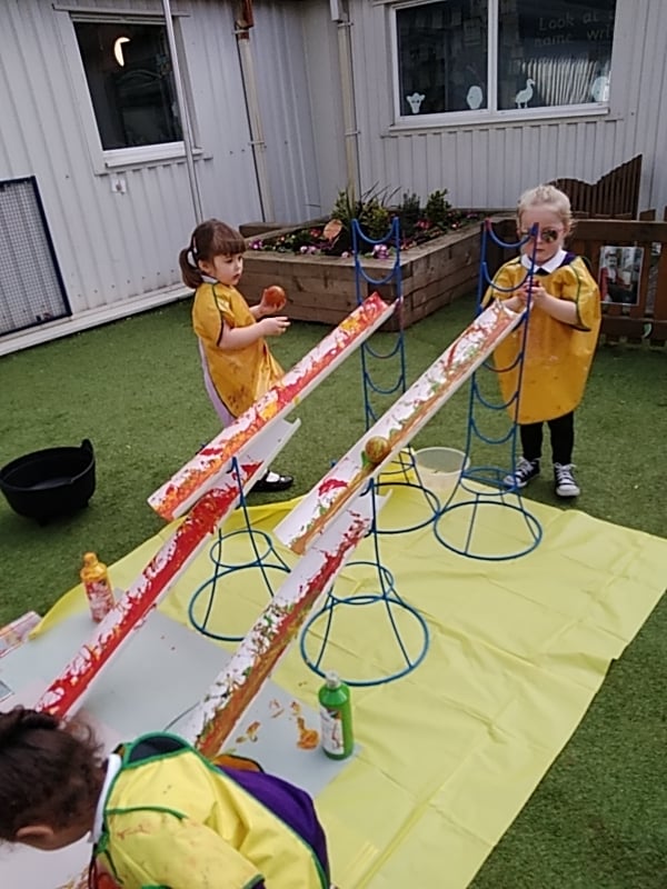 Elsewhere, they worked as a team to create a giant sand pit for them to explore with a range of senses, feeling the sand between their toes. They delighted at playing in scented water and created huge paintings using a ball to make marks.