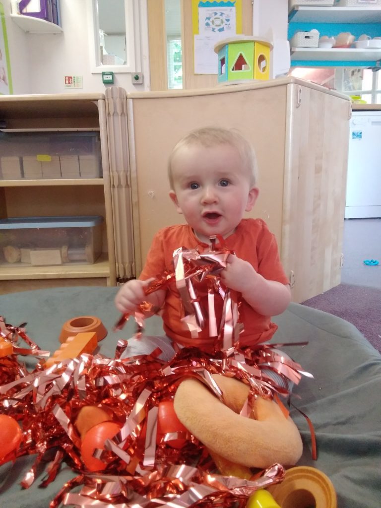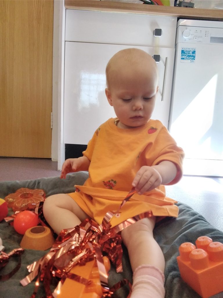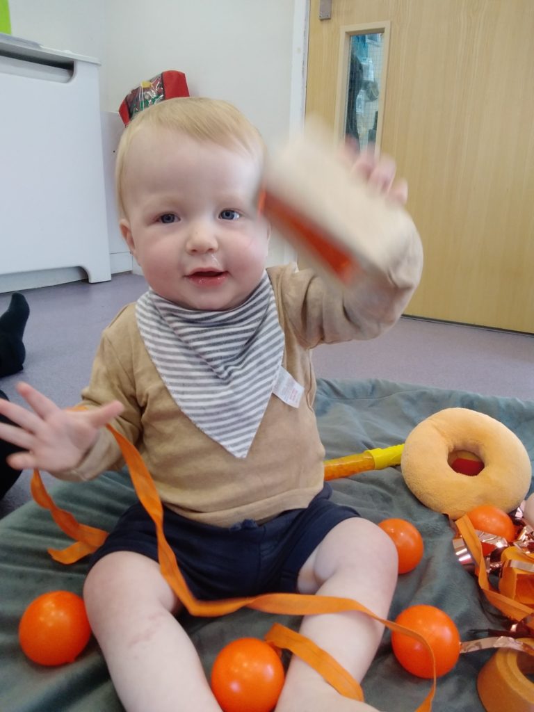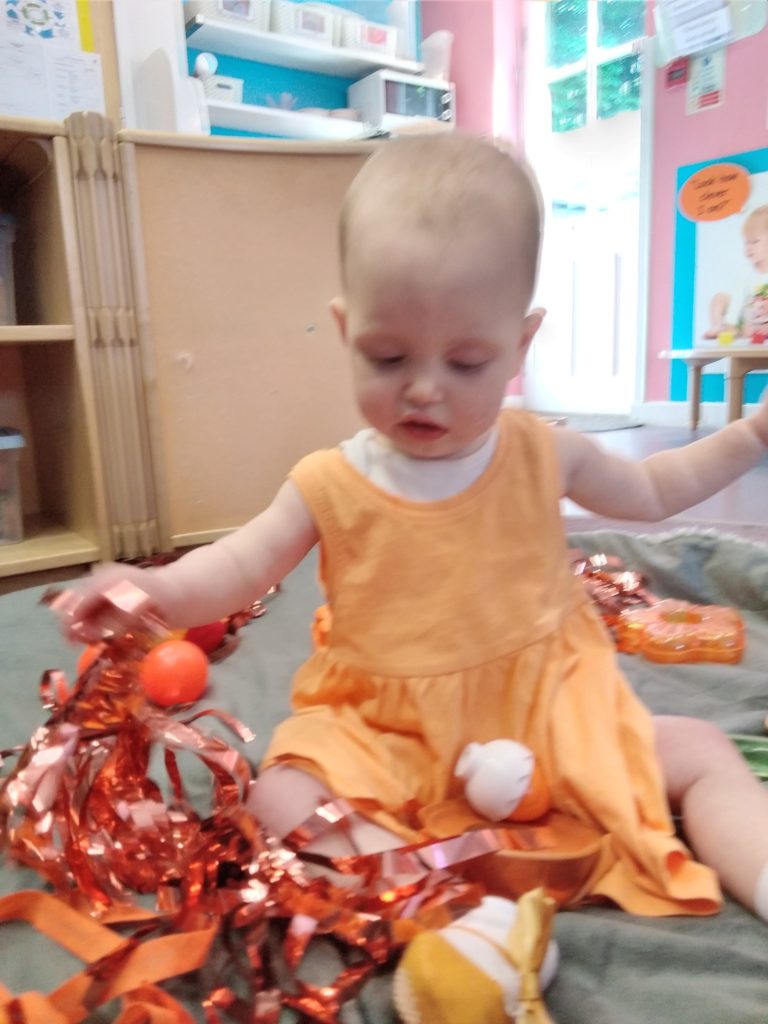 The babies explored lots of orange objects whilst the toddlers played with orange balls in the sand and used orange paint to create wonderful pictures.