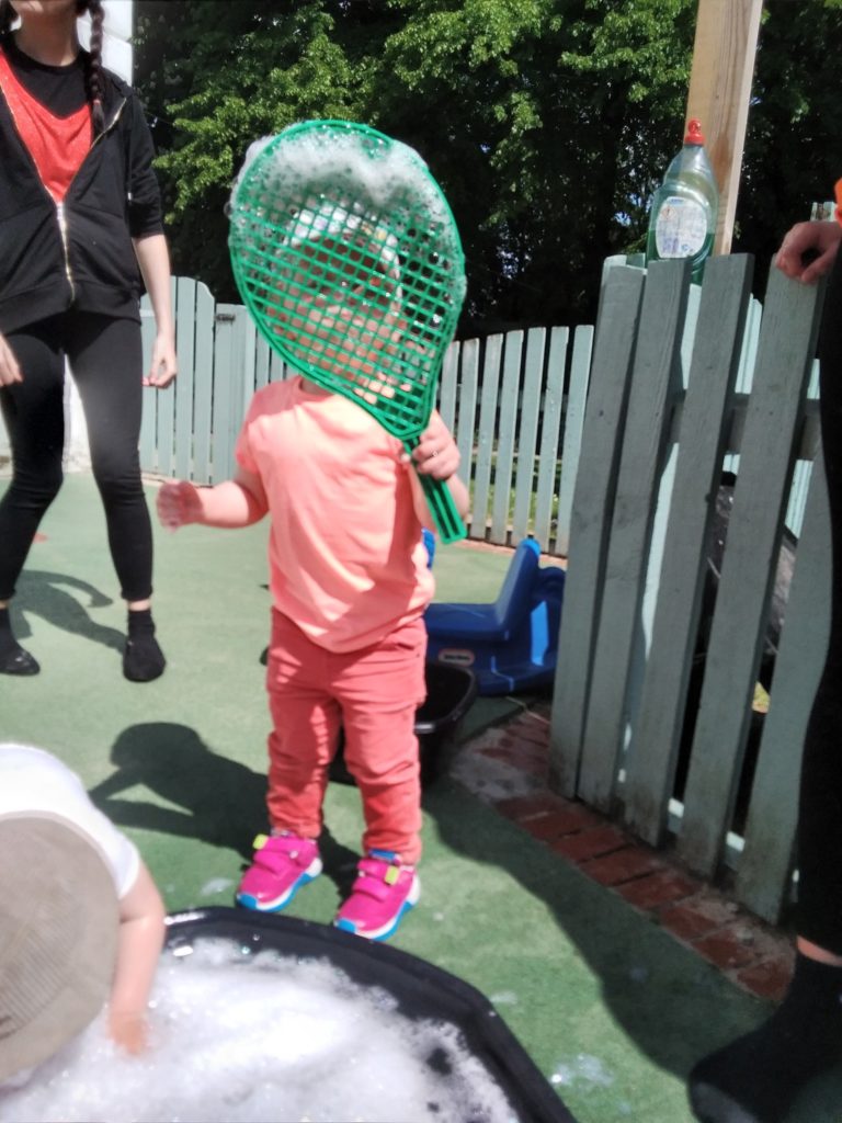 We then used the rackets to make lots of little bubbles. There were so many bubbles to run after and pop. All ages had so much fun with this!
